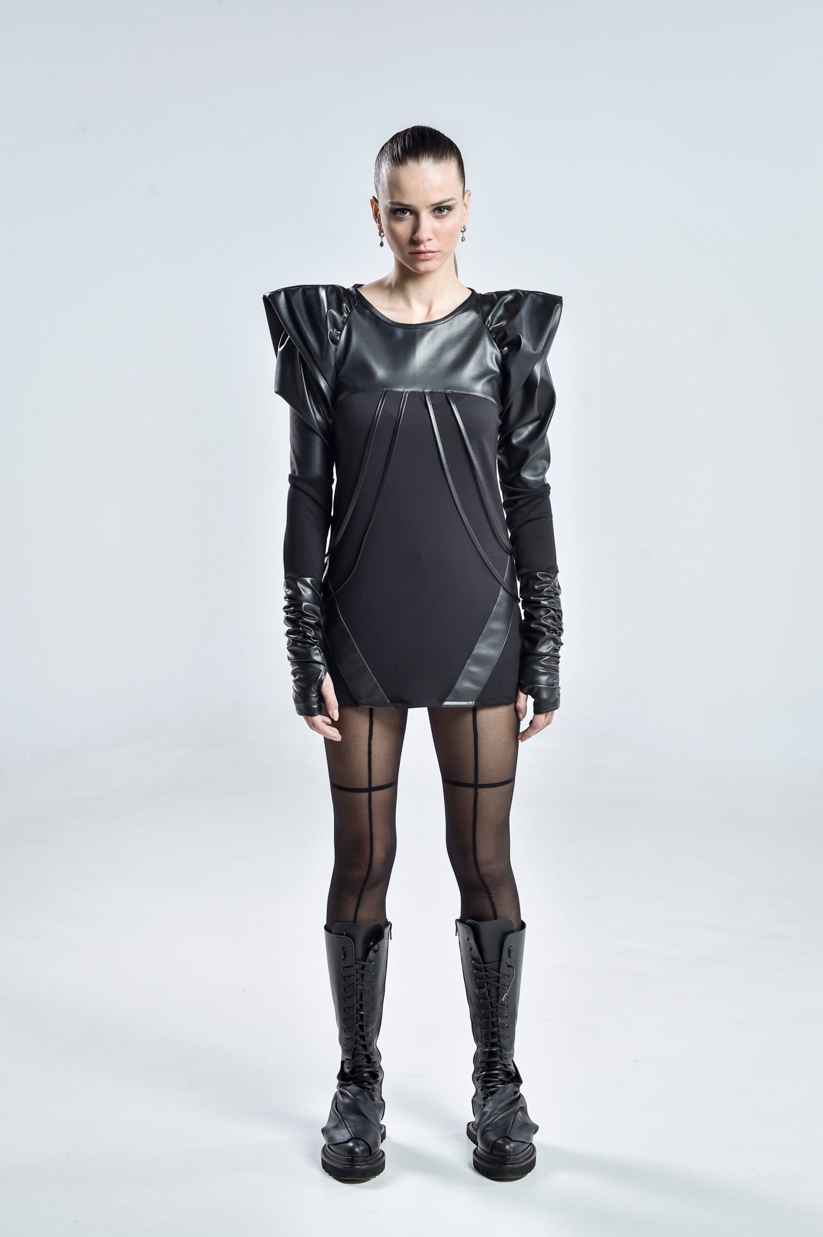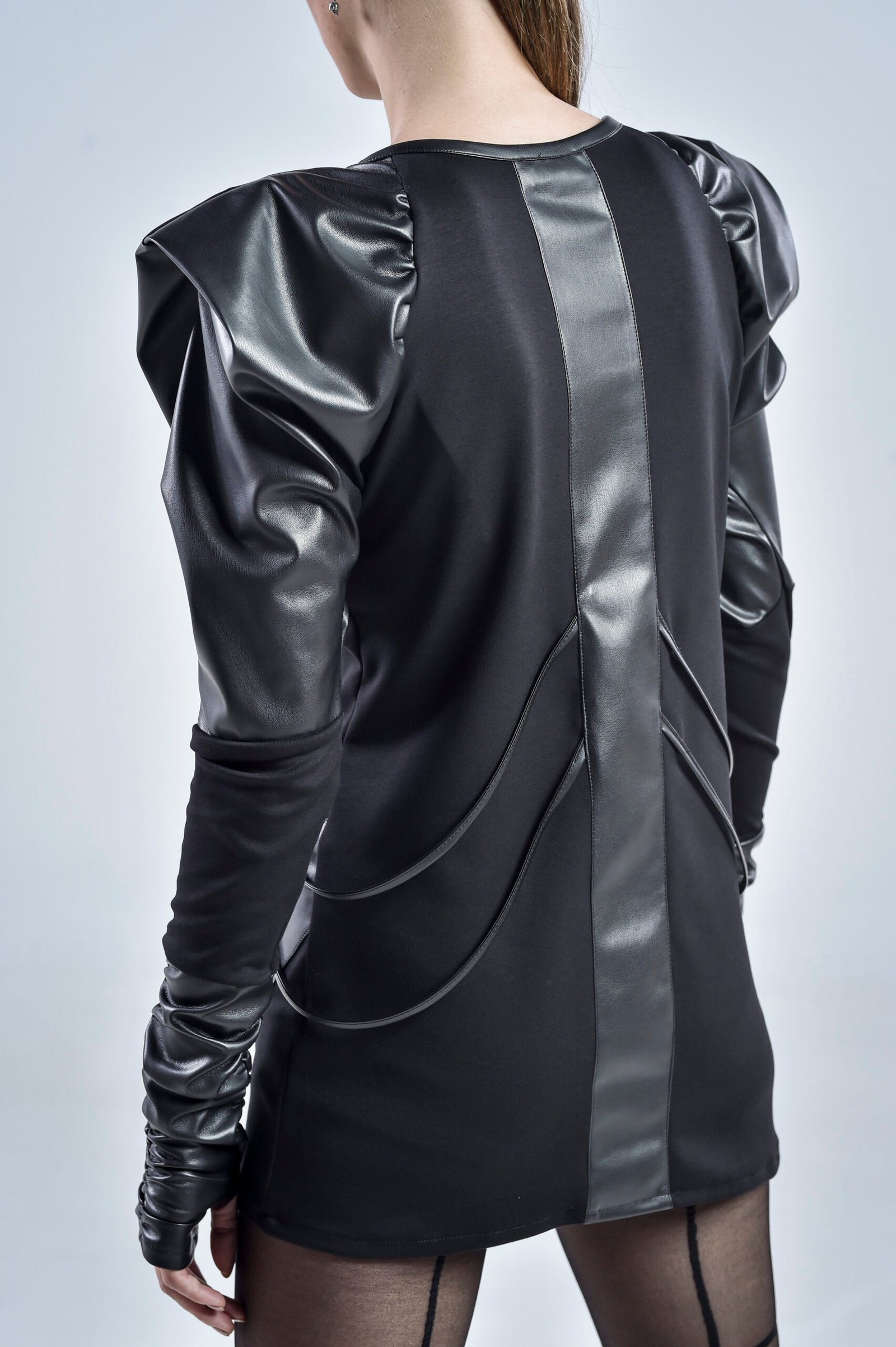 The Aether Blouse is designed to be paired with shorts, leggings, or slim trousers โ not intended to be worn as a dress. The contrast between matte viscose and glossy faux leather panels gives the piece a cyberpunk-inspired sophistication, ideal for those who embrace all-black fashion with a futuristic edge.