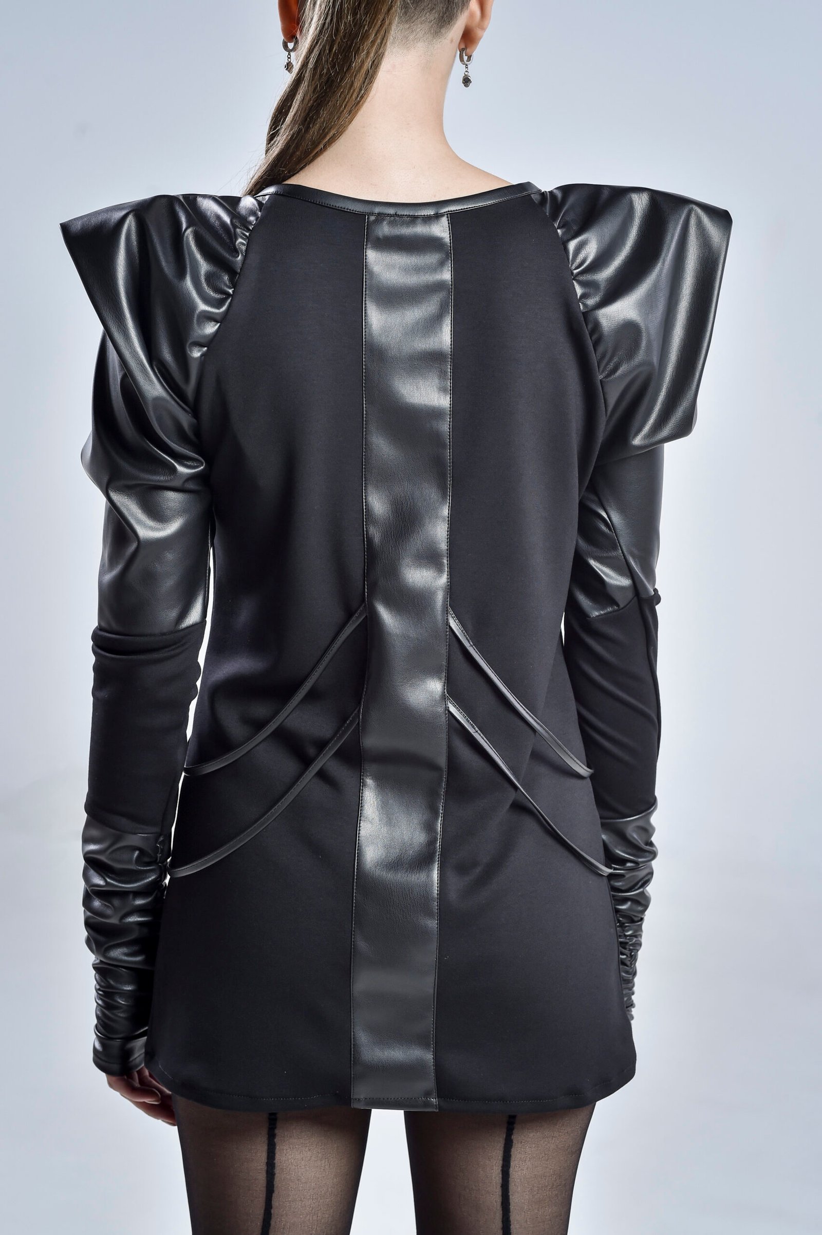 Embrace a new era of style with the Aether Blouse, a statement piece that merges structured design and avant-garde aesthetics. Crafted from thick soft viscose andย faux leather, this tunic redefines modern minimalism with its bold silhouette and refined detailing.