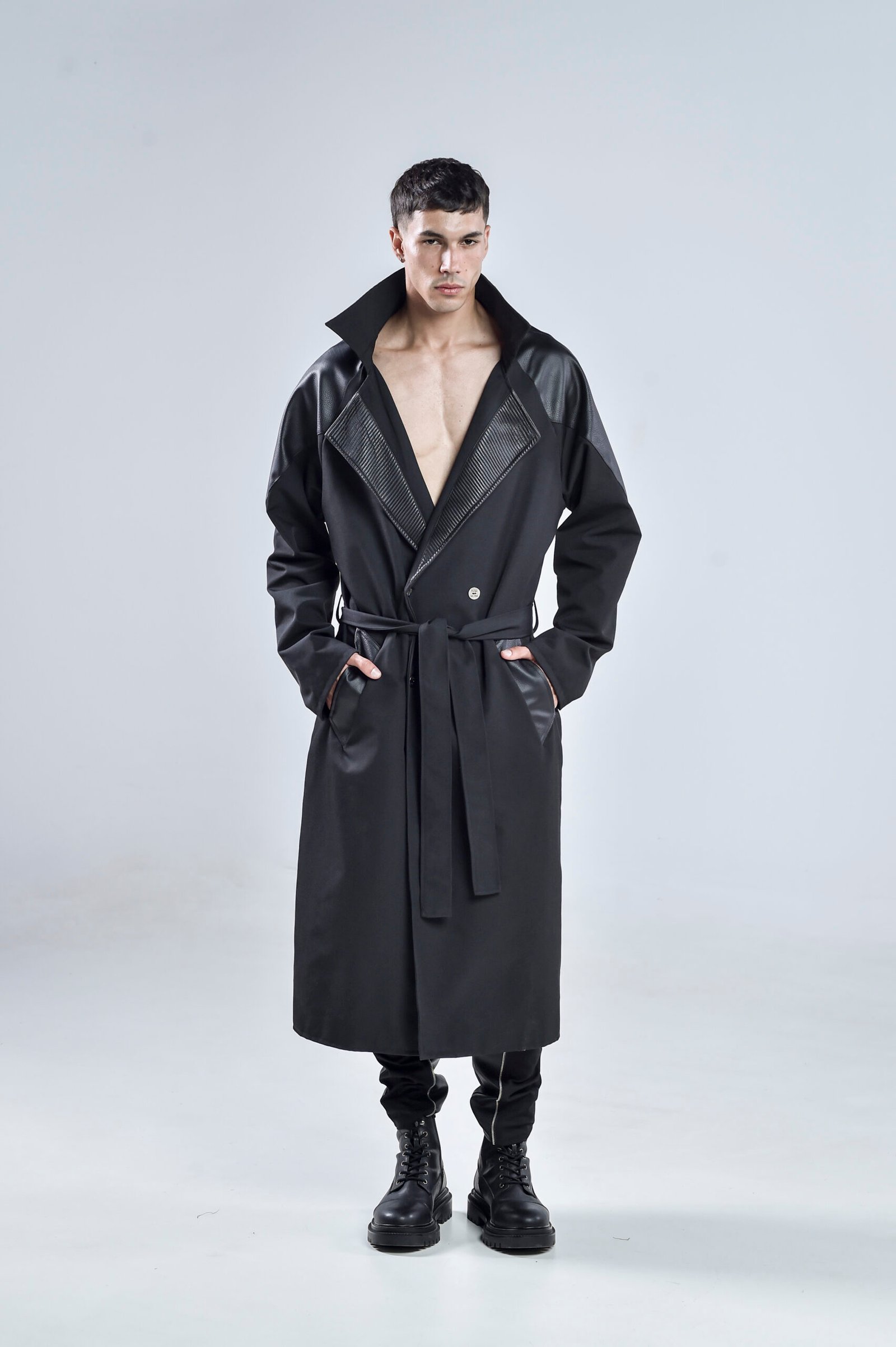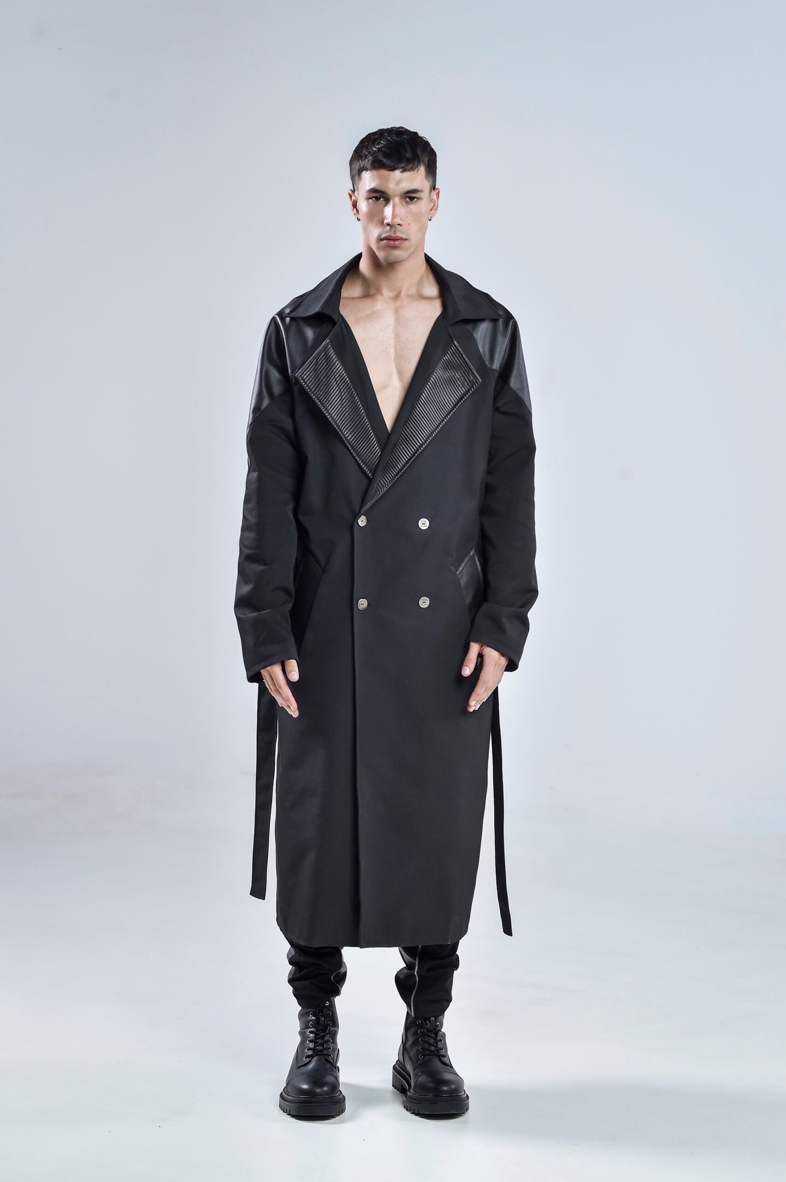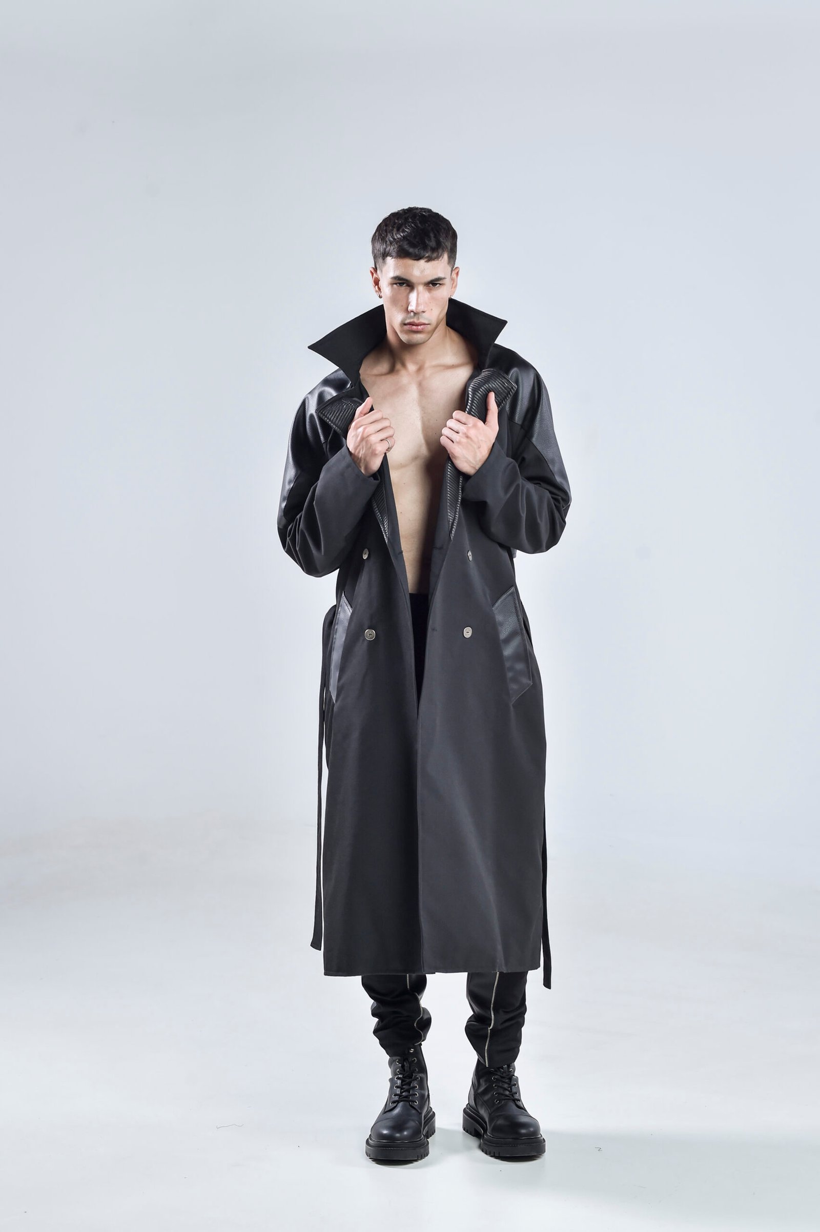 Step into the future of style with the Black Matter Trench Coat, a bold statement piece that blends modern tailoring with dystopian edge. Expertly crafted from premium gabardine fabric and enhanced with faux leather details, this coat redefines contemporary menswear.