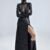 This avantgarde black dress is crafted from georgette, mesh, and faux leather, blending structure and fluidity in perfect tension. The high mesh collar frames the neck with ethereal elegance, while the mesh-lined sleeves and daring high slit reveal just enough to hint at the strength beneath the surface.