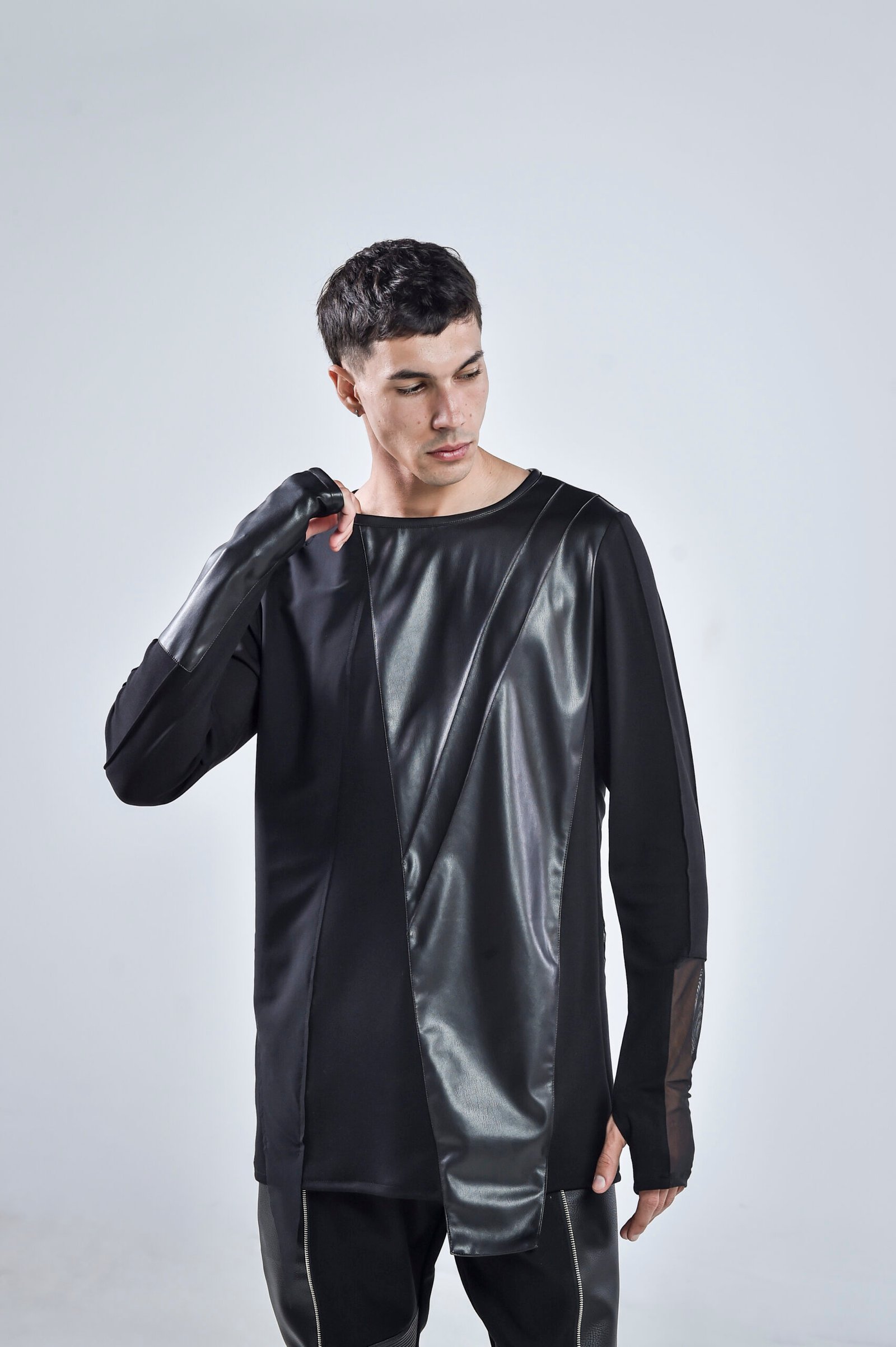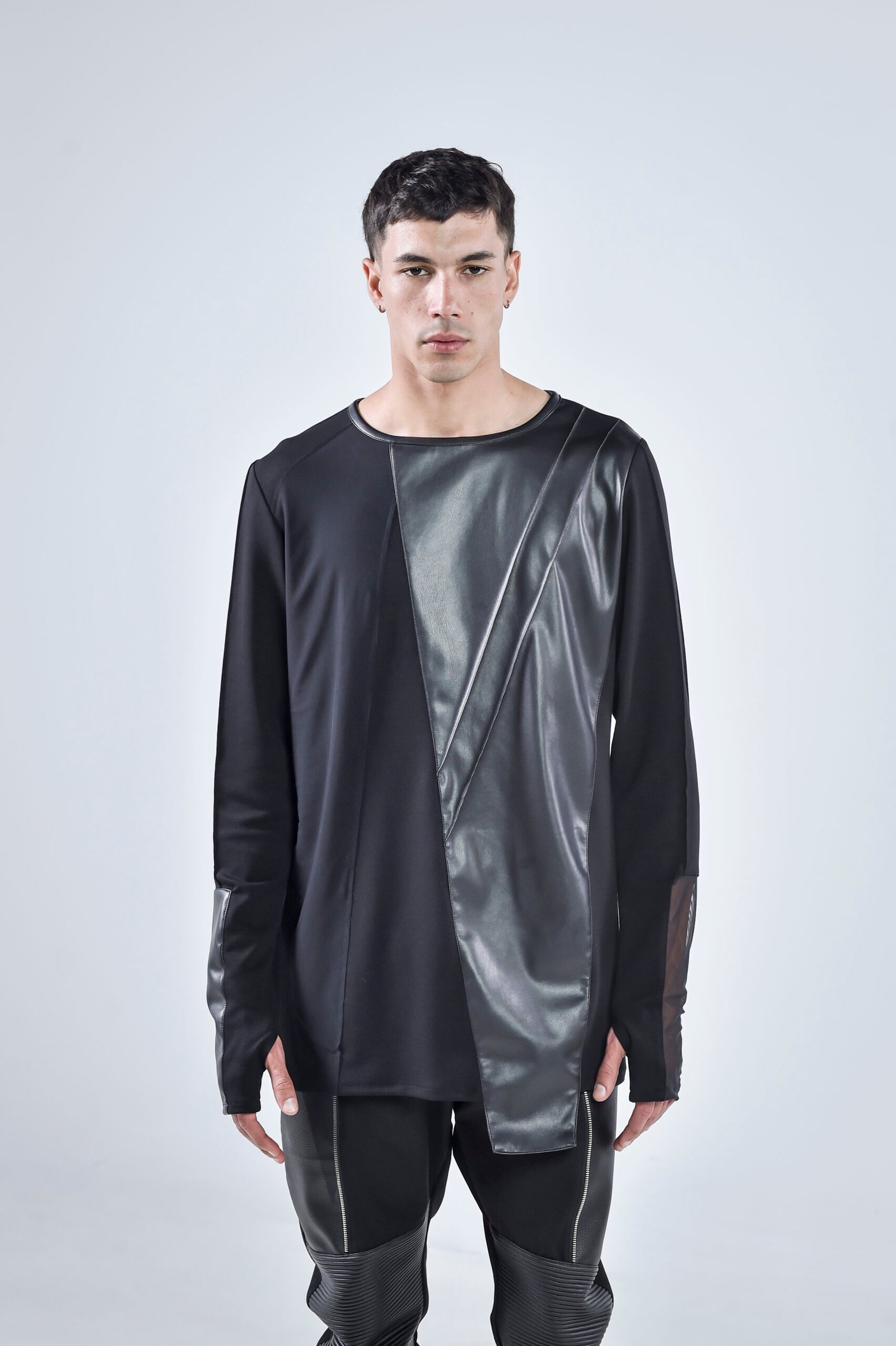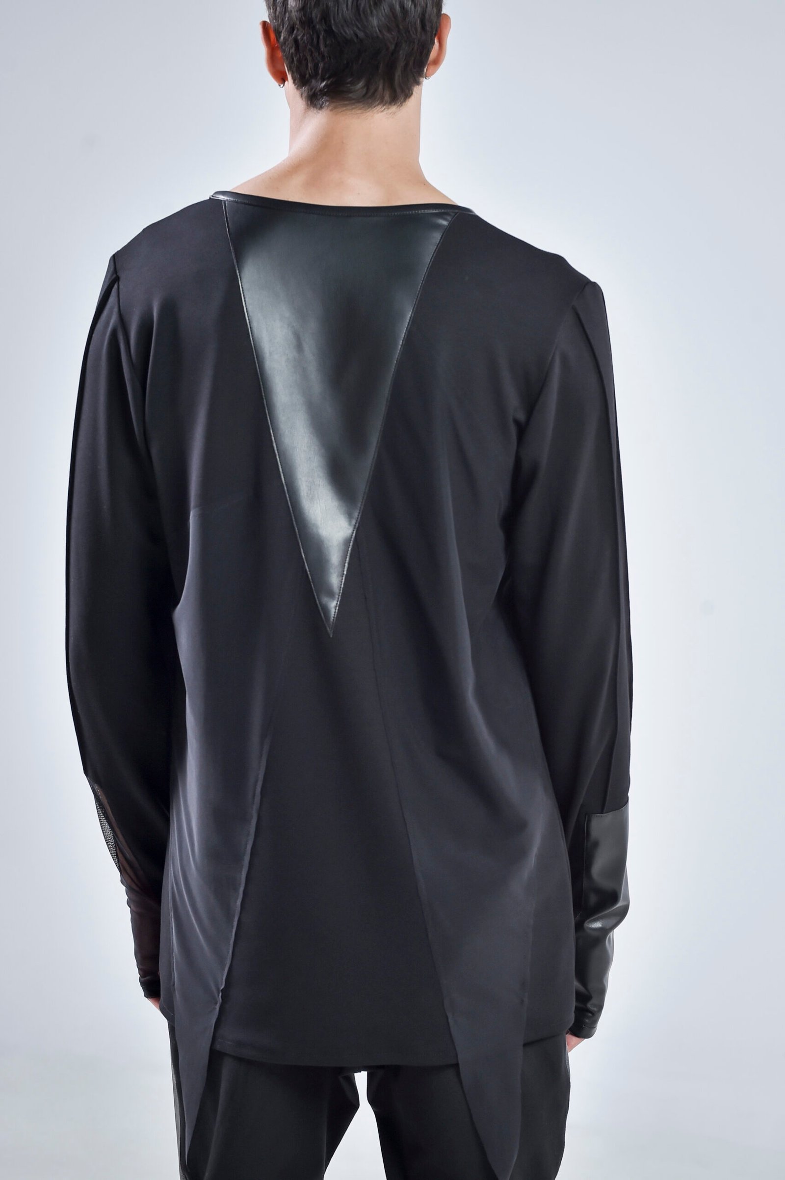 The front and back are accented with matte faux leather panels, cut in sharp geometric lines that create a striking contrast against the draped viscose base. The sleeves mirror this duality โ€” one featuring a sheer mesh insert, and the other constructed entirely from faux leather, embodying perfect balance between texture and tension.