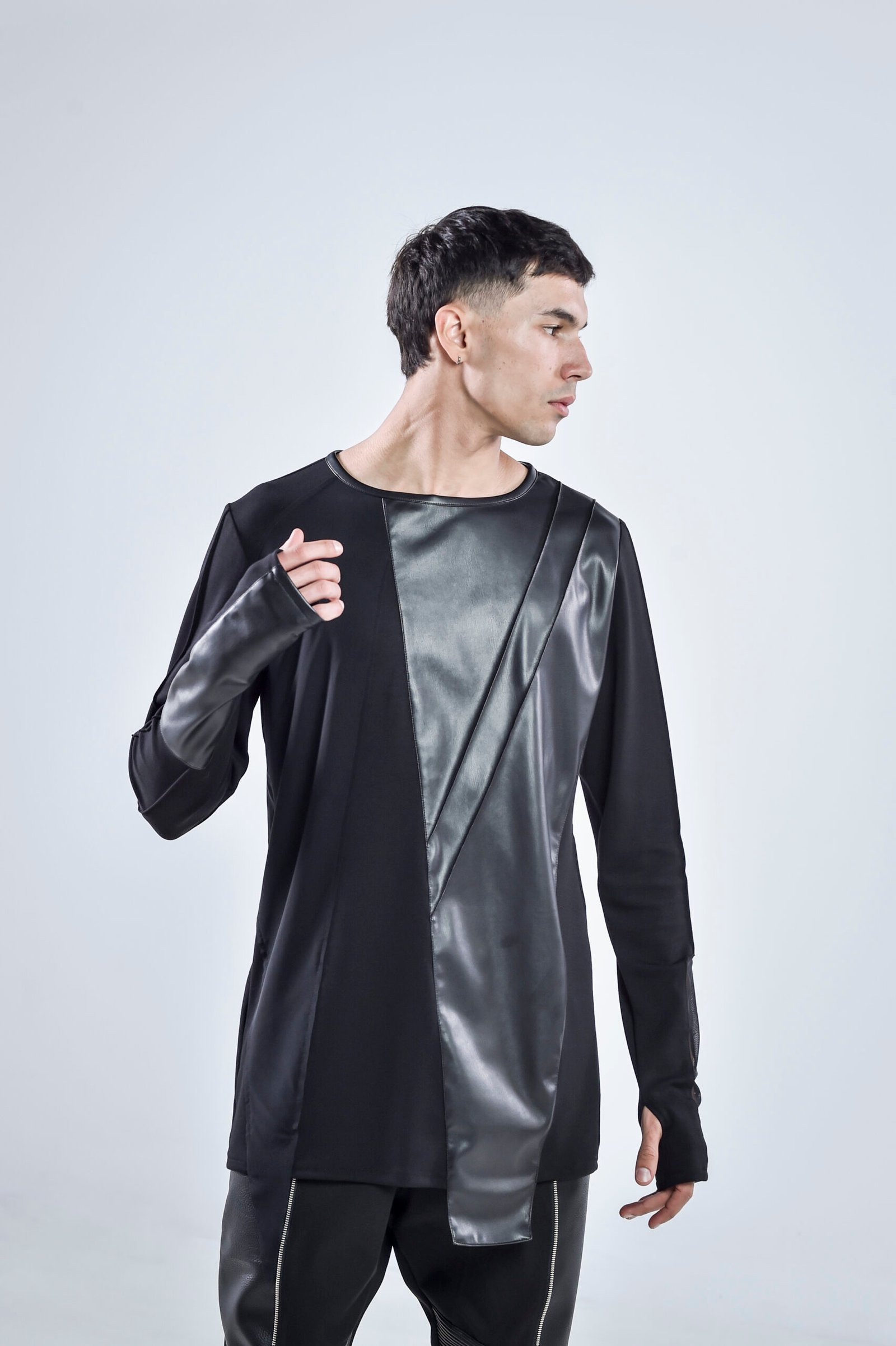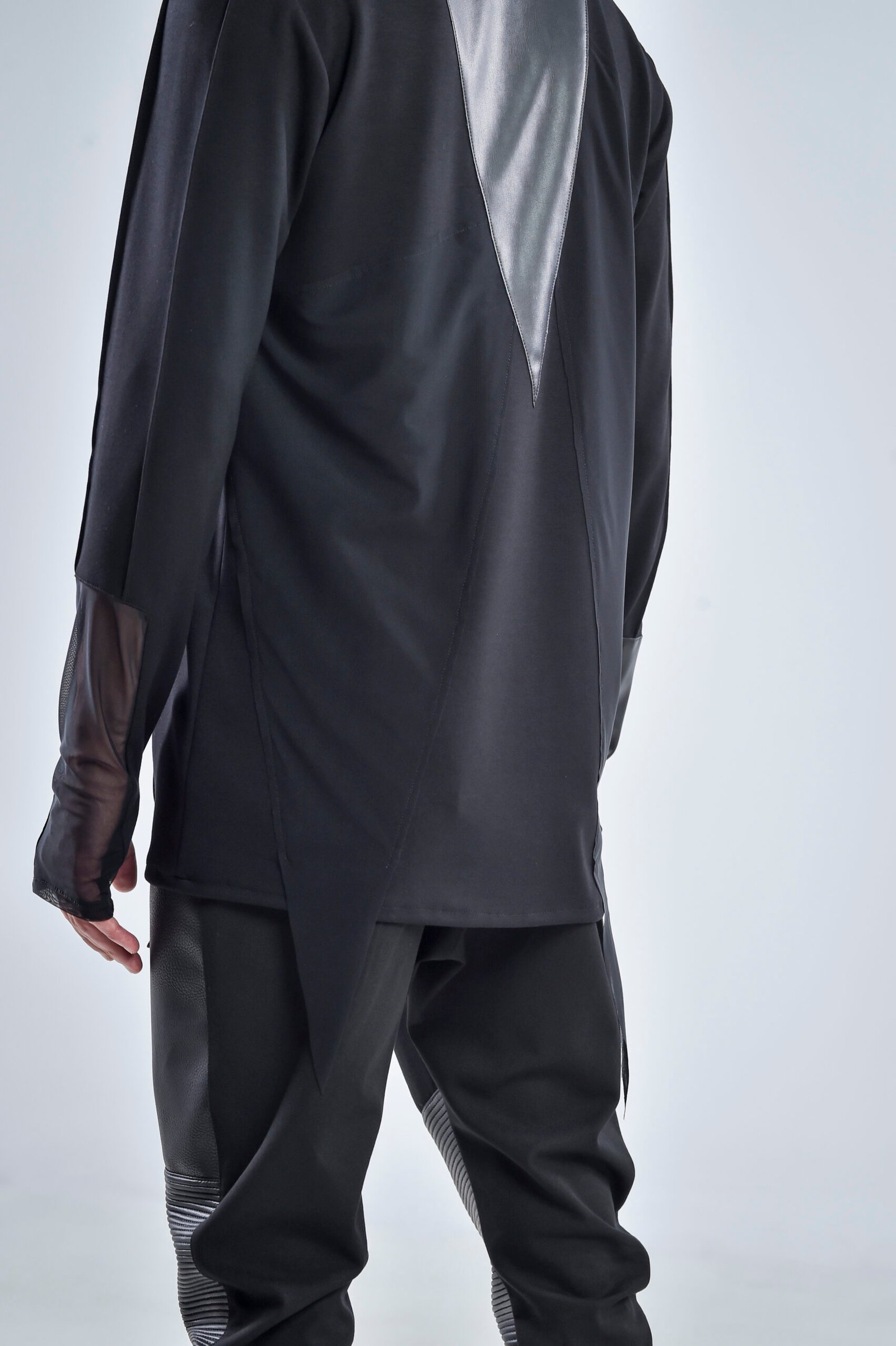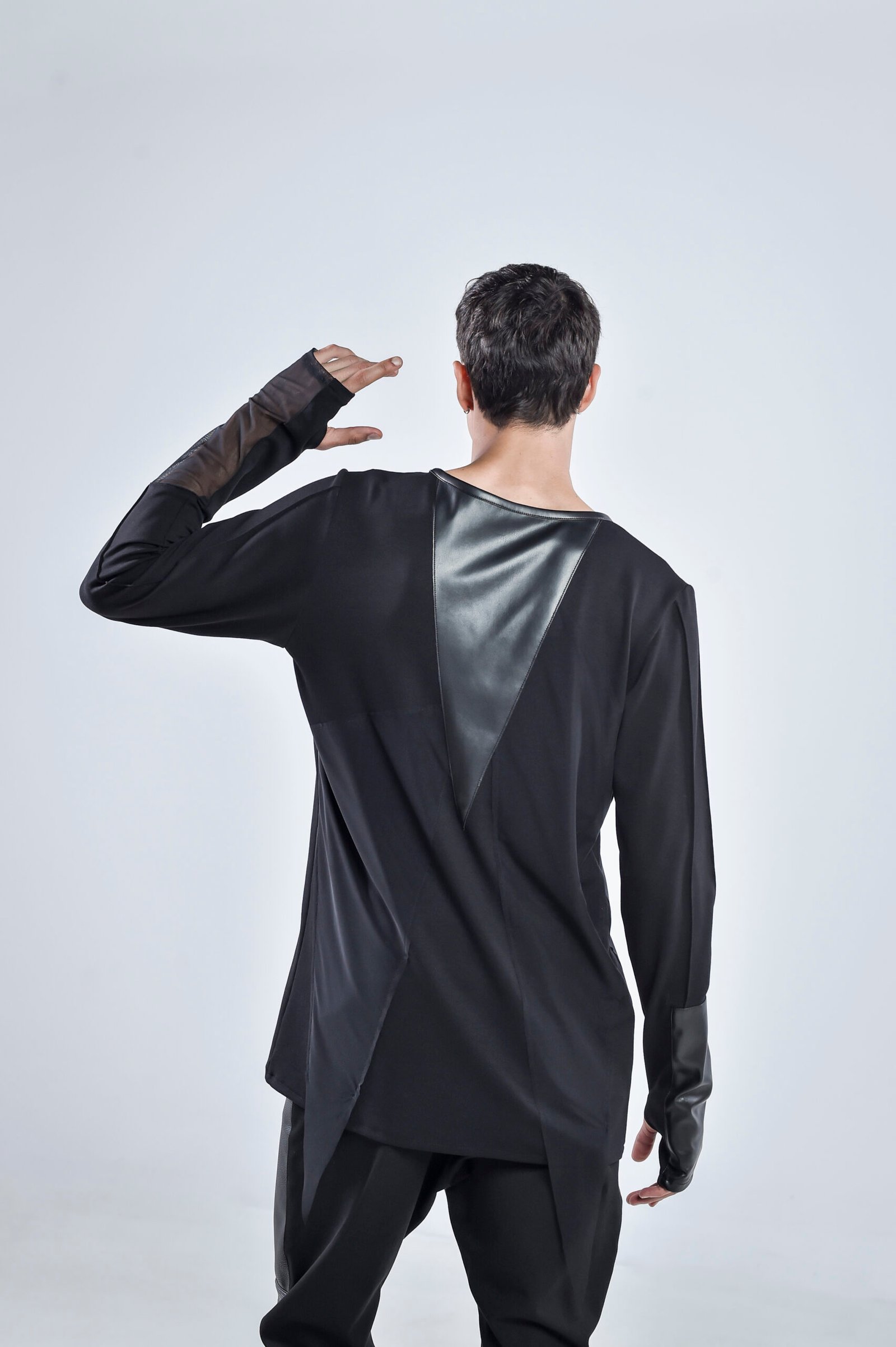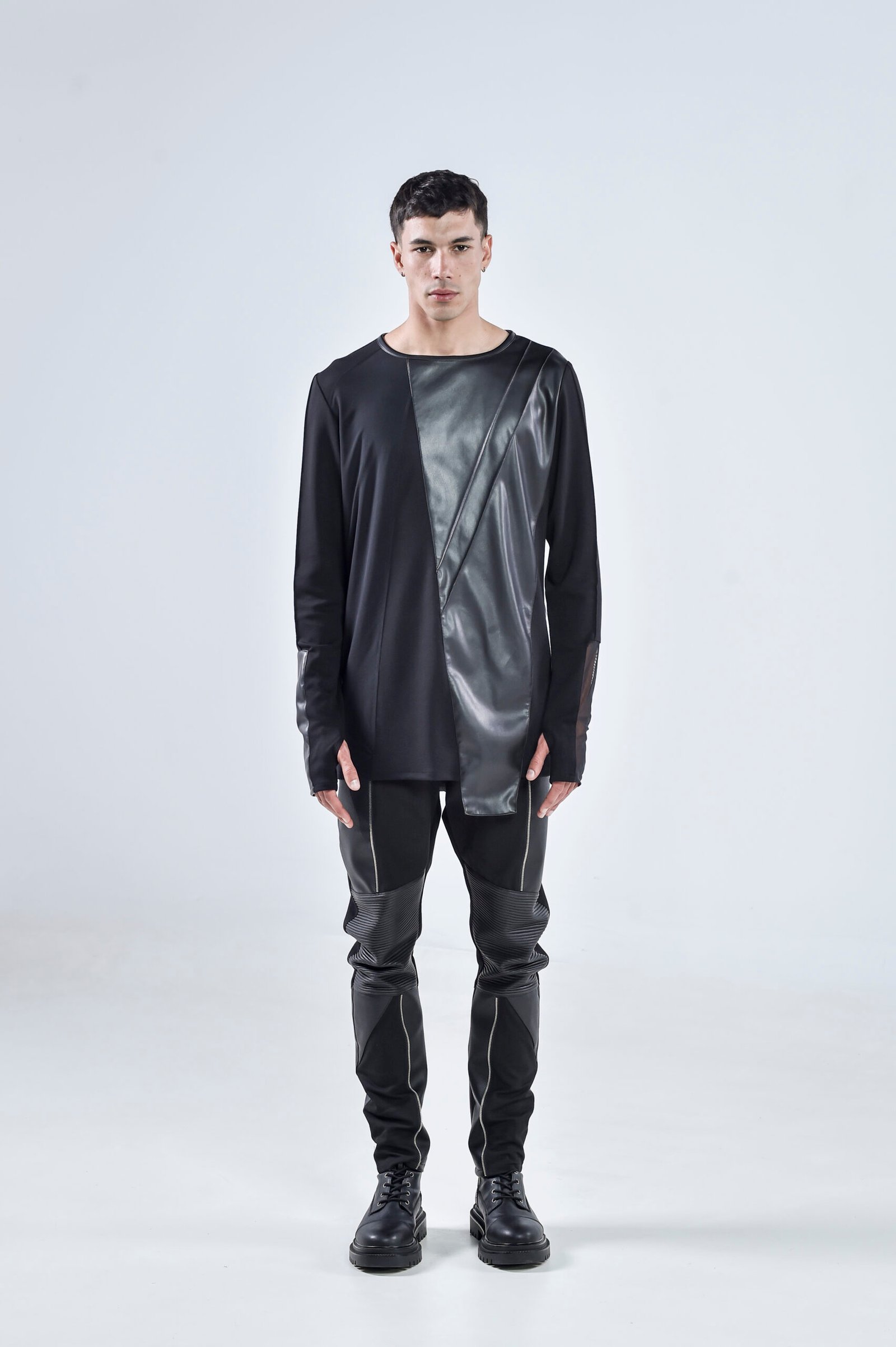 The front and back are accented with matte faux leather panels, cut in sharp geometric lines that create a striking contrast against the draped viscose base. The sleeves mirror this duality โ€” one featuring a sheer mesh insert, and the other constructed entirely from faux leather, embodying perfect balance between texture and tension.