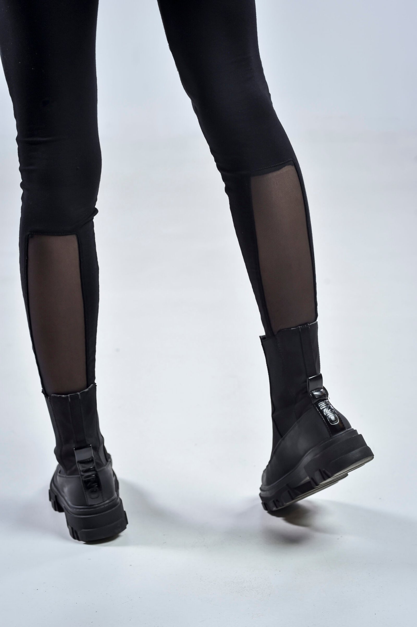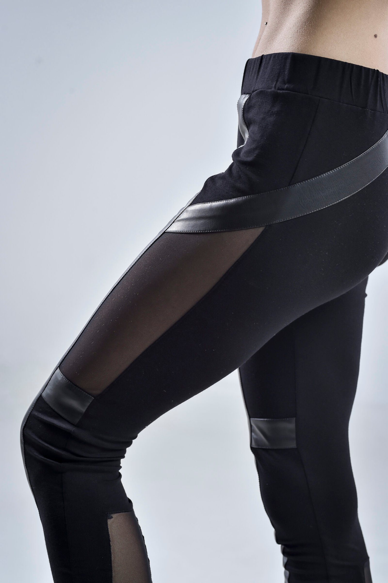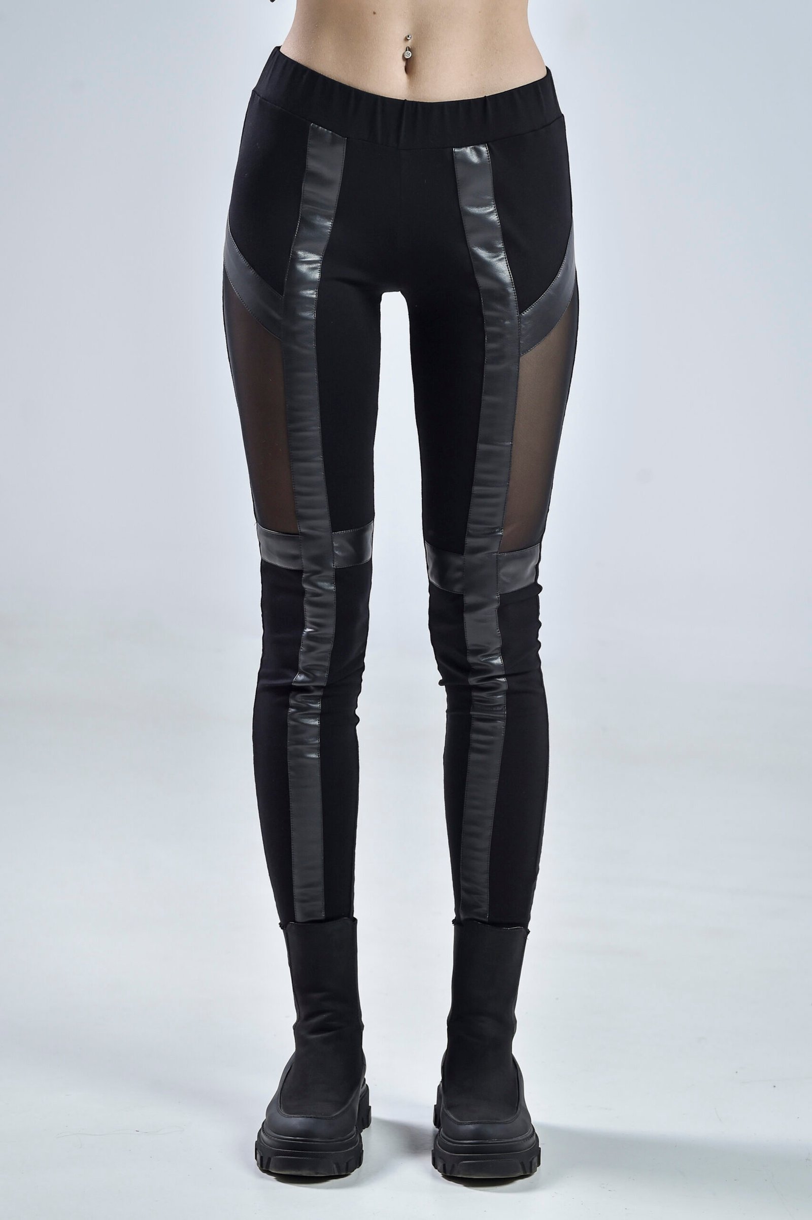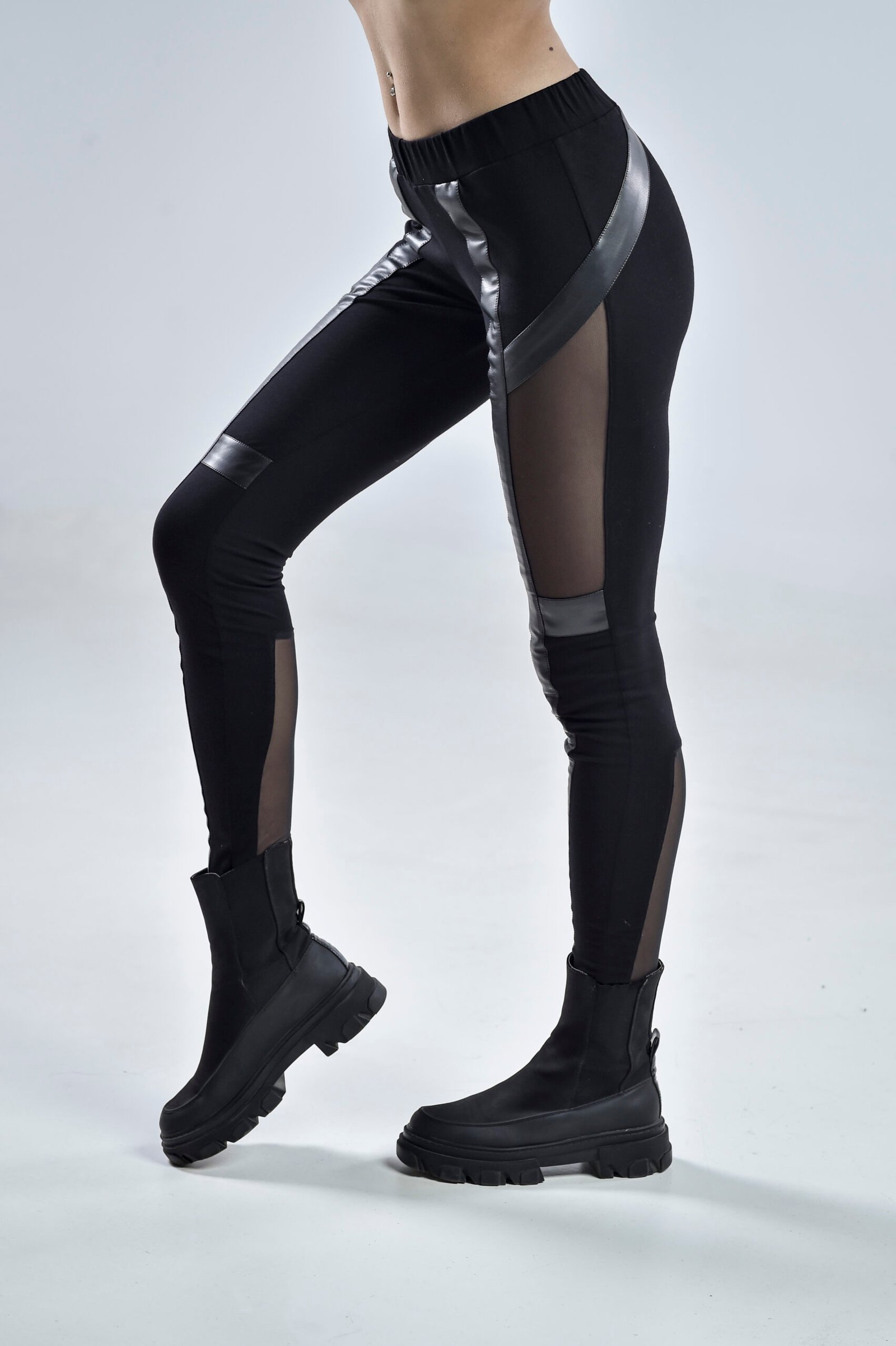 The front panels boast glossy faux leather accents that elongate the legs and create a dynamic contrast against the matte viscose base. The back design highlights smooth shaping with square mesh calf panels, offering breathability and an unmistakable futuristic twist. Their elastic waistband ensures a secure and flattering fit for movement, nightlife, or everyday wear.