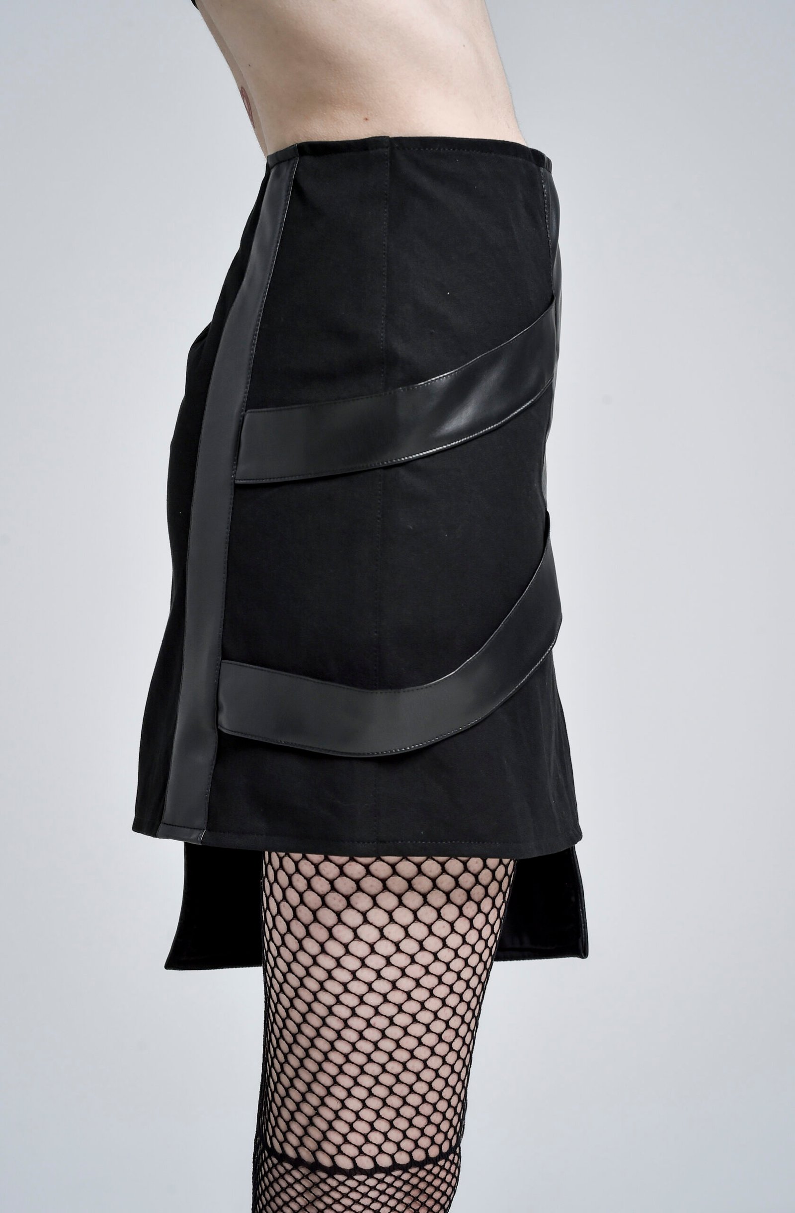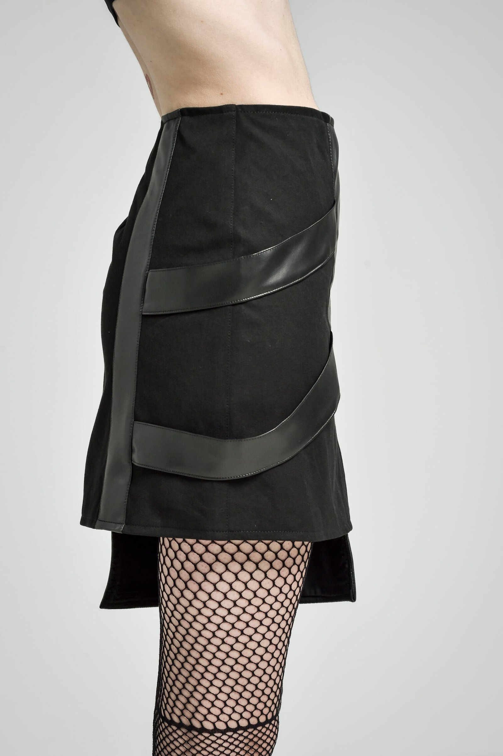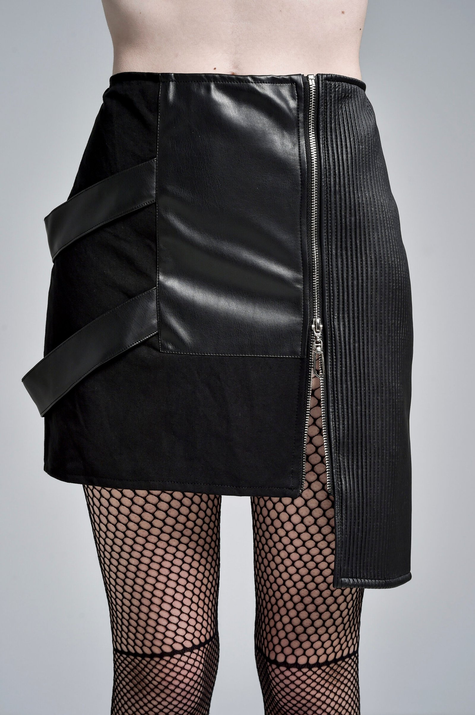 Crafted from durable gabardine, the skirt is elevated with two contrasting faux leather textures — smooth panels and structured ribbed detailing — creating depth and visual contrast. The asymmetric construction is enhanced by faux leather side straps that introduce a dynamic, layered effect.