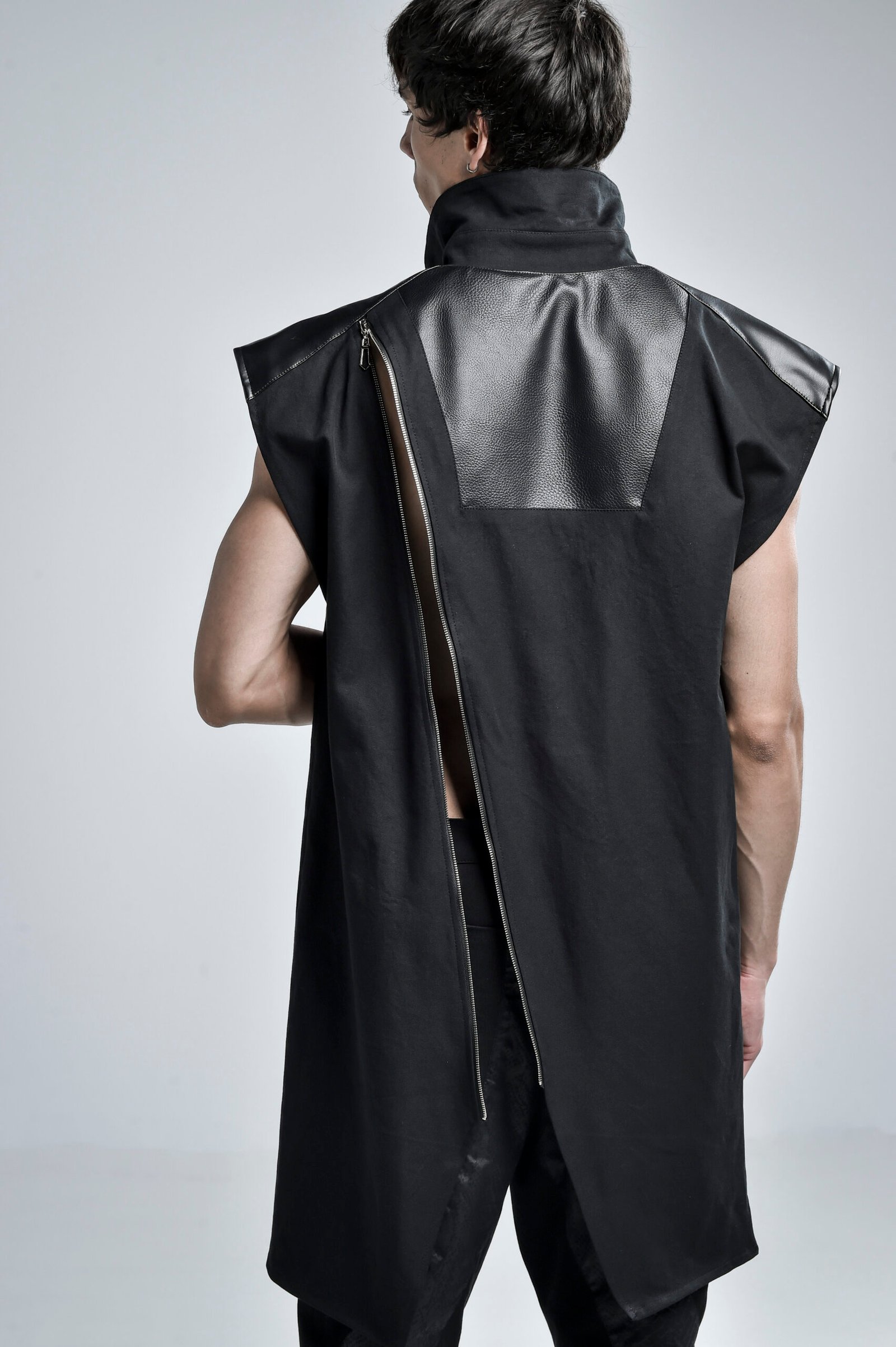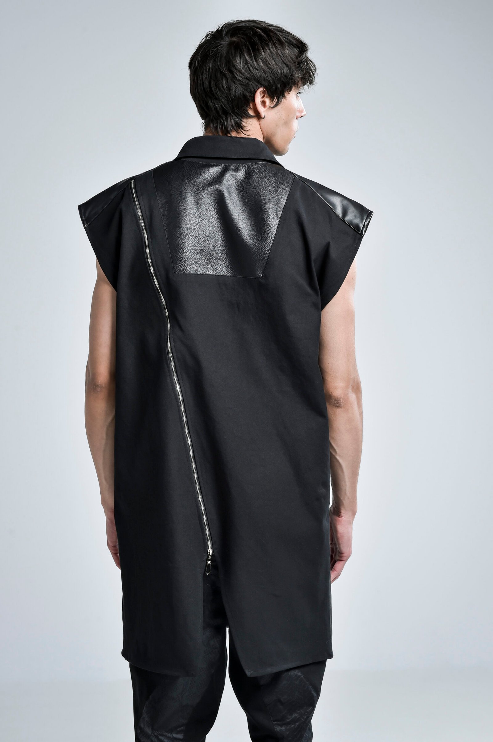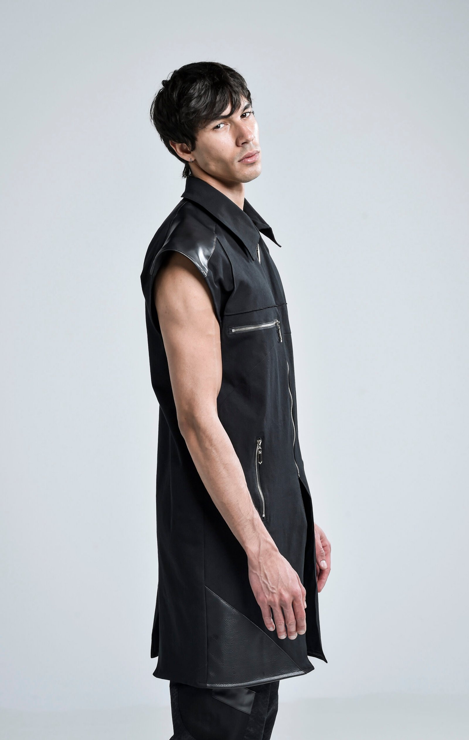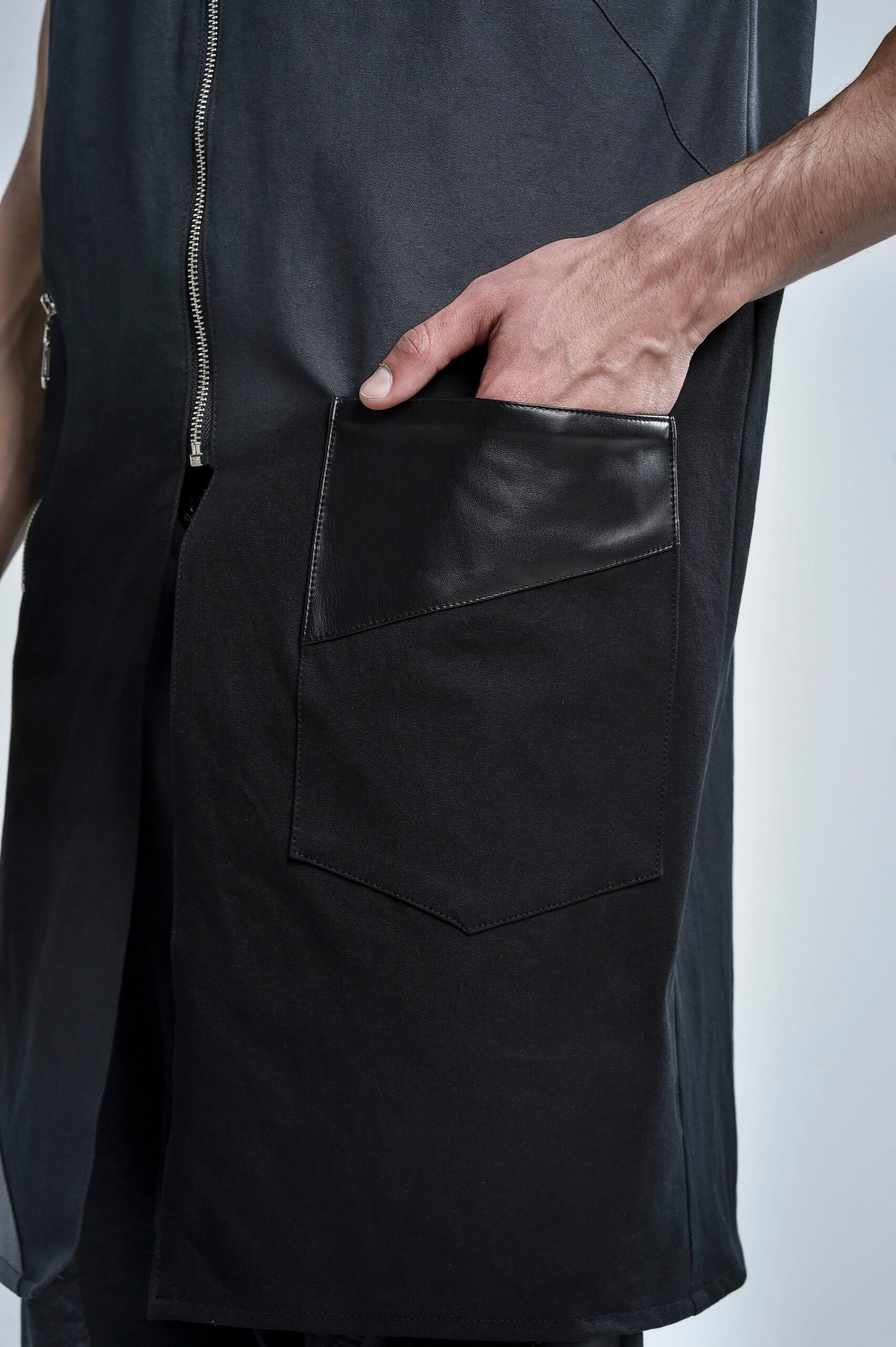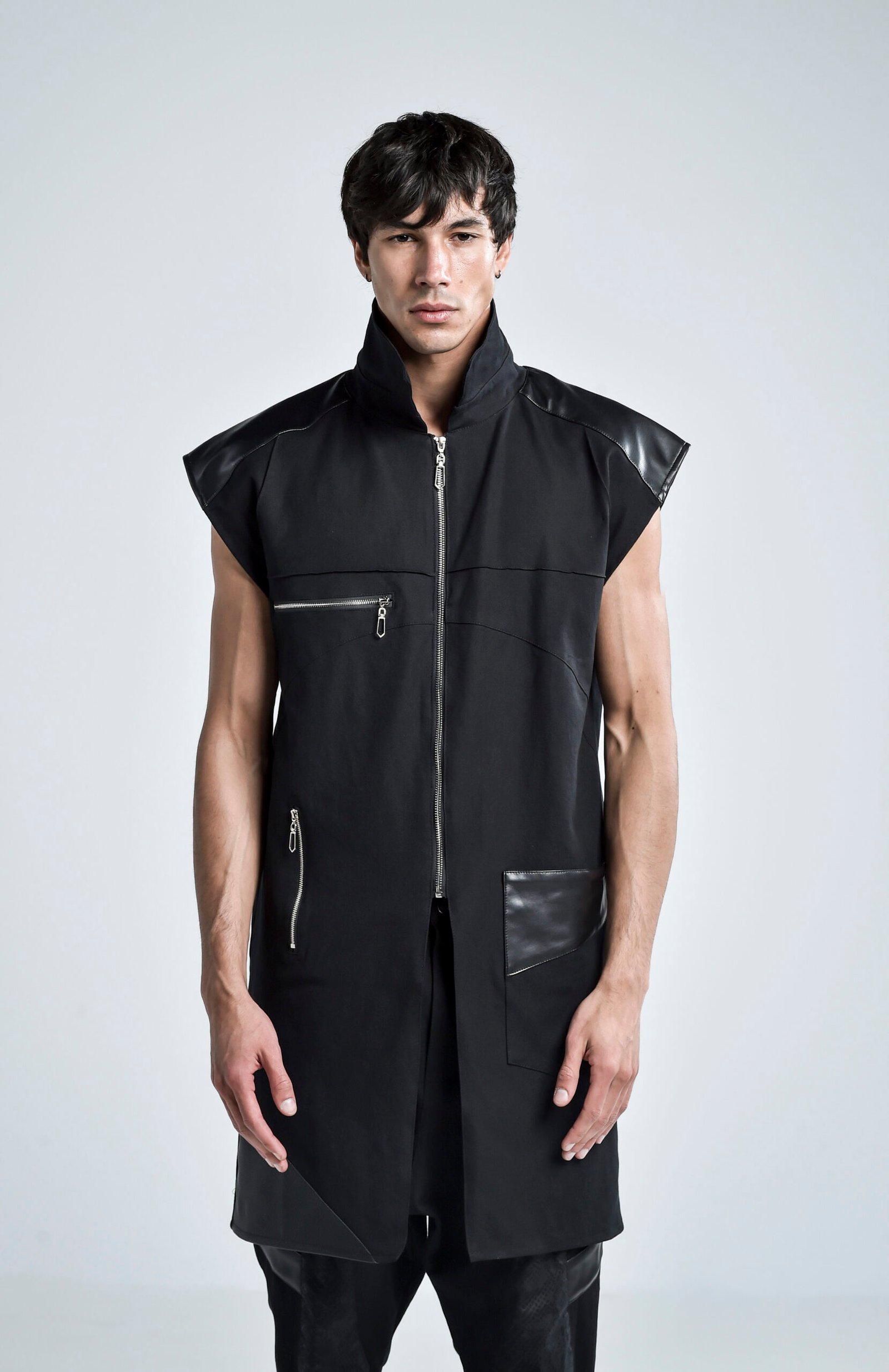 A full front zipper and multiple zip pockets add both function and edge, reinforcing its utilitarian character. The extended length enhances its visual impact, making it ideal for layering and statement styling within modern menswear.