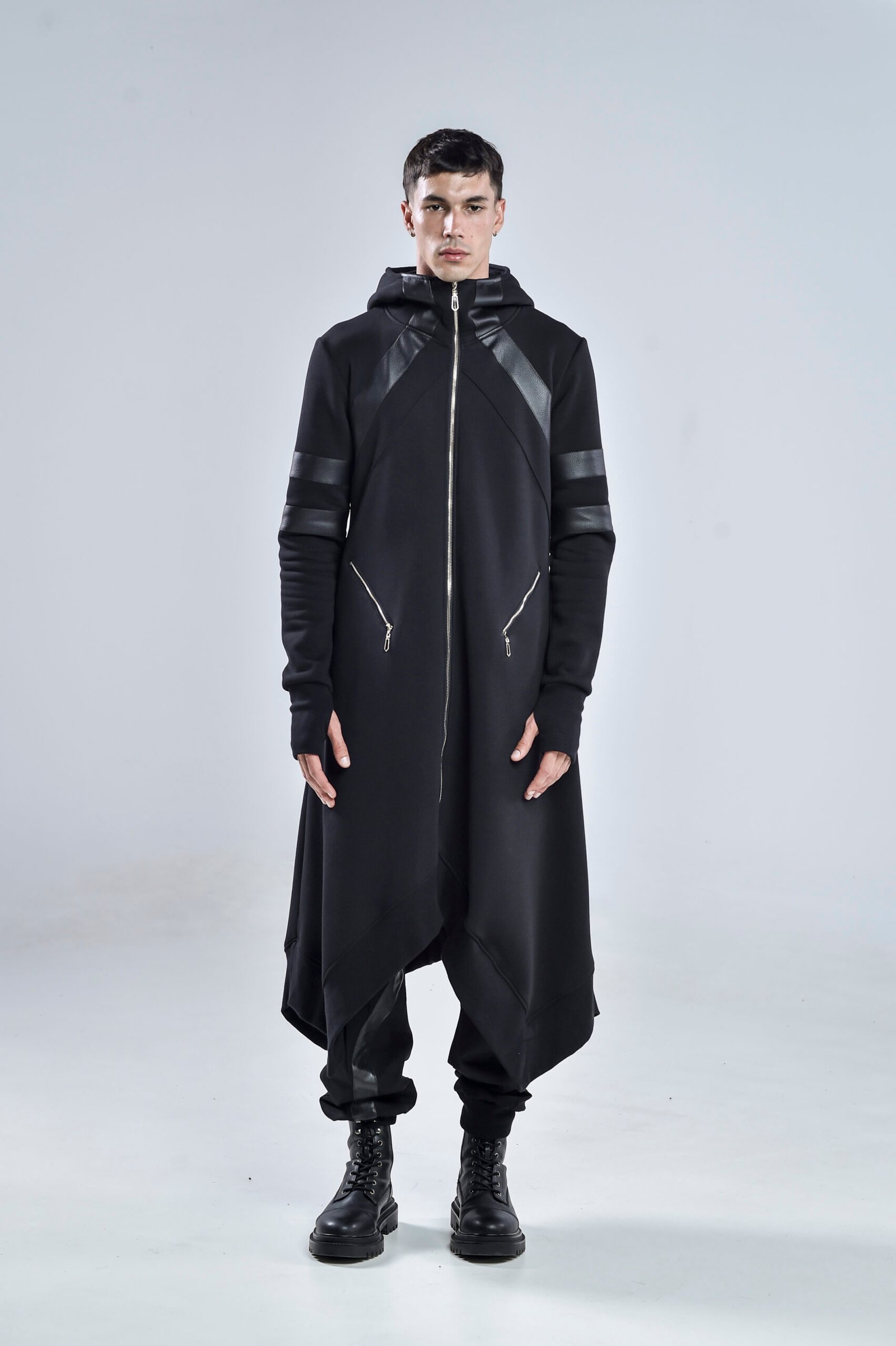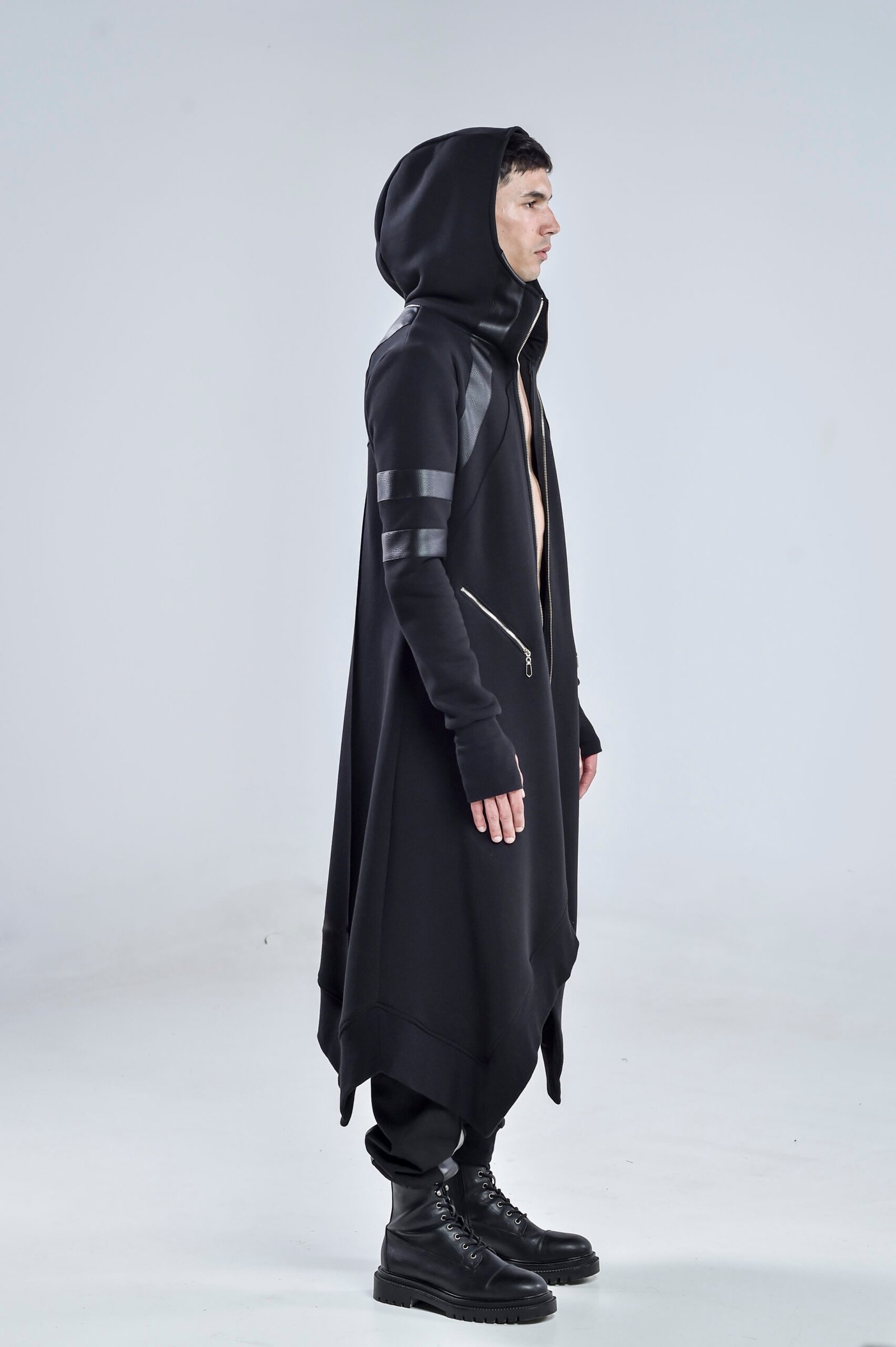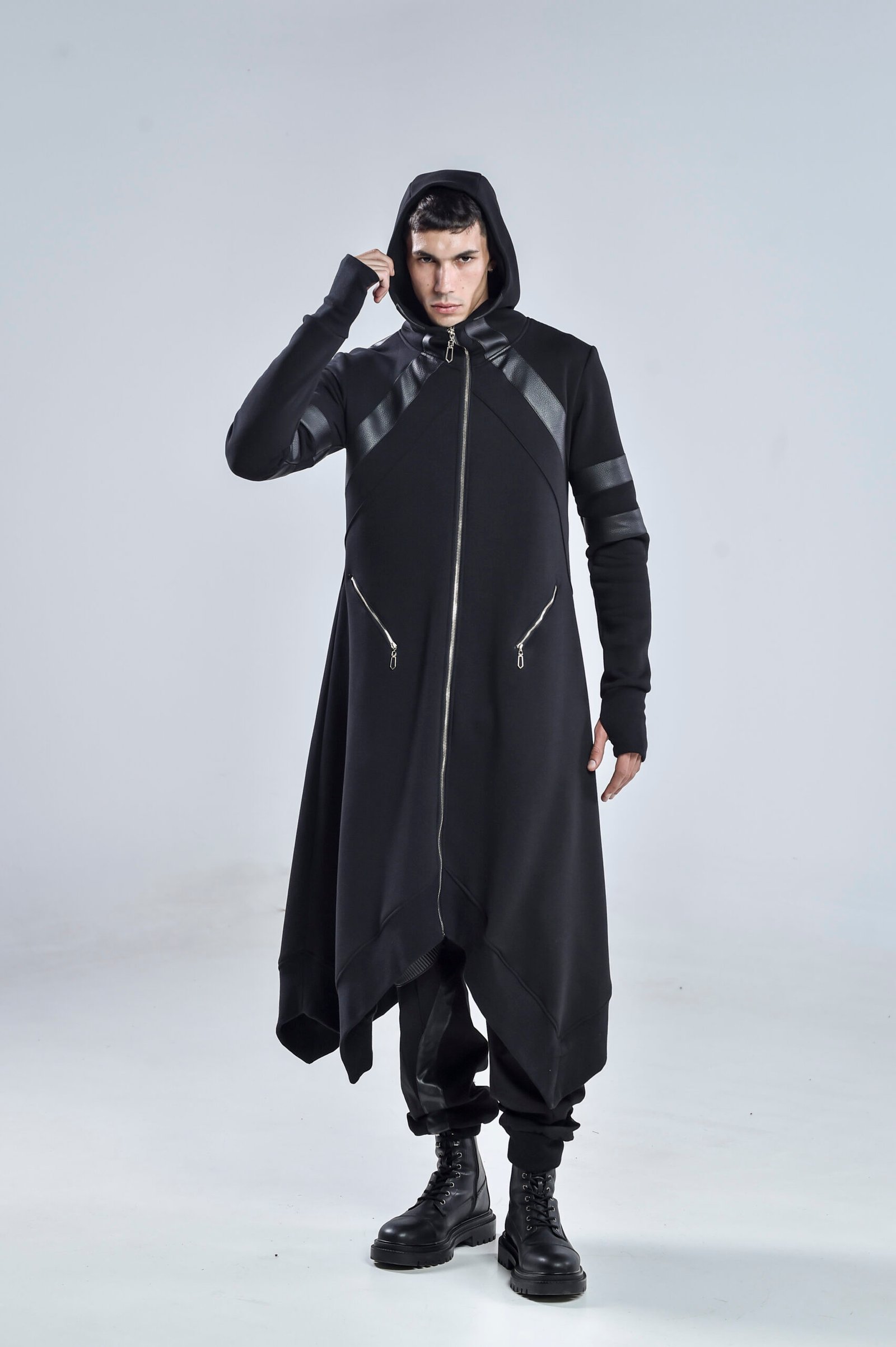 A high collar transitions seamlessly into a hooded design, offering both style and protection. The long asymmetric hem gives a dynamic edge, enhancing movement while maintaining a streamlined, layered aesthetic. Front zipper pockets provide functional detail, while thumbholes at the cuffs ensure a secure and modern fit.