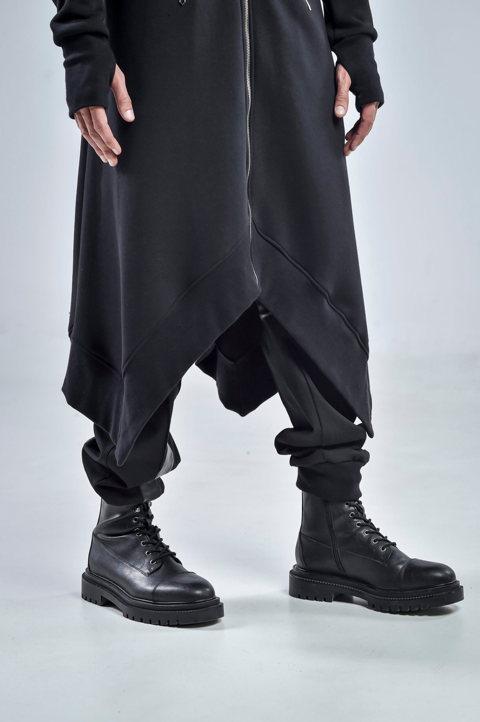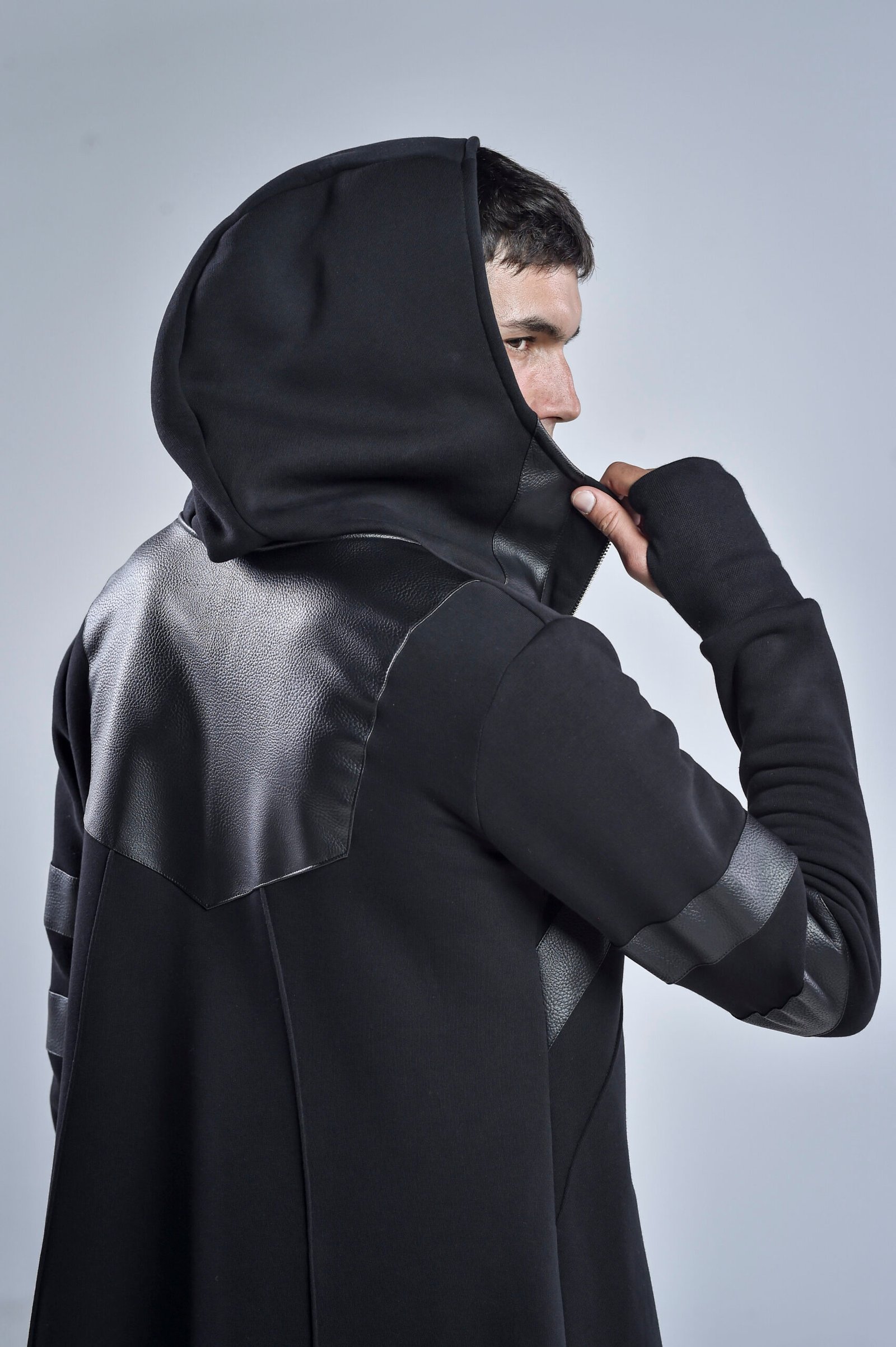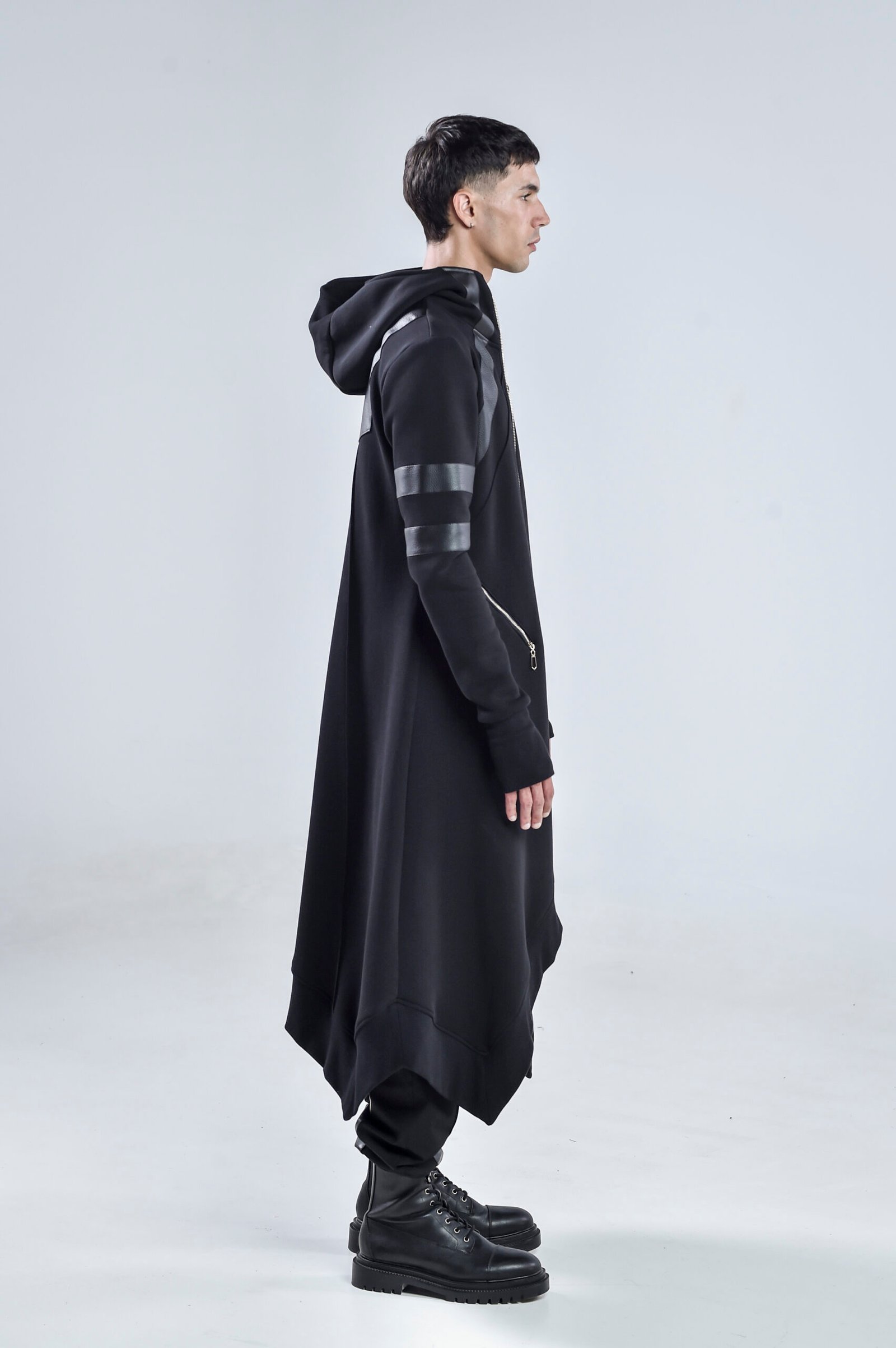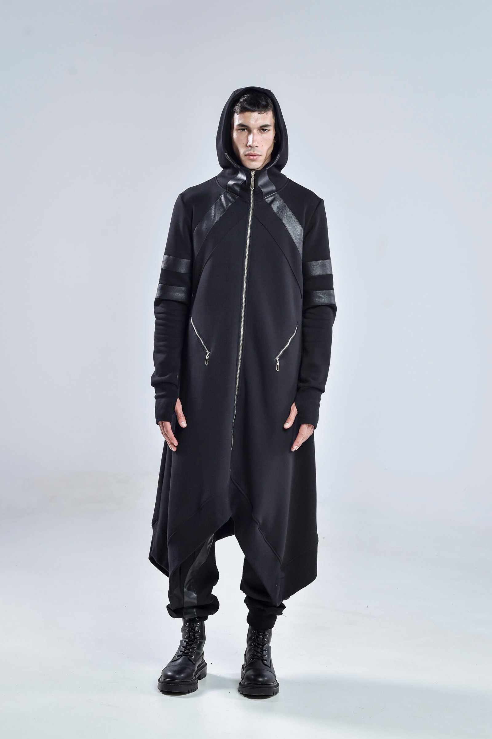 A high collar transitions seamlessly into a hooded design, offering both style and protection. The long asymmetric hem gives a dynamic edge, enhancing movement while maintaining a streamlined, layered aesthetic. Front zipper pockets provide functional detail, while thumbholes at the cuffs ensure a secure and modern fit.