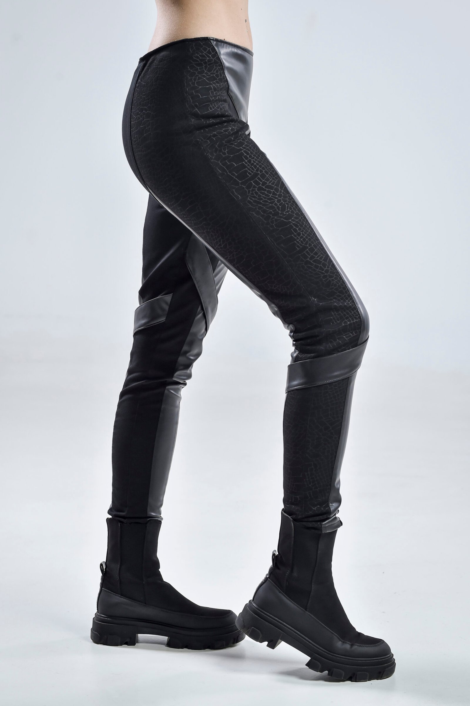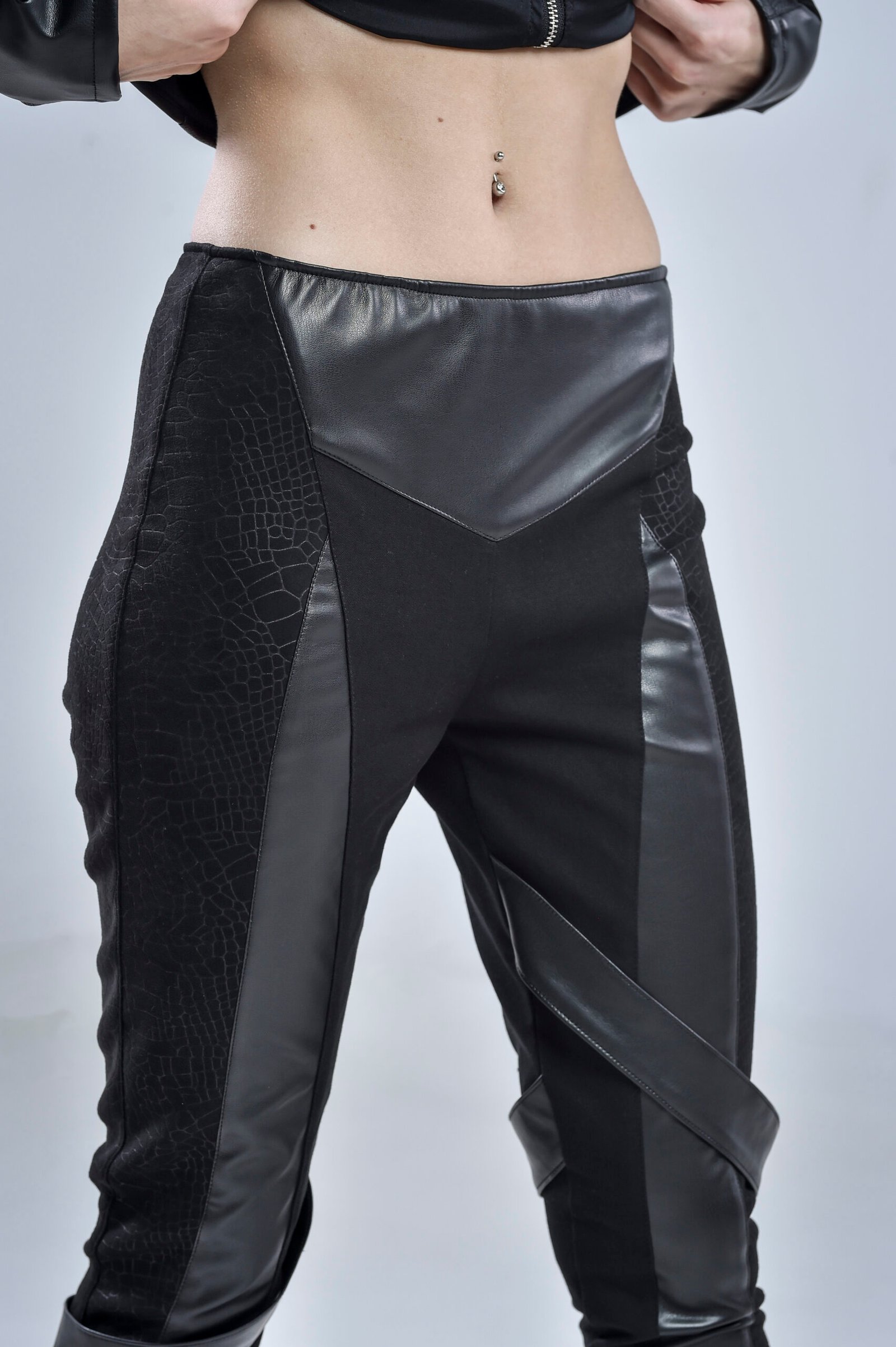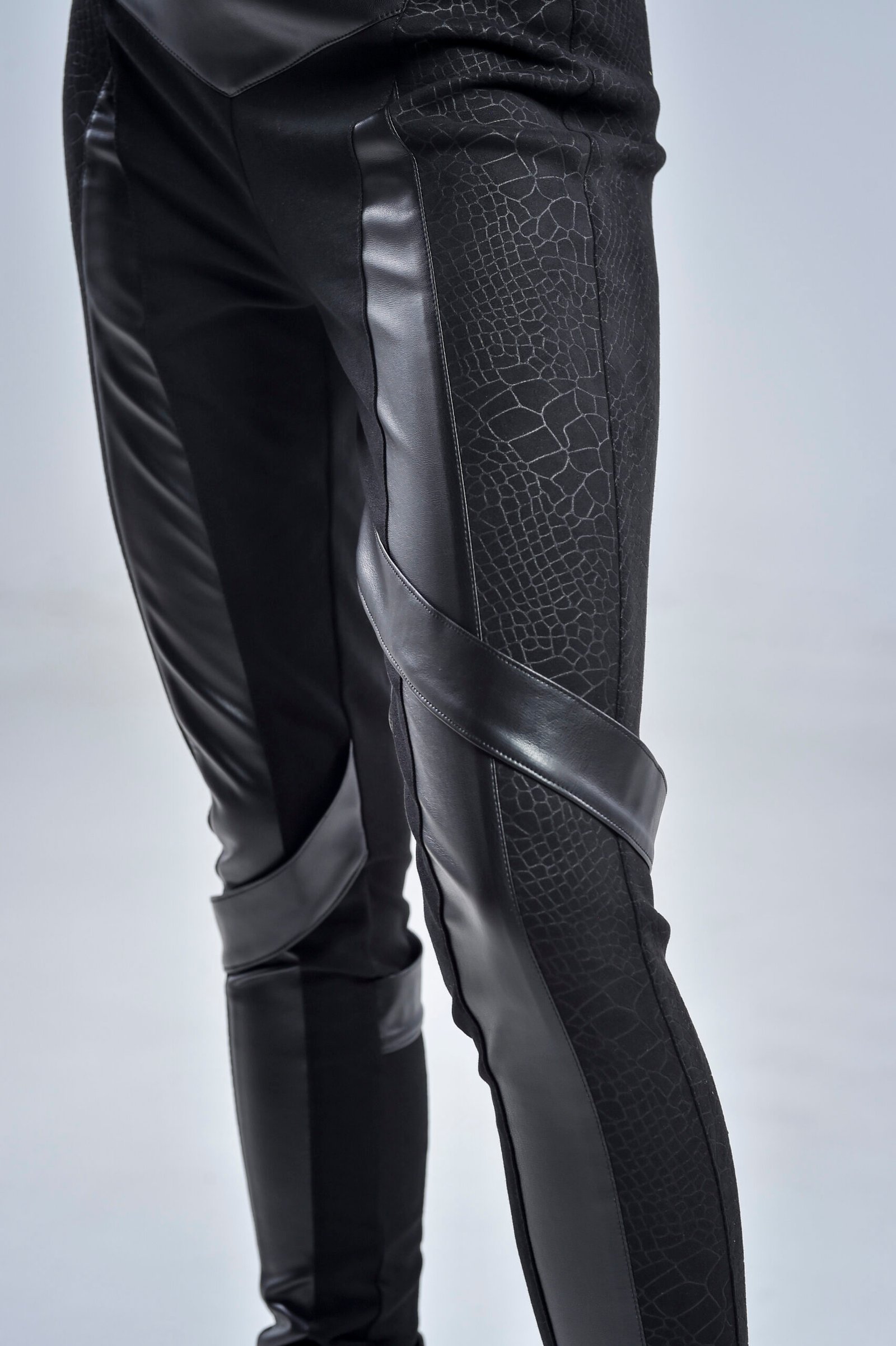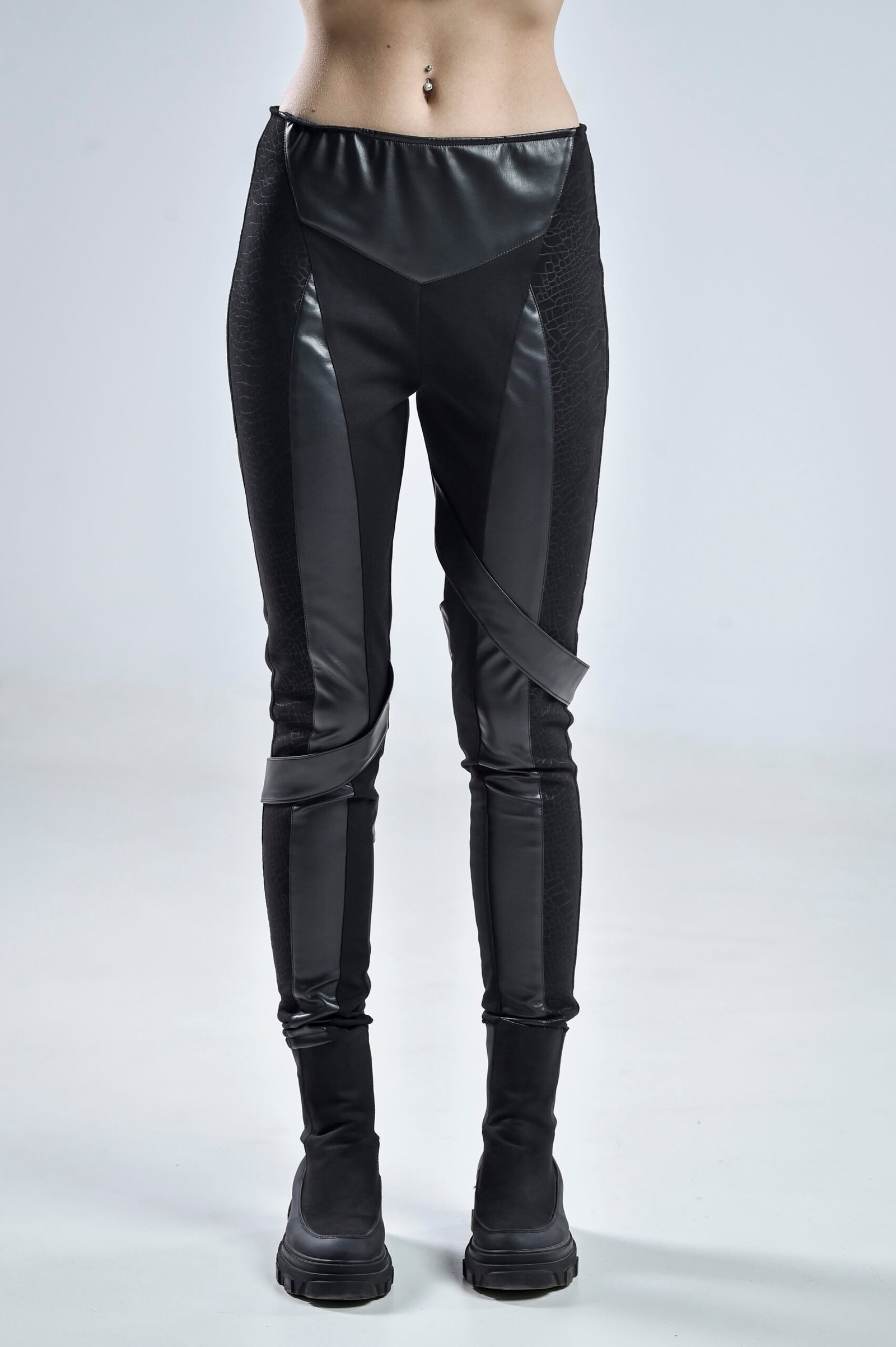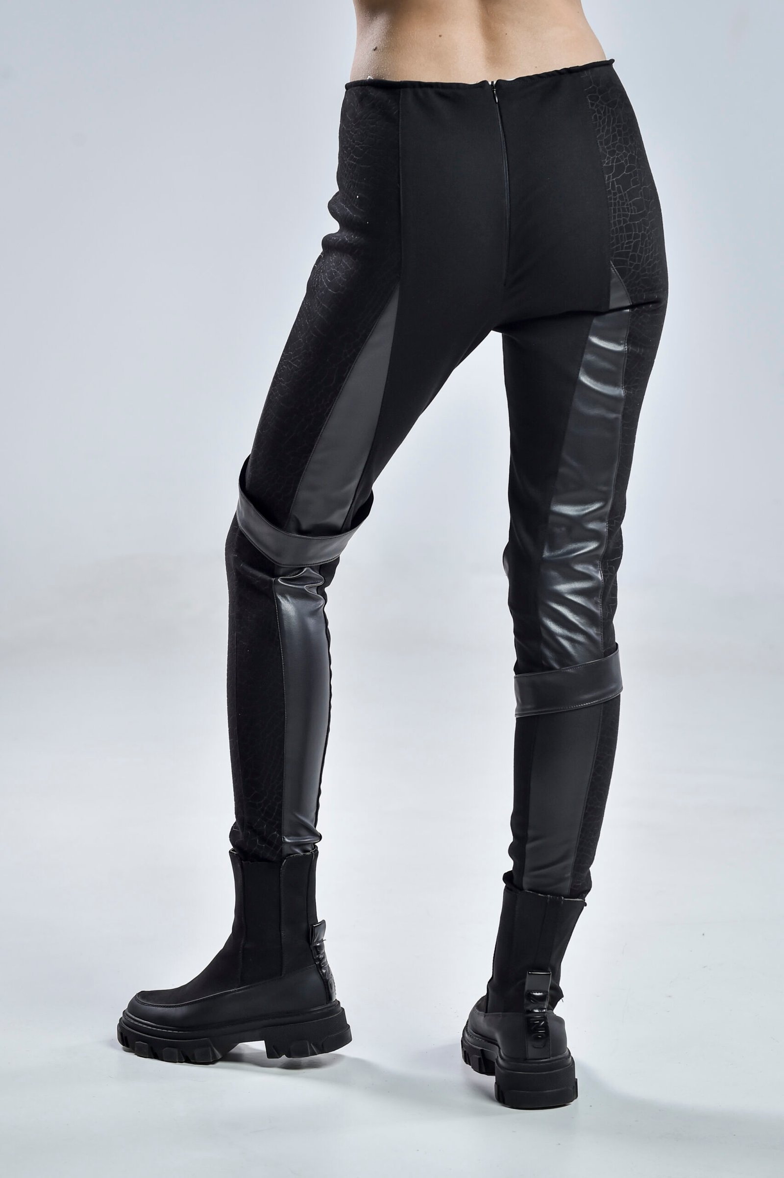 Crafted with a gabardine base for durability and structure, the Nebula Pants are elevated by cotton-lycra patterned panels that add flexibility and texture. Faux leather details along the seams and freely falling fabric stripes give movement and futuristic edge to every step. The hidden zipper closure at the back ensures a sleek, minimalist finish that flatters from every angle.