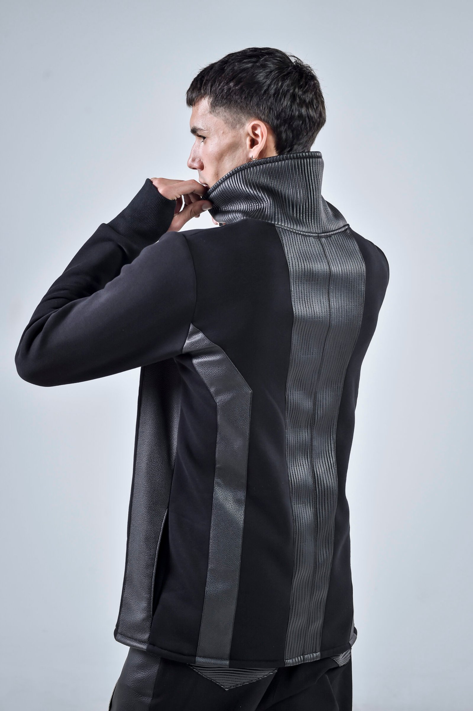 The high collar design provides both protection and a striking visual statement, while the sleek vertical faux leather panels add depth, structure, and a futuristic silhouette. Designed for comfort and durability, the Quasar Jacket features hidden side pockets for practicality without compromising the clean aesthetic.