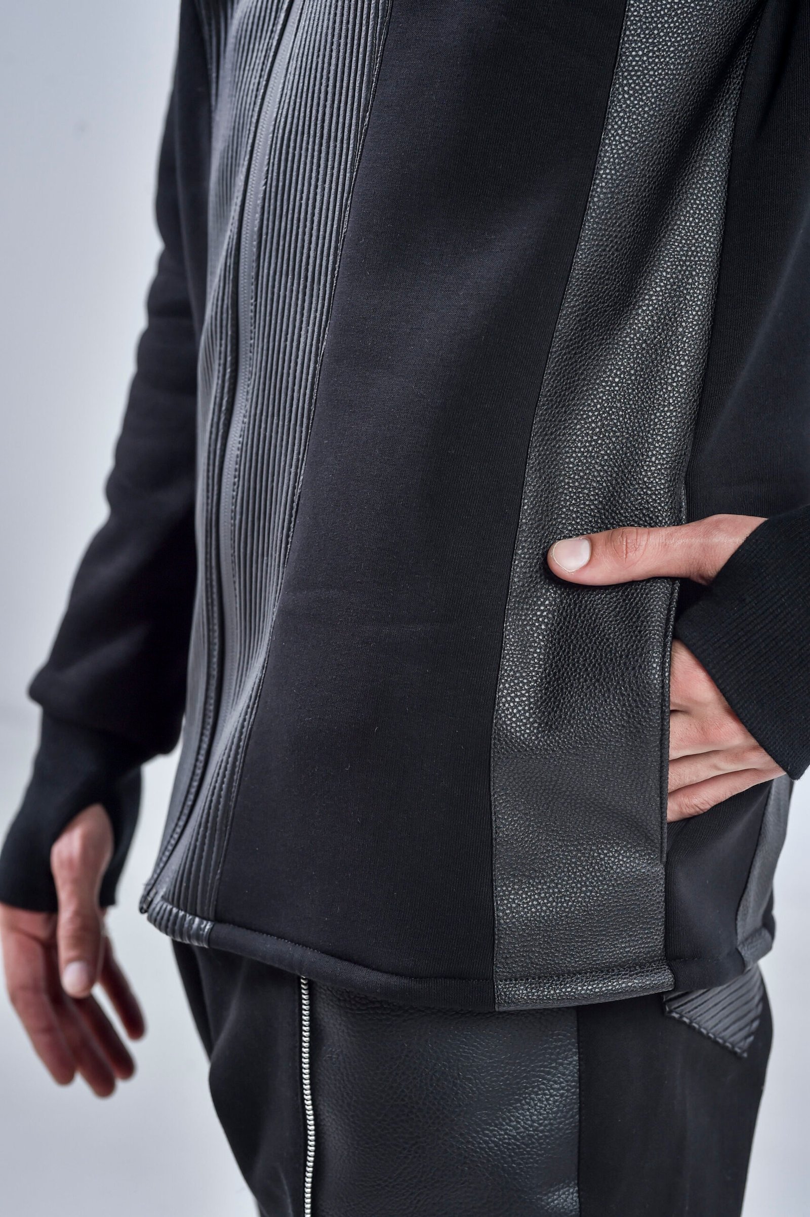 Embrace the evolution of menswear with the Quasar Jacket, a bold fusion of modern design and dystopian edge. Crafted from thick premium cotton and enhanced with two contrasting faux leather textures, this black jacket redefines contemporary street fashion.