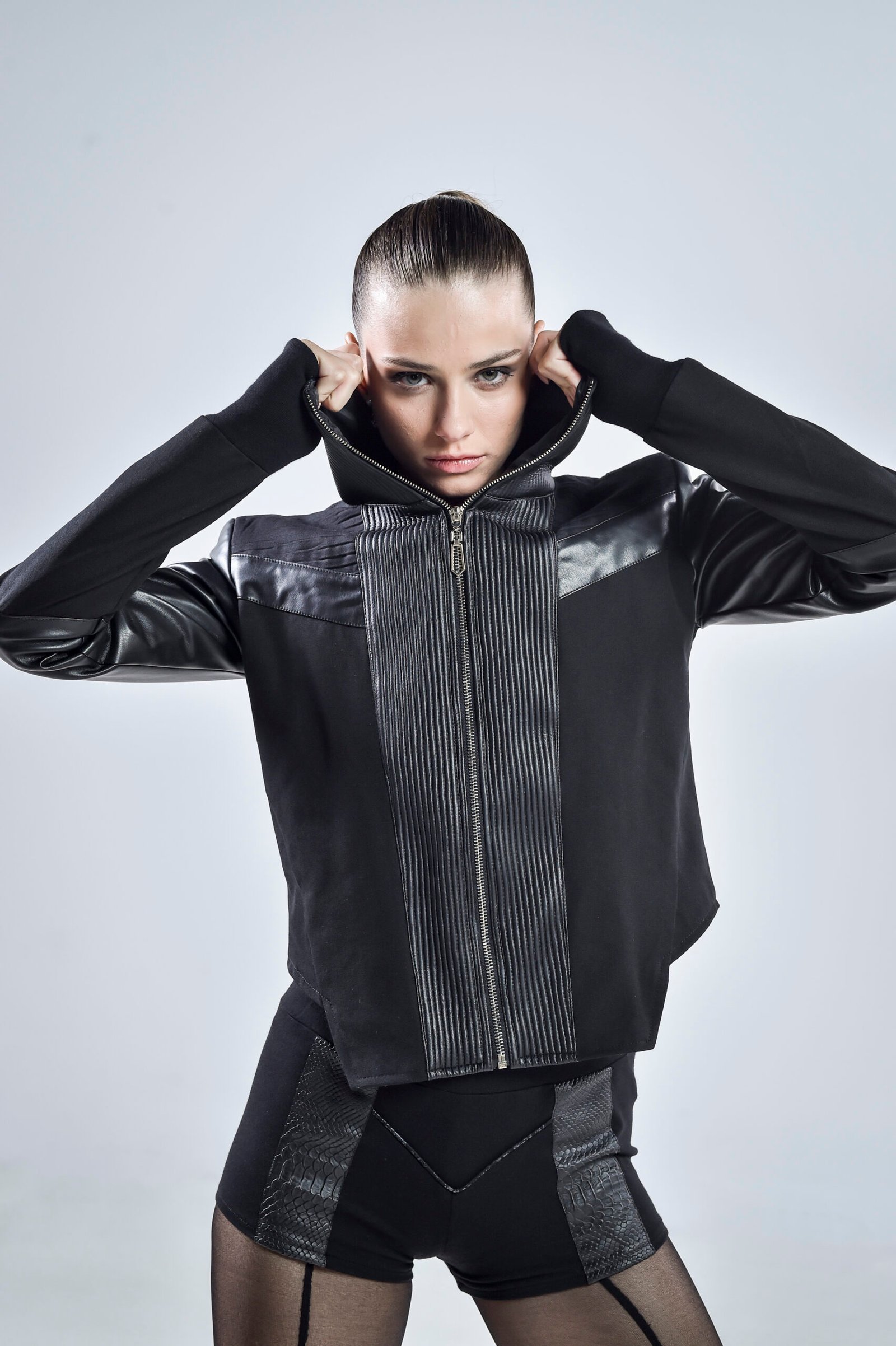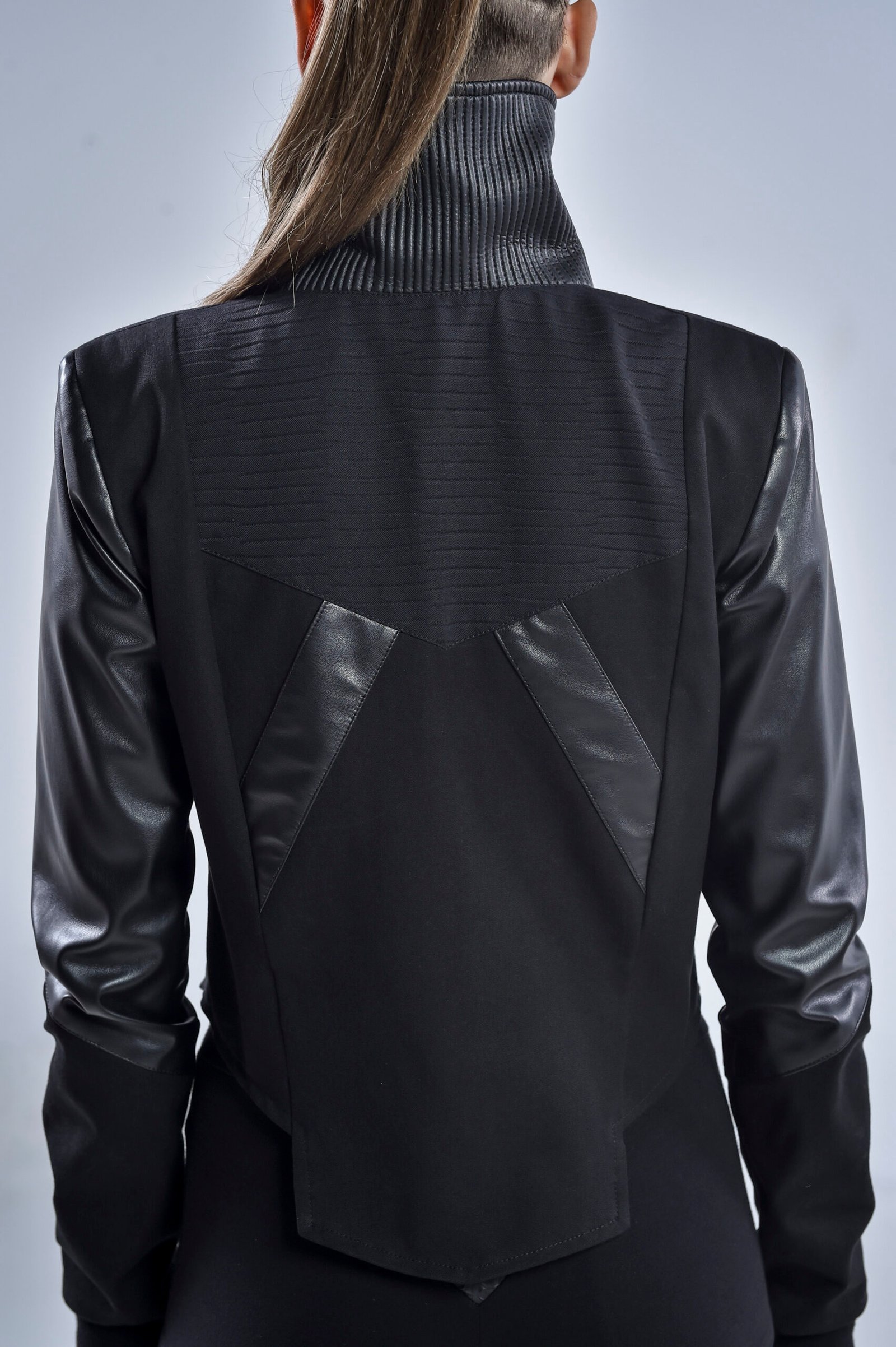 The Silent Orbit Jacket is where black fashion meets futuristic clothing design. Made from premium gabardine fabric and finished with bold faux leather details, this womenโ€™s black jacket embodies the essence of techwear and dystopian clothing โ€” structured, sleek, and effortlessly powerful.