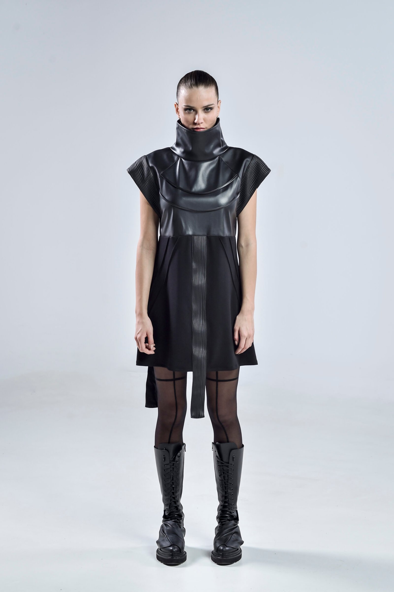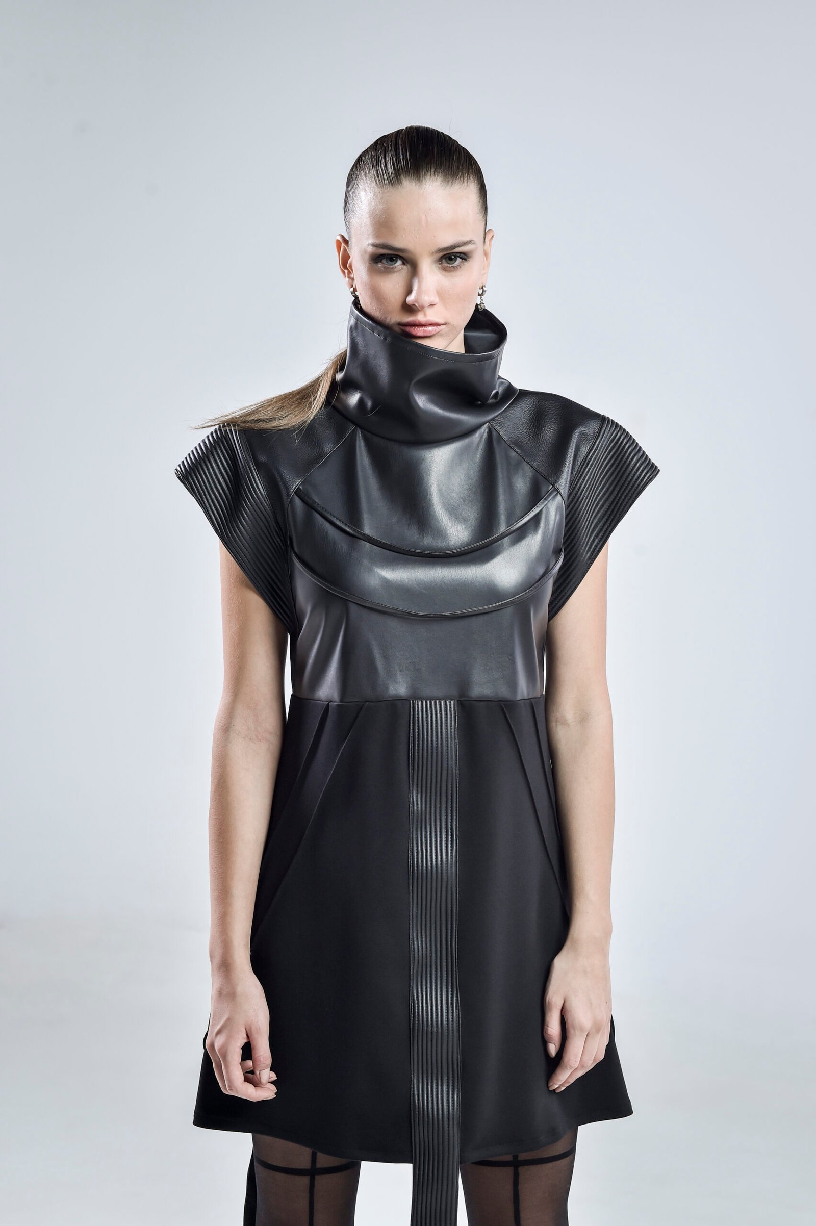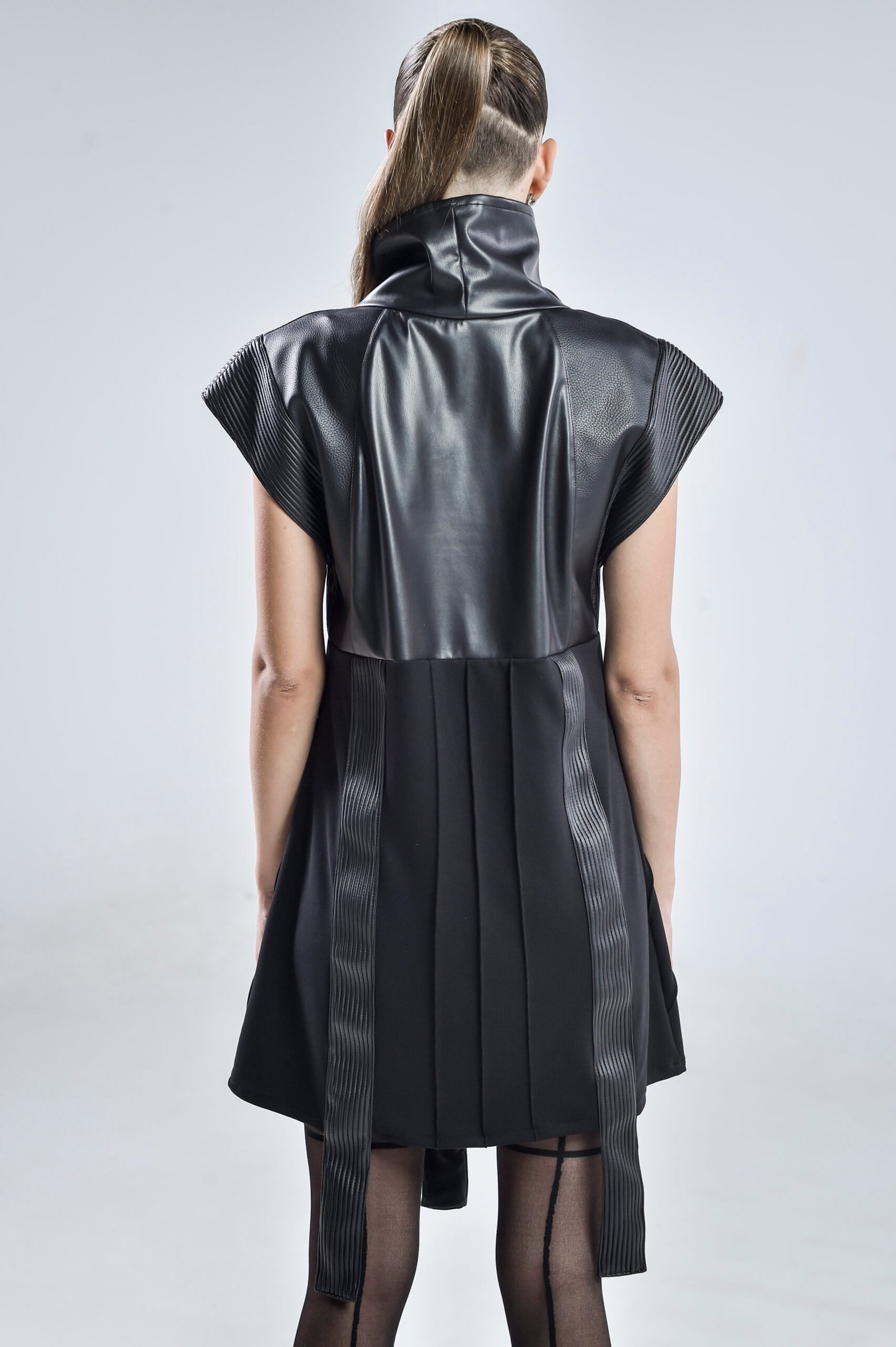 The high structured collar frames the neckline dramatically, while pinch stitch lines and linear faux leather panels create depth and dimension. Three distinct faux leather patterns blend seamlessly to enhance the dressโs futuristic silhouette. The sleeveless design features wide, open, linear-edged short sleeves, emphasizing strength and geometry for a truly cyberpunk-inspired aesthetic.
