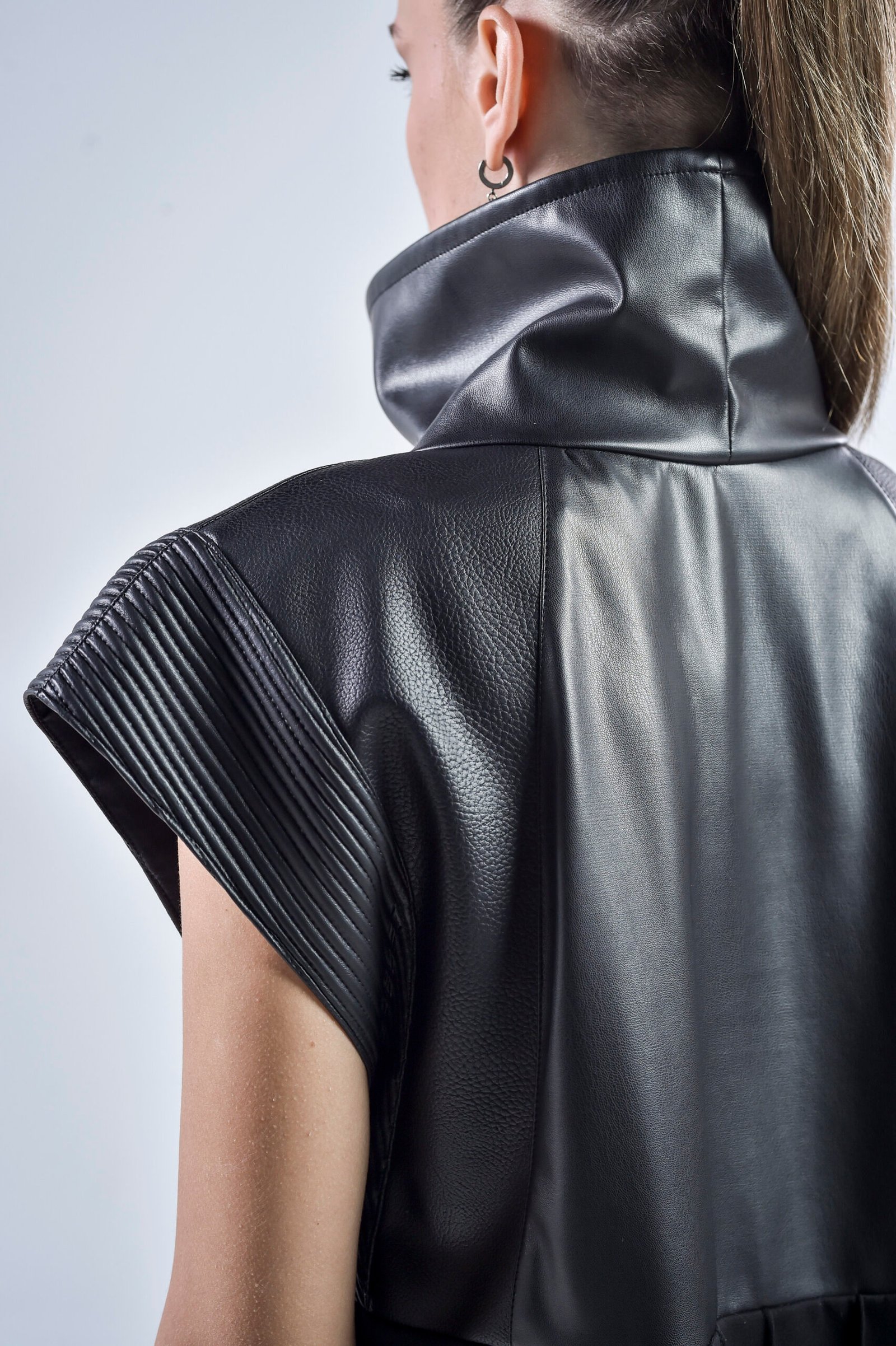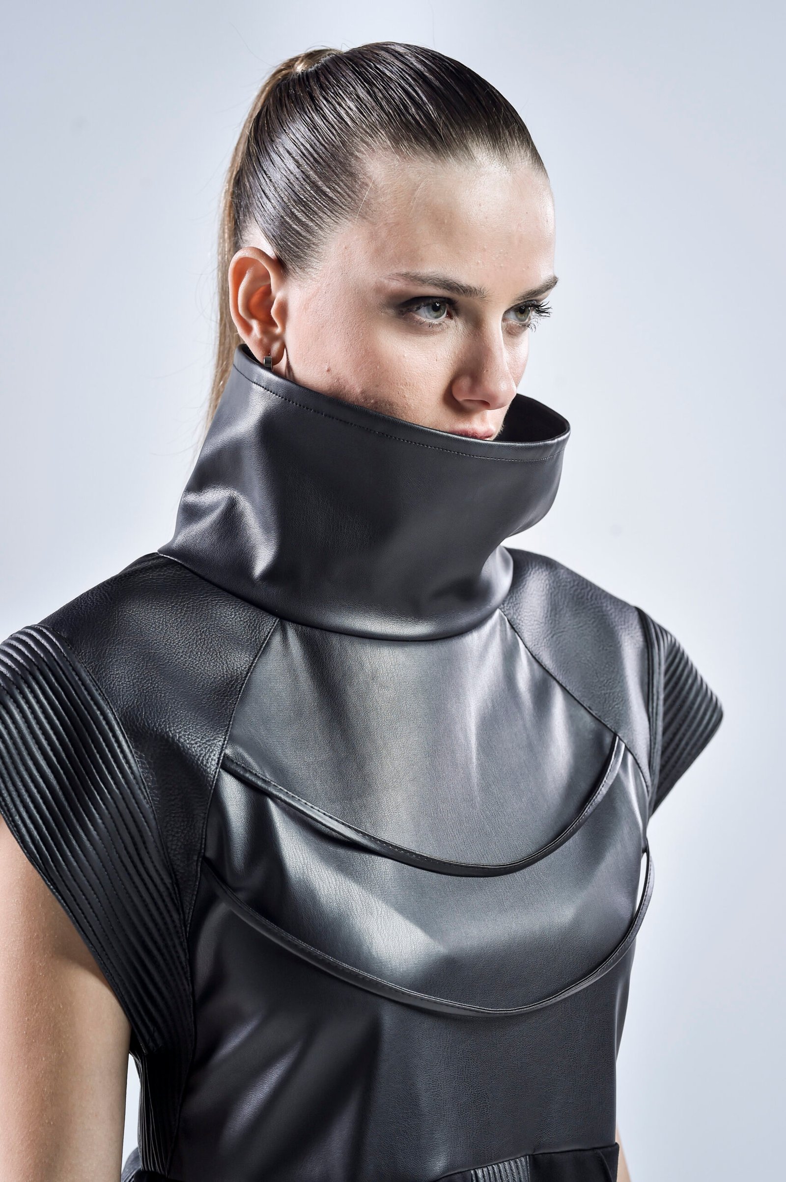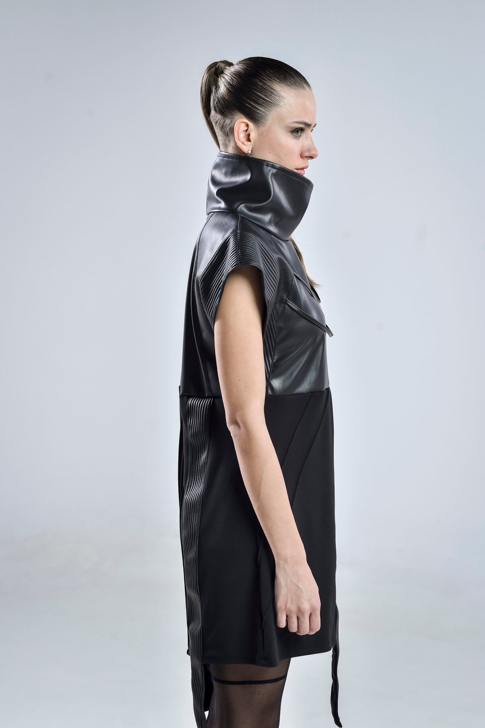 The high structured collar frames the neckline dramatically, while pinch stitch lines and linear faux leather panels create depth and dimension. Three distinct faux leather patterns blend seamlessly to enhance the dressโs futuristic silhouette. The sleeveless design features wide, open, linear-edged short sleeves, emphasizing strength and geometry for a truly cyberpunk-inspired aesthetic.