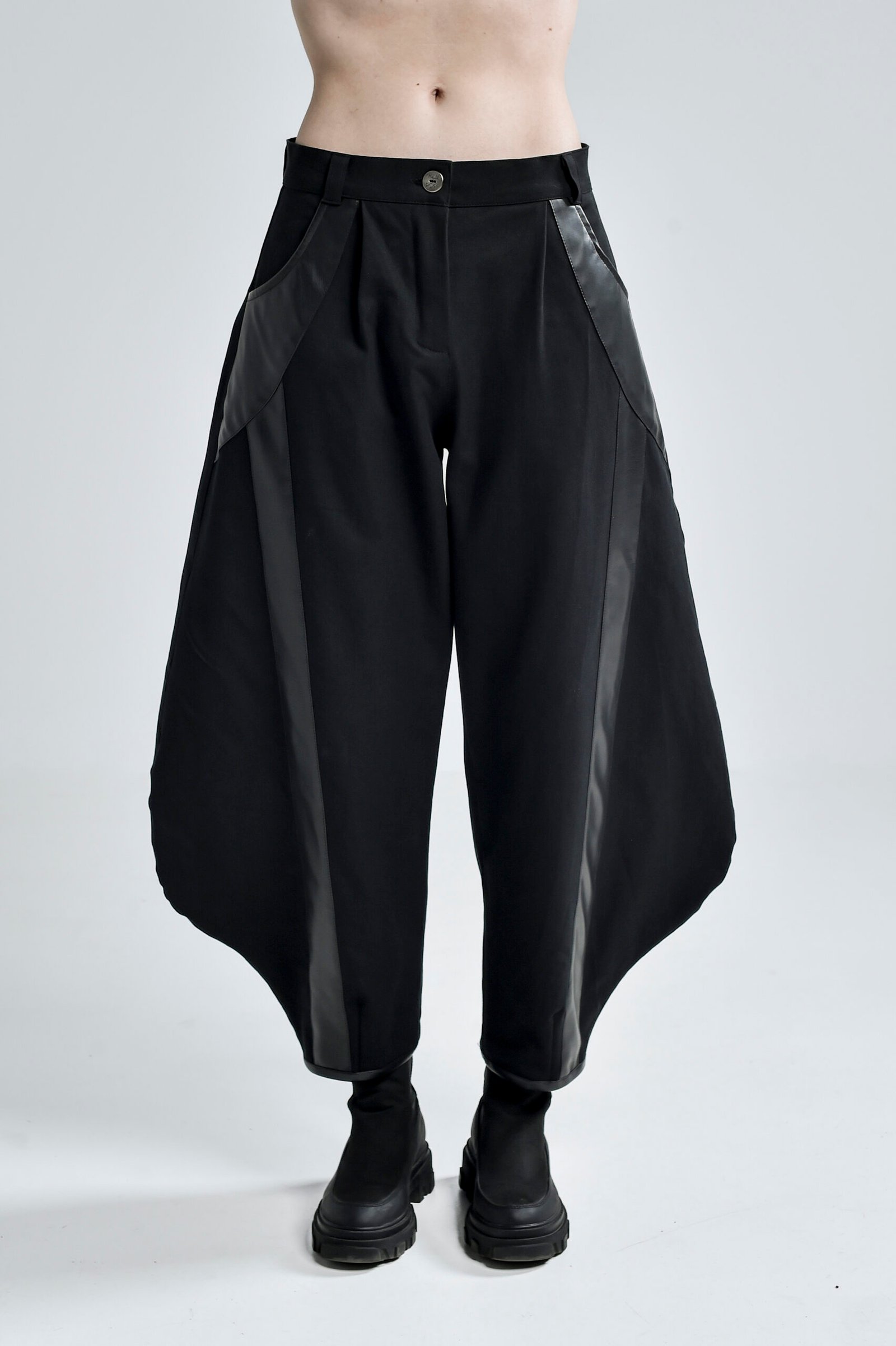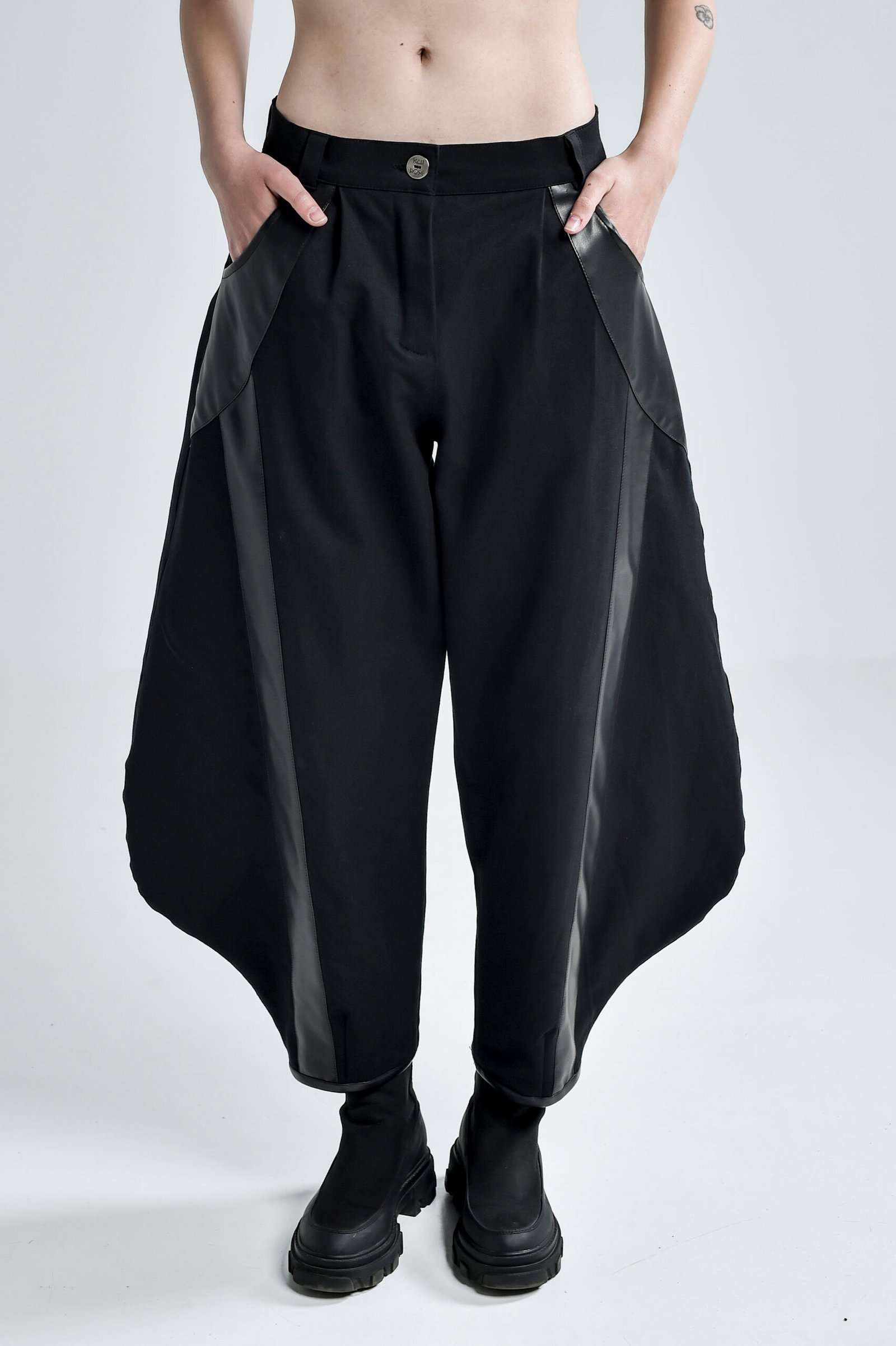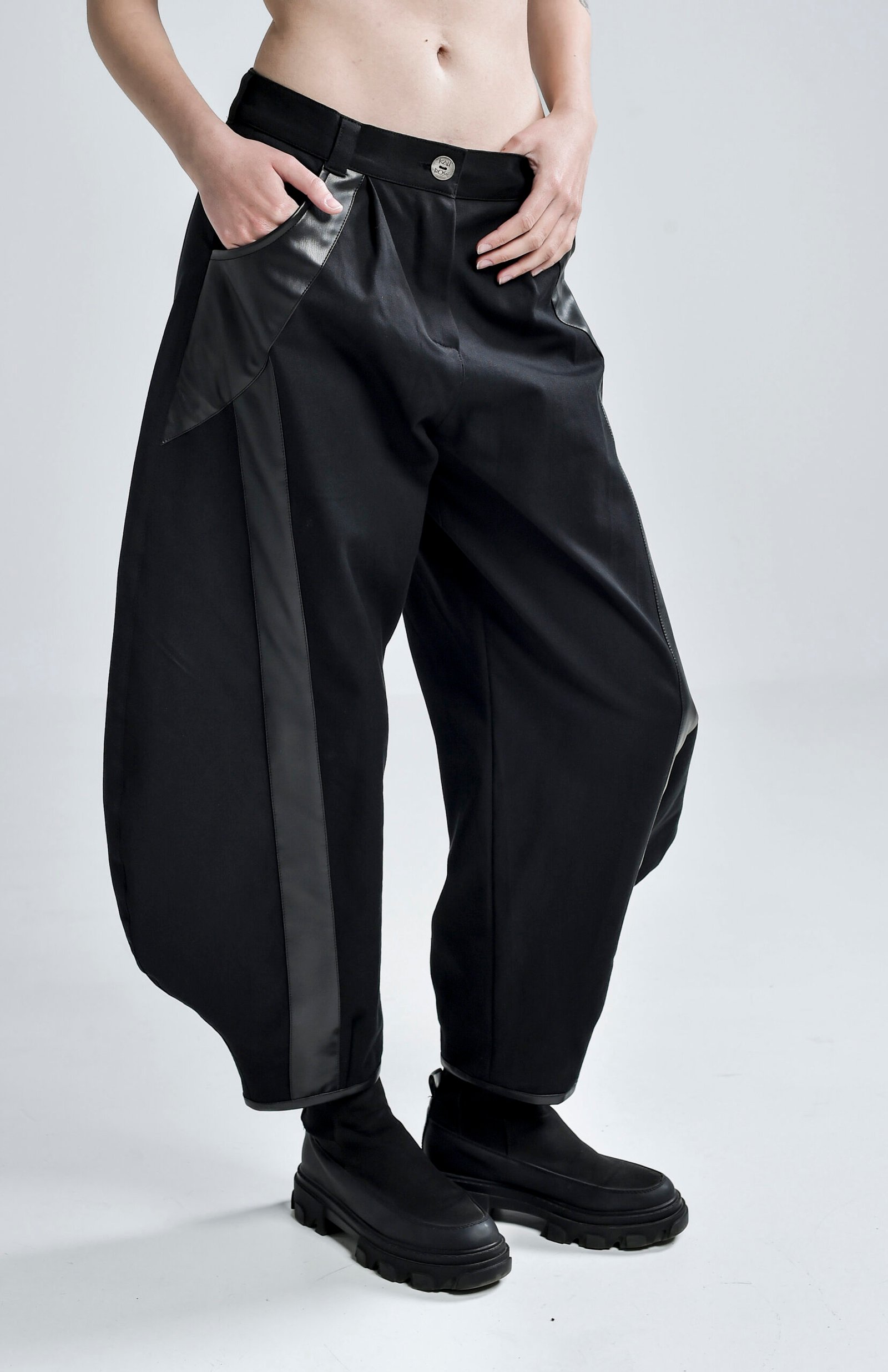 The wide, rounded leg shape creates movement with every step, giving the pants a dynamic presence while remaining grounded and wearable. Functional details like a clean waistband and pockets keep the piece practical without interrupting the design.