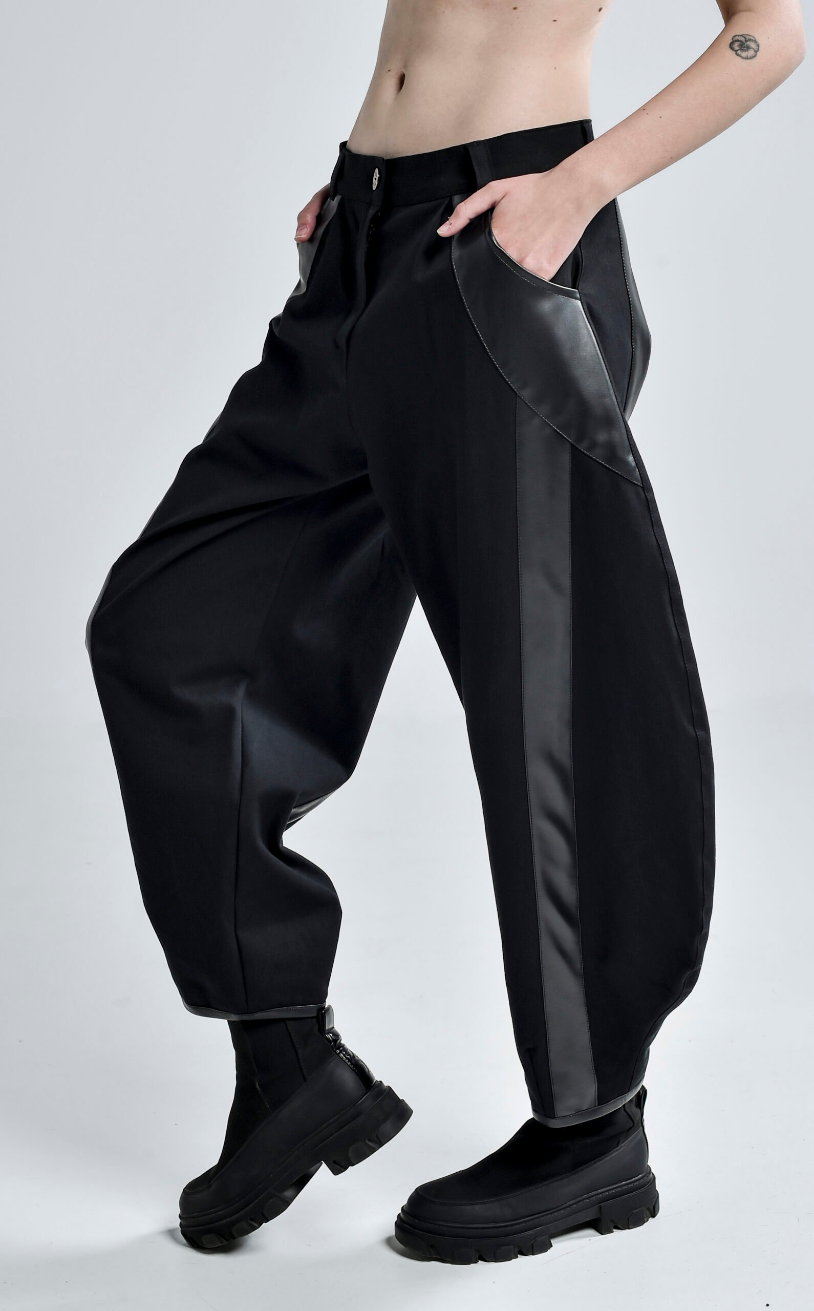 Crafted from structured gabardine, the silhouette expands into a bold, sculptural form while maintaining control and clean lines. Vertical faux leather stripes run through the design, adding contrast, elongation, and a sharp, modern edge.