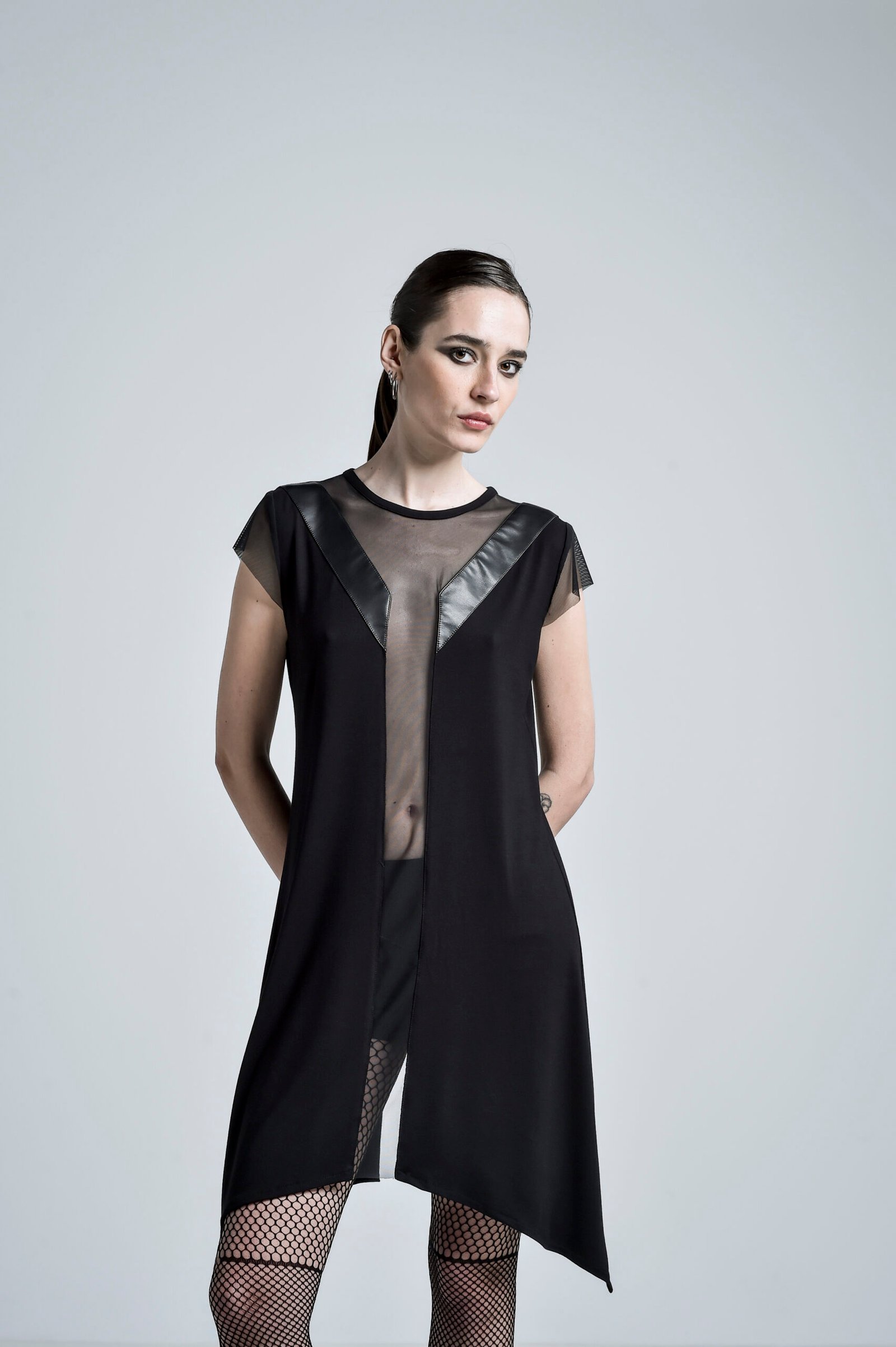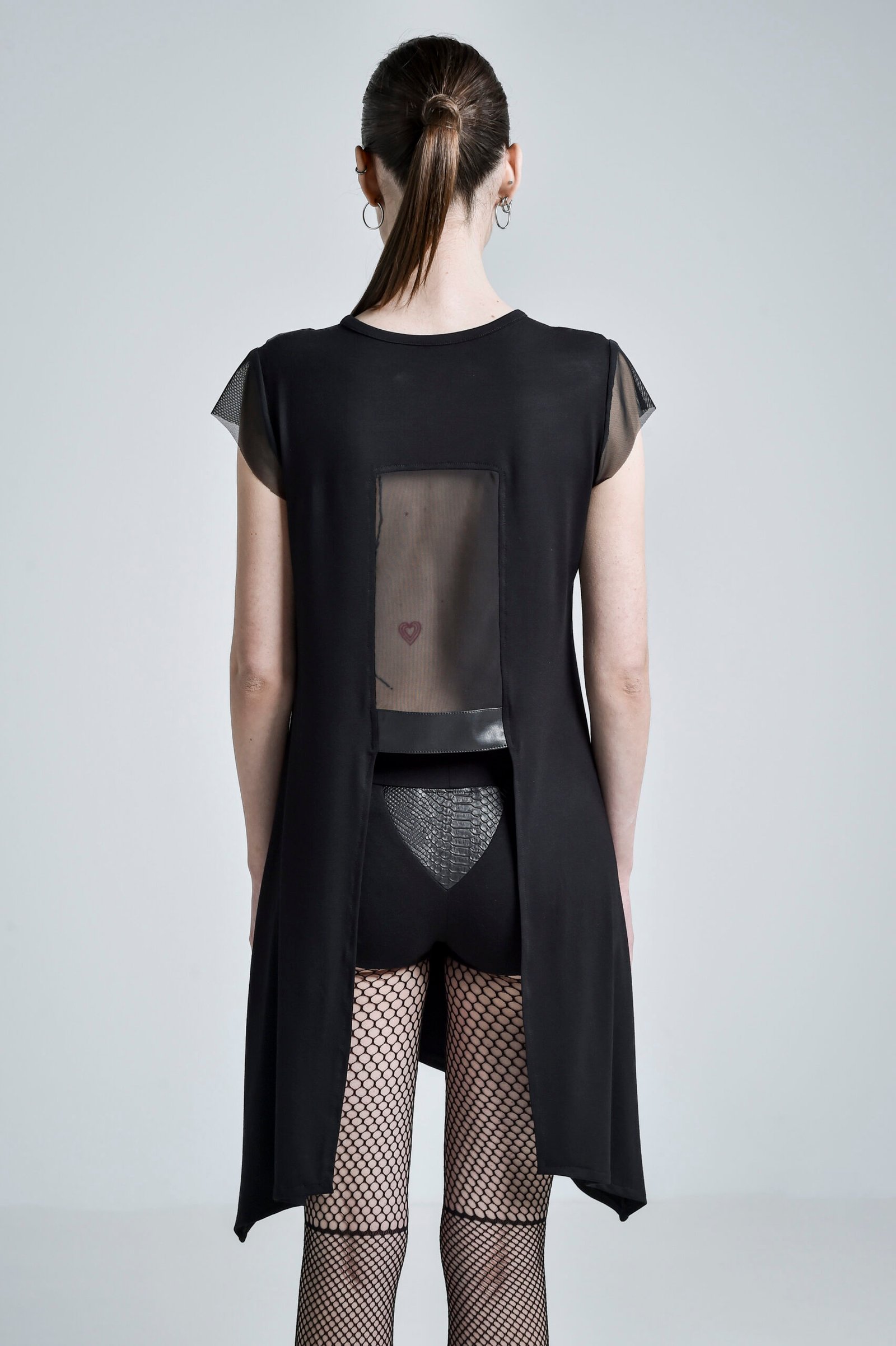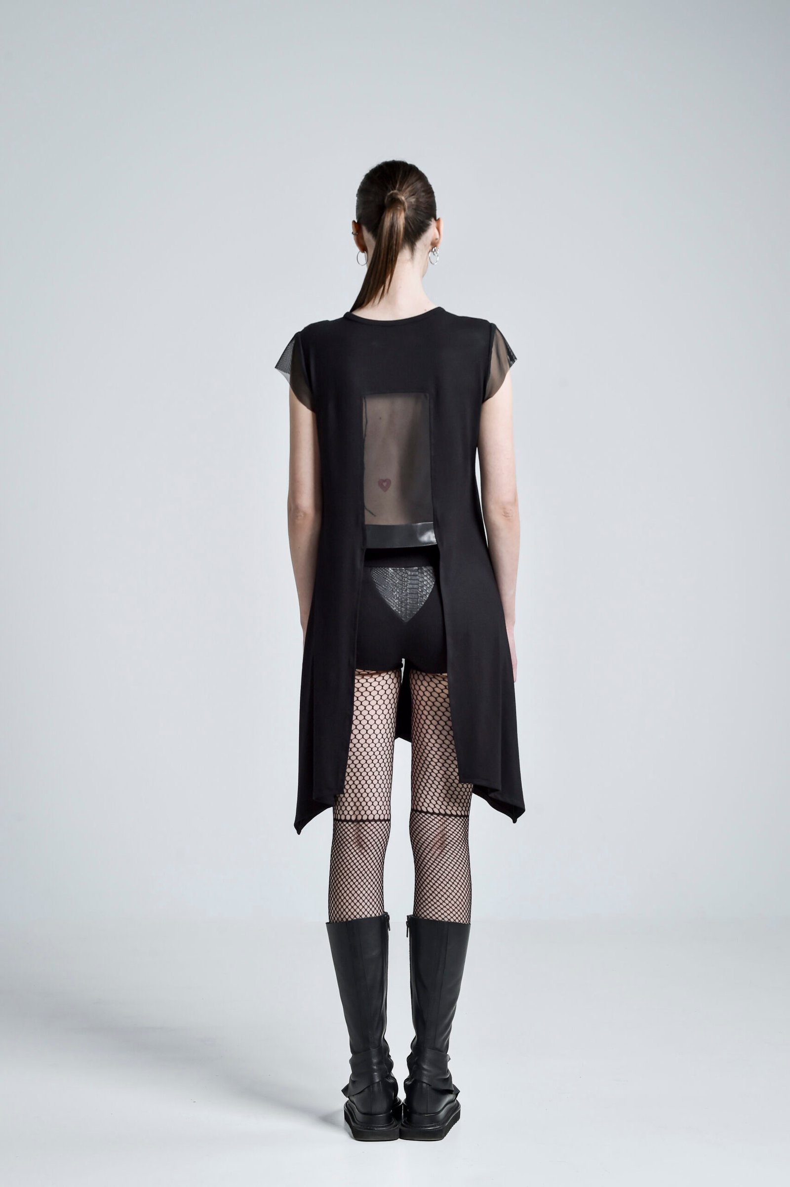 Crafted from lightweight viscose and sheer mesh, the tunic features a layered construction that visually “unfolds” as you move. The central mesh panel introduces transparency, while bold faux leather stripes frame the body, adding contrast and a subtle techno-inspired structure.