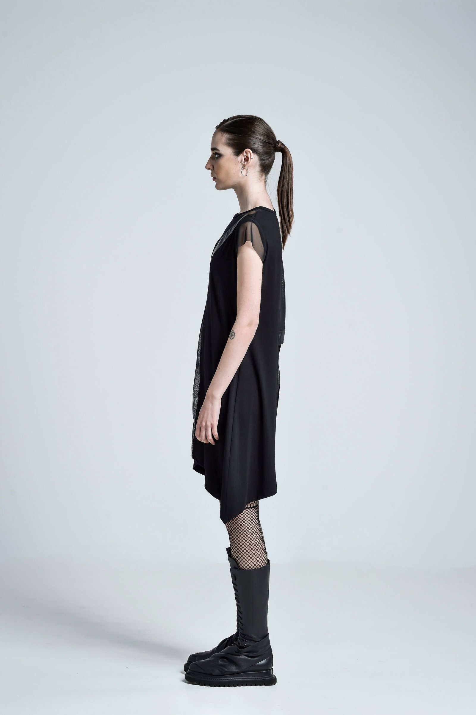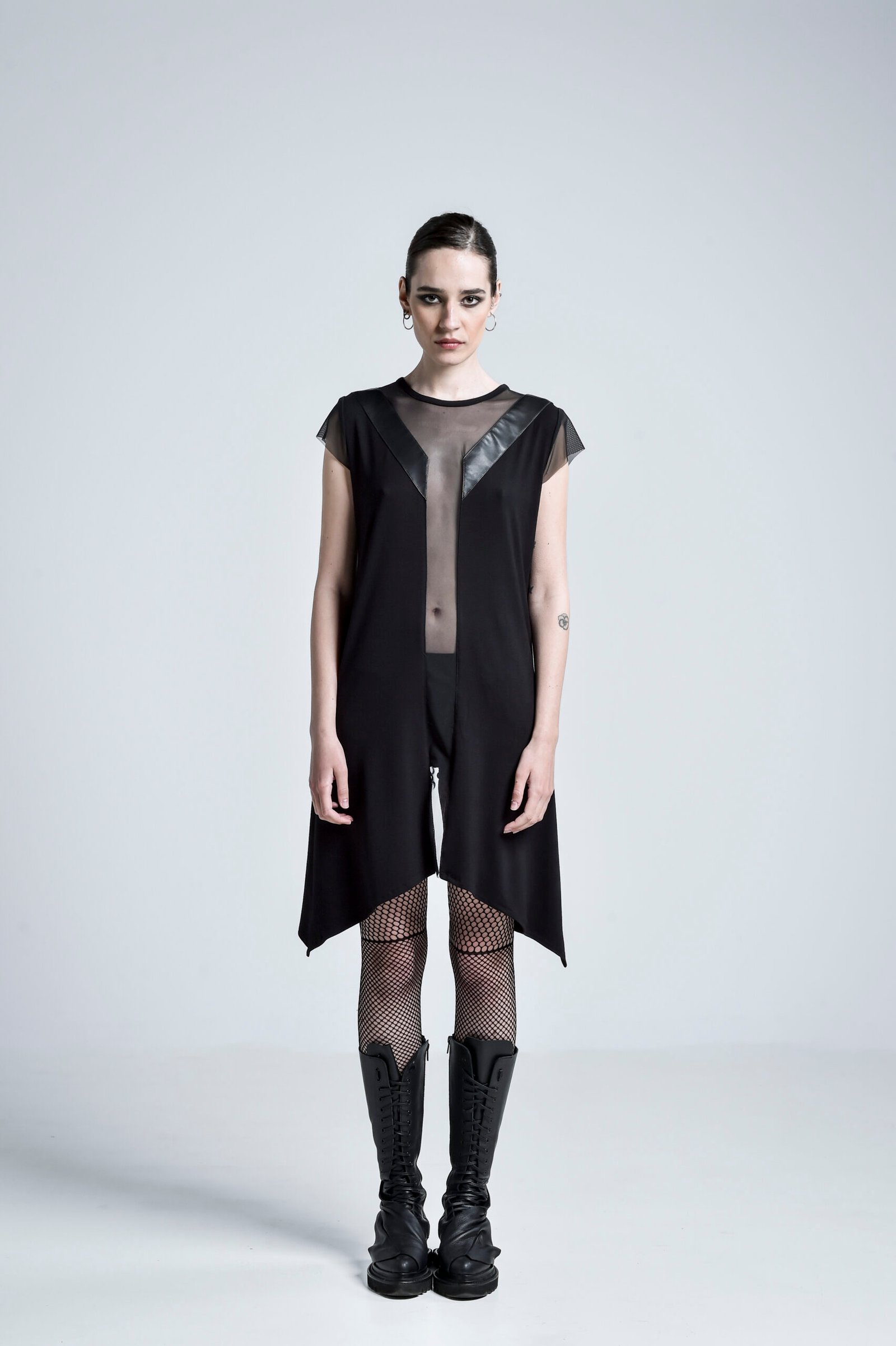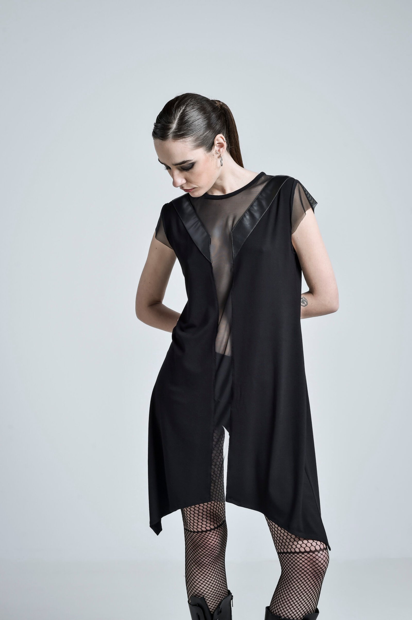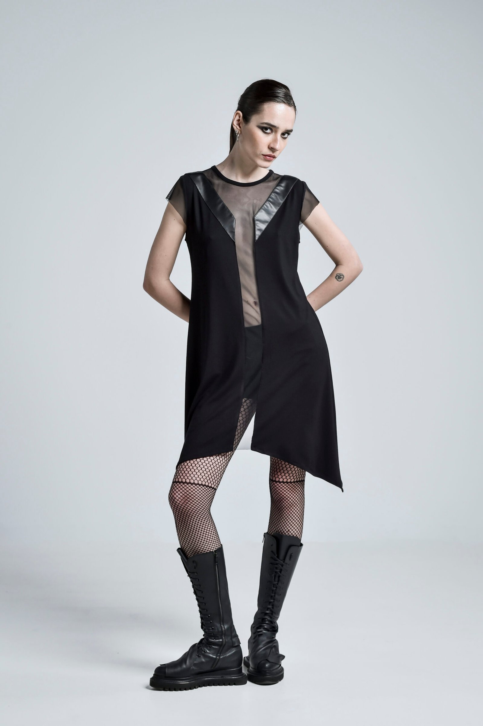 Crafted from lightweight viscose and sheer mesh, the tunic features a layered construction that visually “unfolds” as you move. The central mesh panel introduces transparency, while bold faux leather stripes frame the body, adding contrast and a subtle techno-inspired structure.