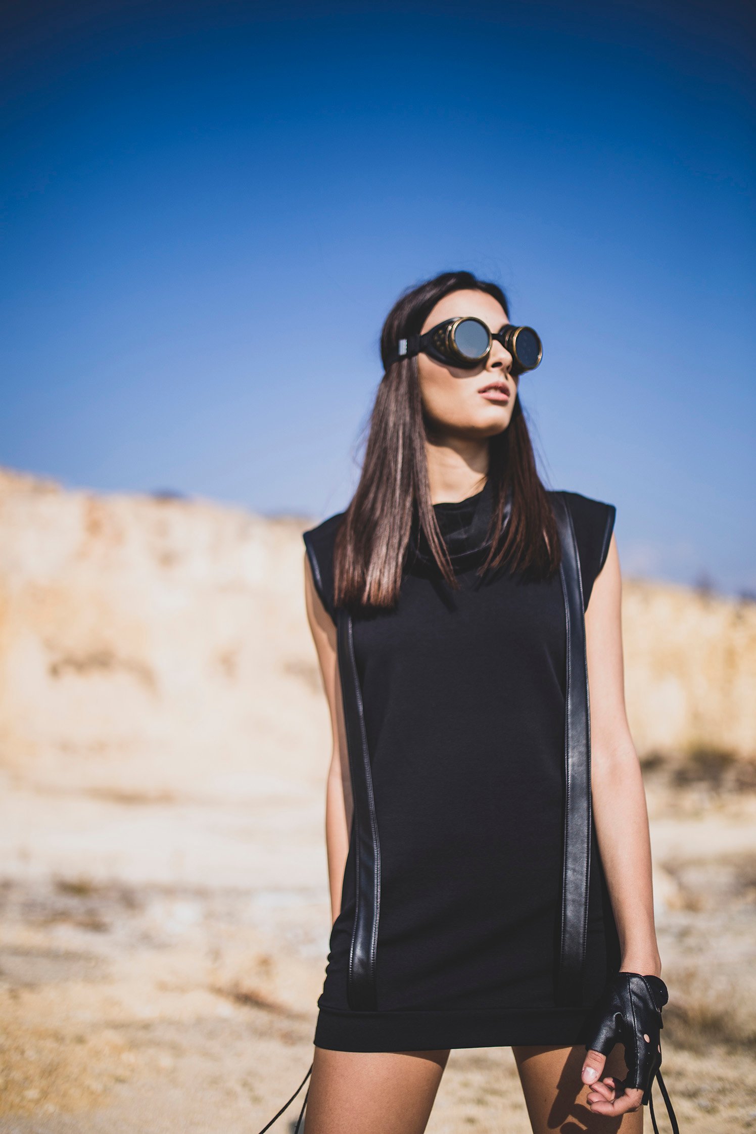 Cotton lycra top dress designed with faux leather stripes back and front. High collar.