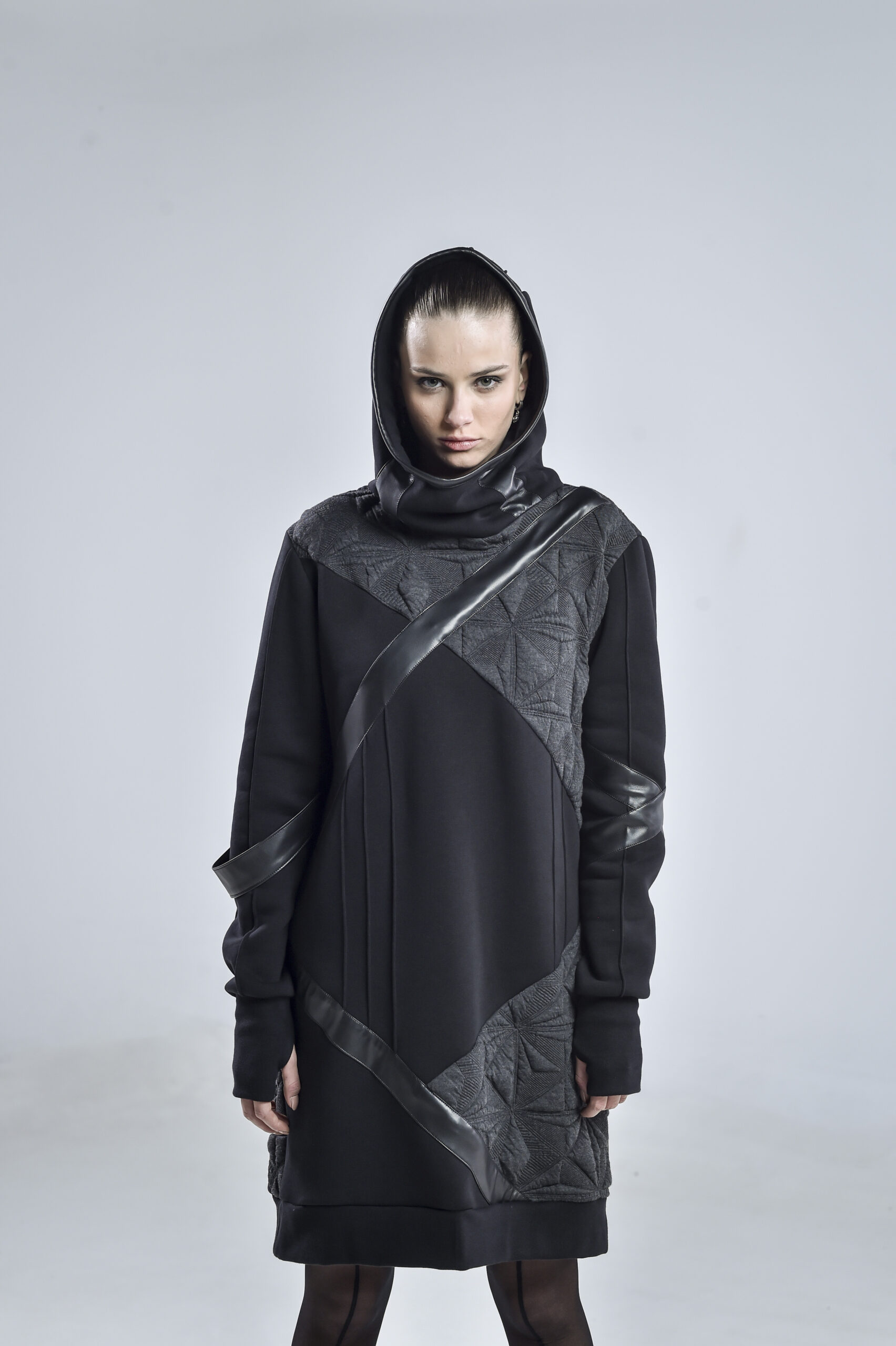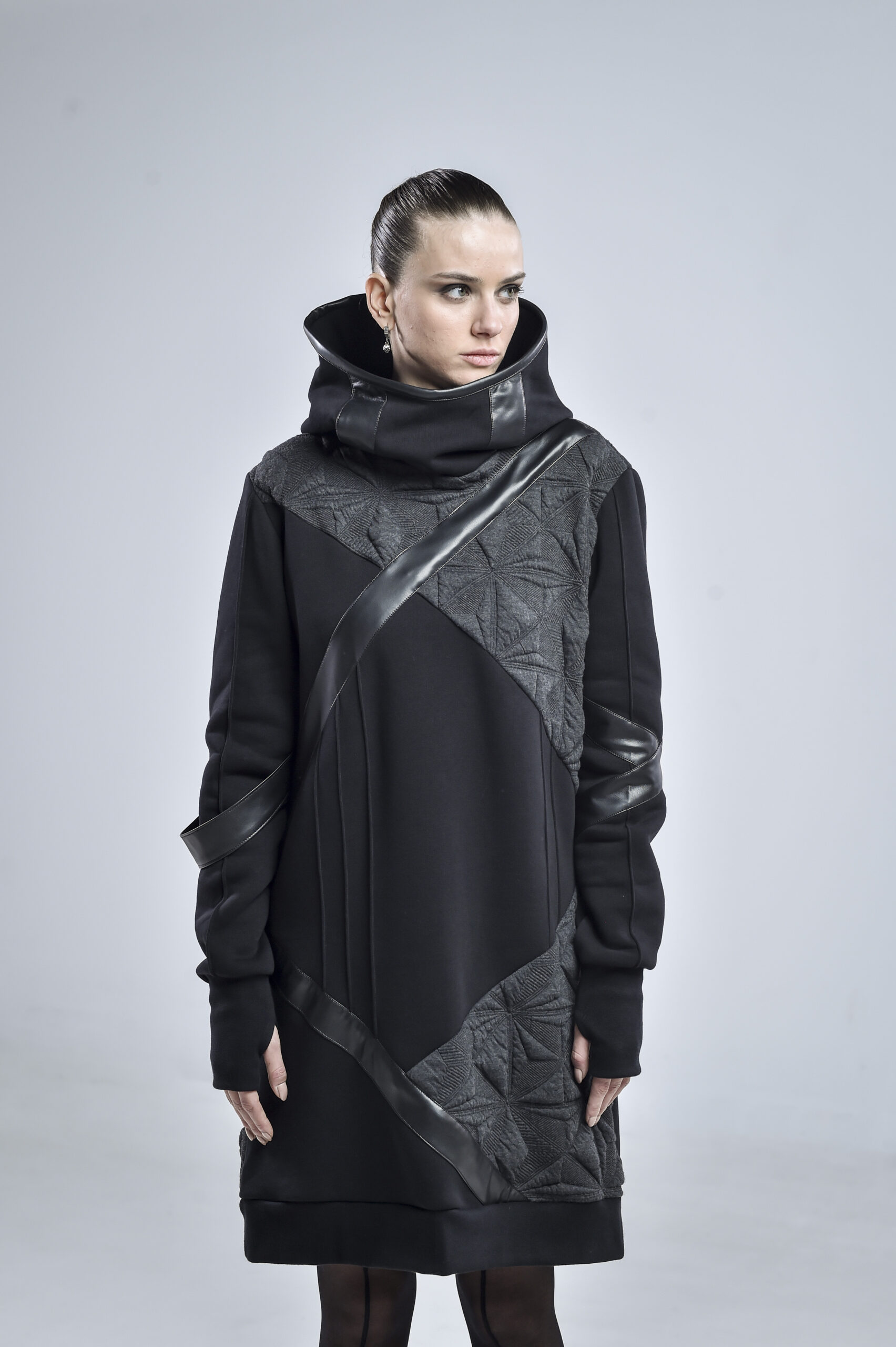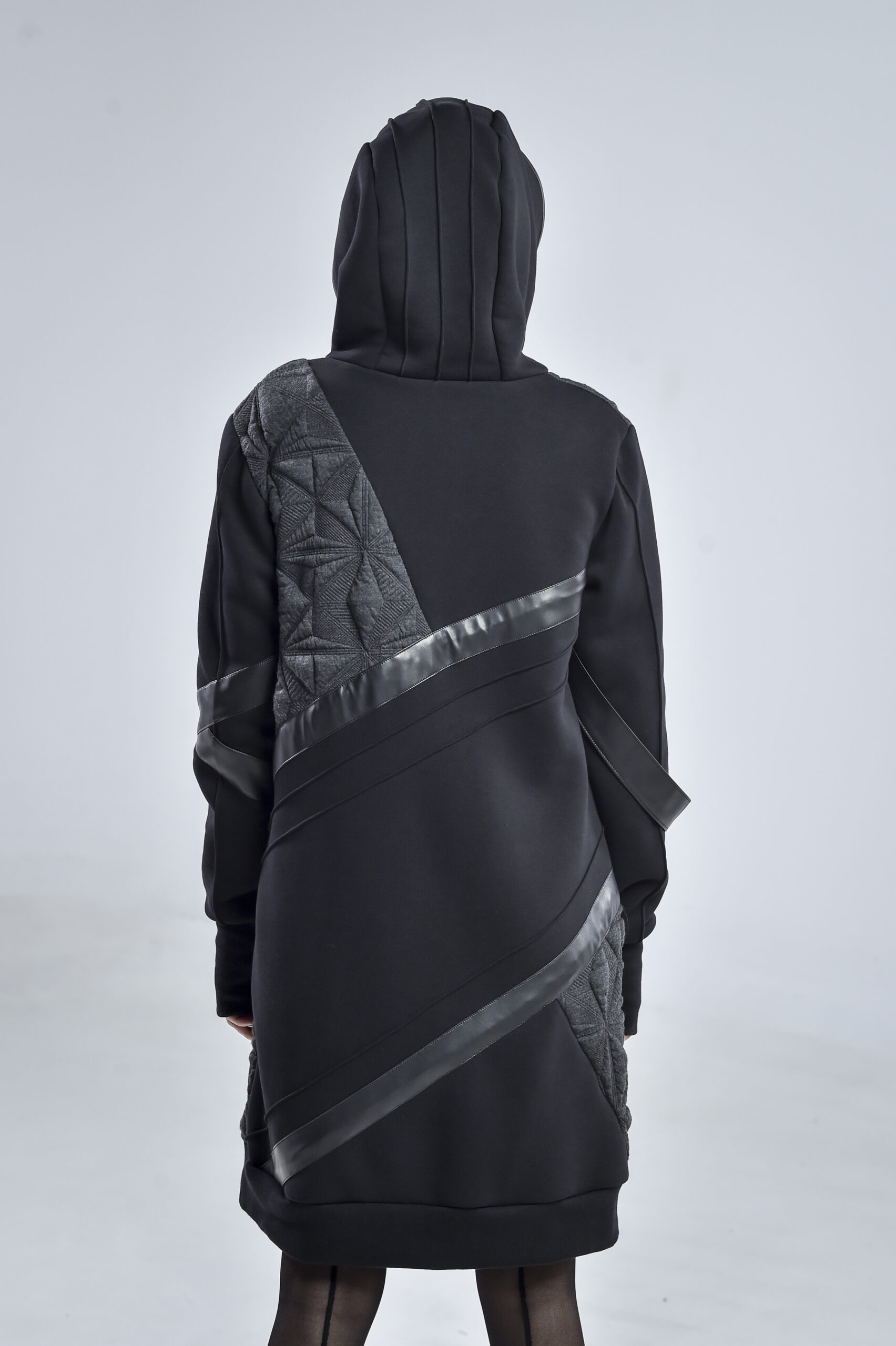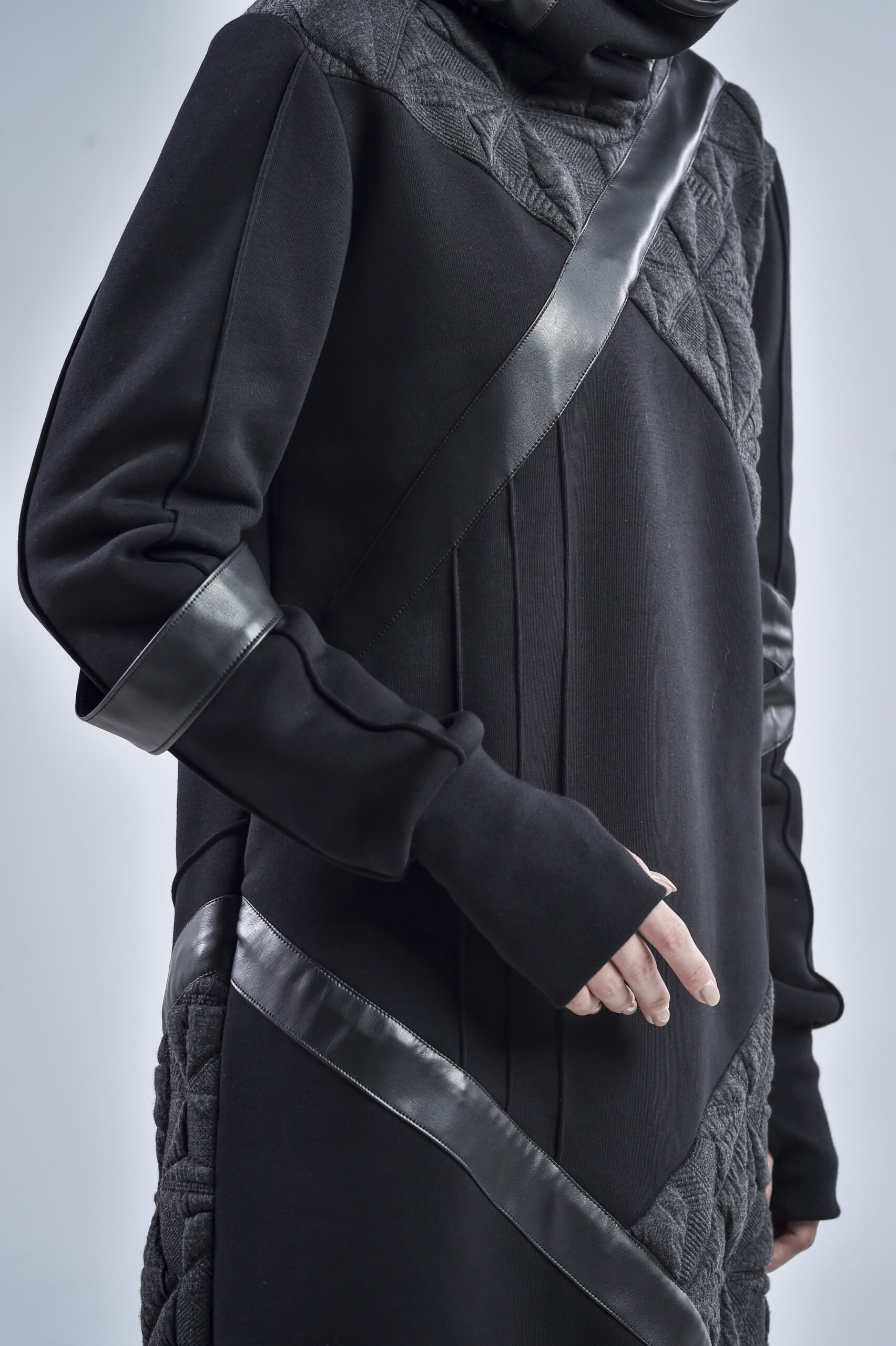 The geometric gray fabric, featuring pinch stitch lines—a hallmark of our signature design—adds depth and architectural structure to the piece. Smooth faux leather stripes run diagonally across the front, back, and one sleeve, infusing a cyberpunk edge and a sense of movement. One of the faux leather stripes falls freely, introducing a fluid, asymmetrical element that enhances the hoodie’s contemporary character.