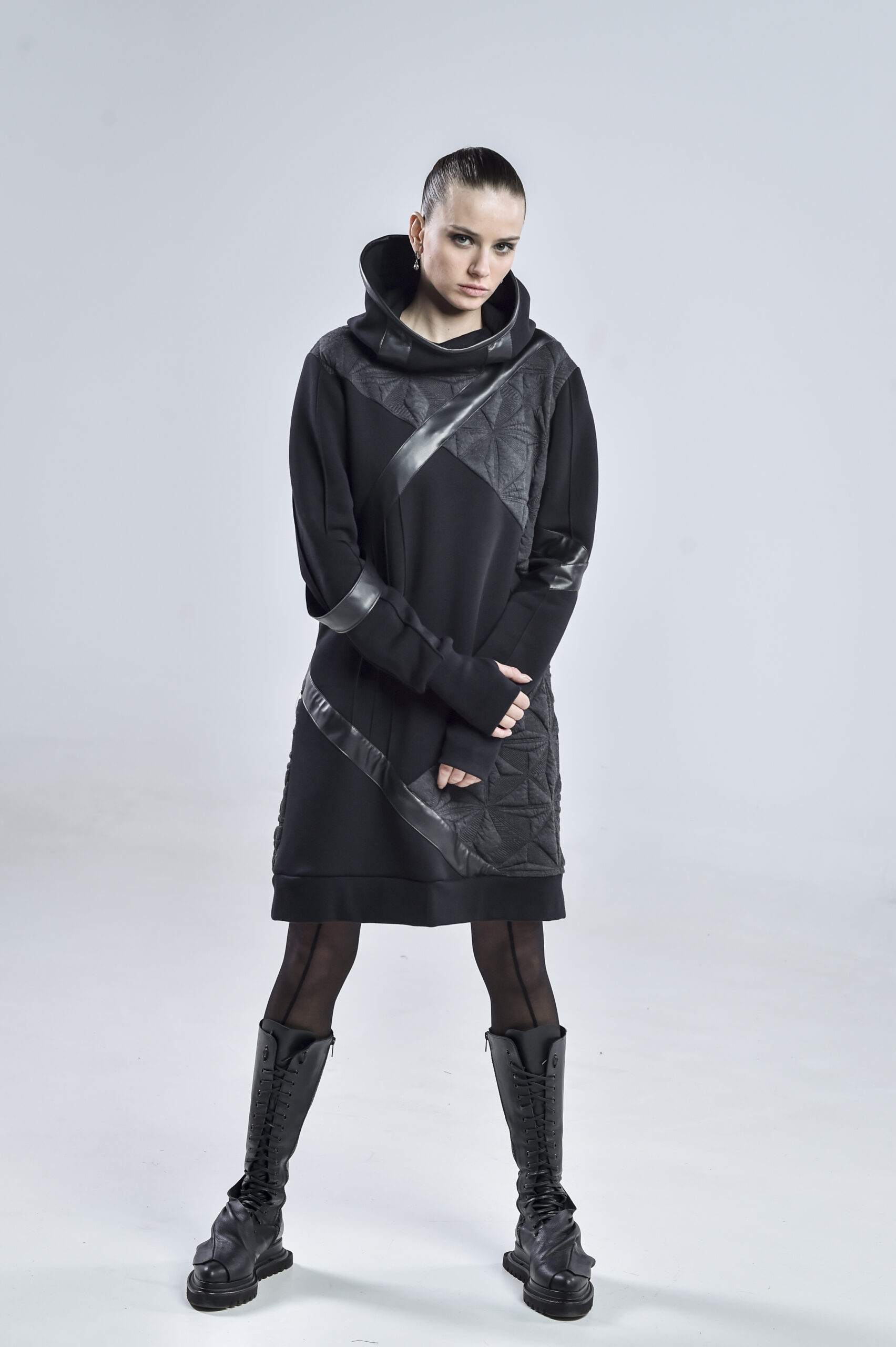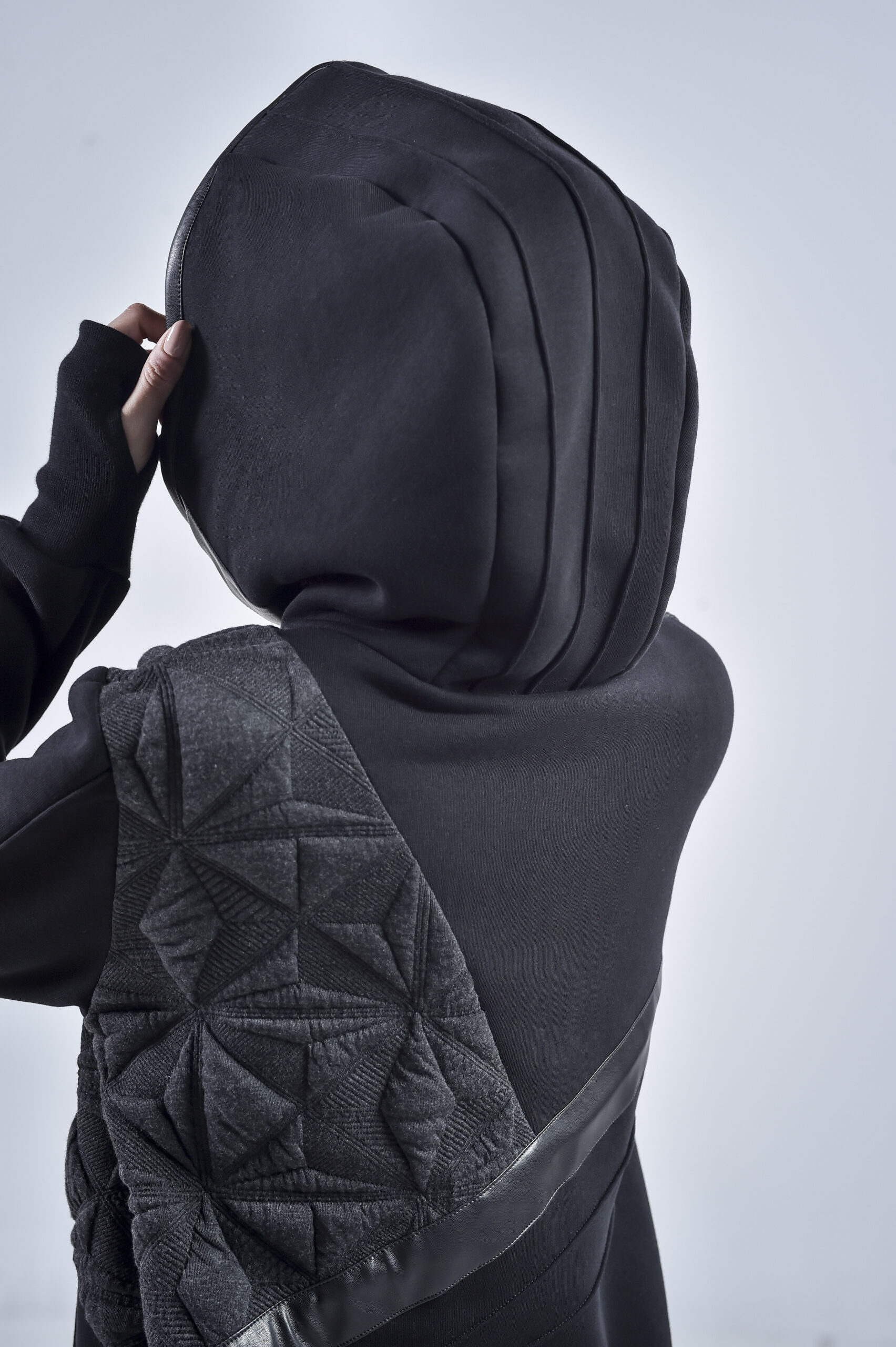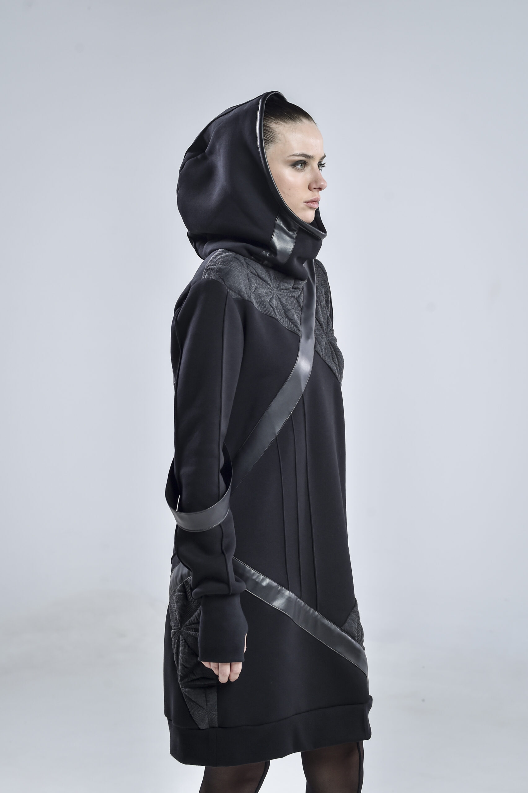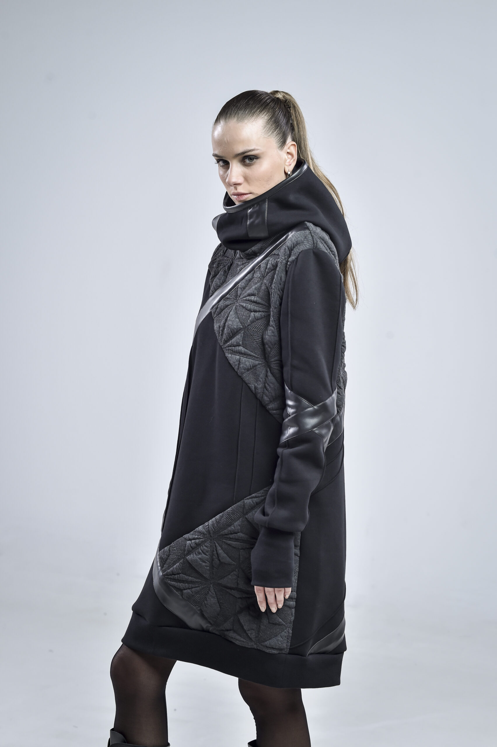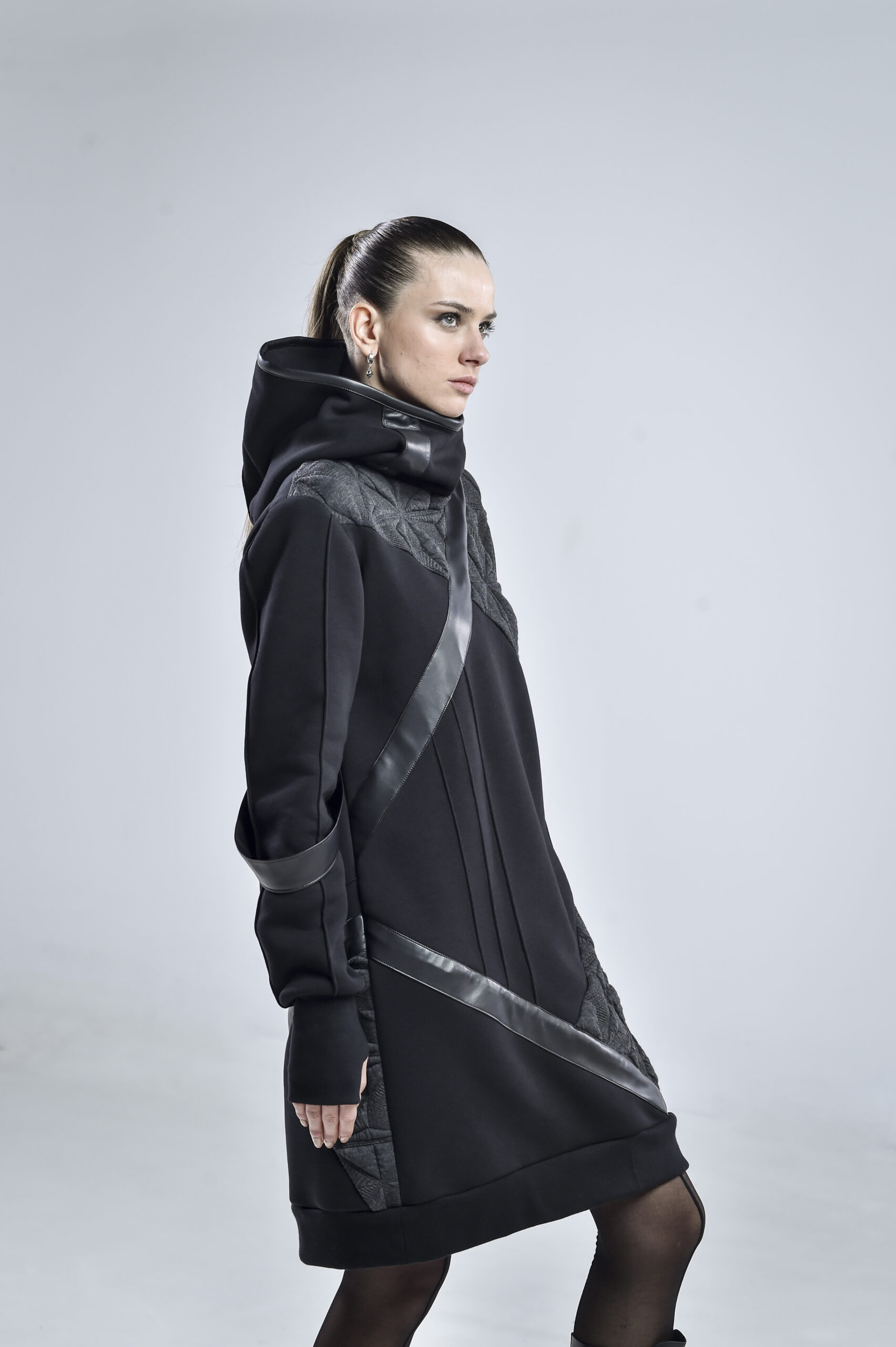 The geometric gray fabric, featuring pinch stitch lines—a hallmark of our signature design—adds depth and architectural structure to the piece. Smooth faux leather stripes run diagonally across the front, back, and one sleeve, infusing a cyberpunk edge and a sense of movement. One of the faux leather stripes falls freely, introducing a fluid, asymmetrical element that enhances the hoodie’s contemporary character.