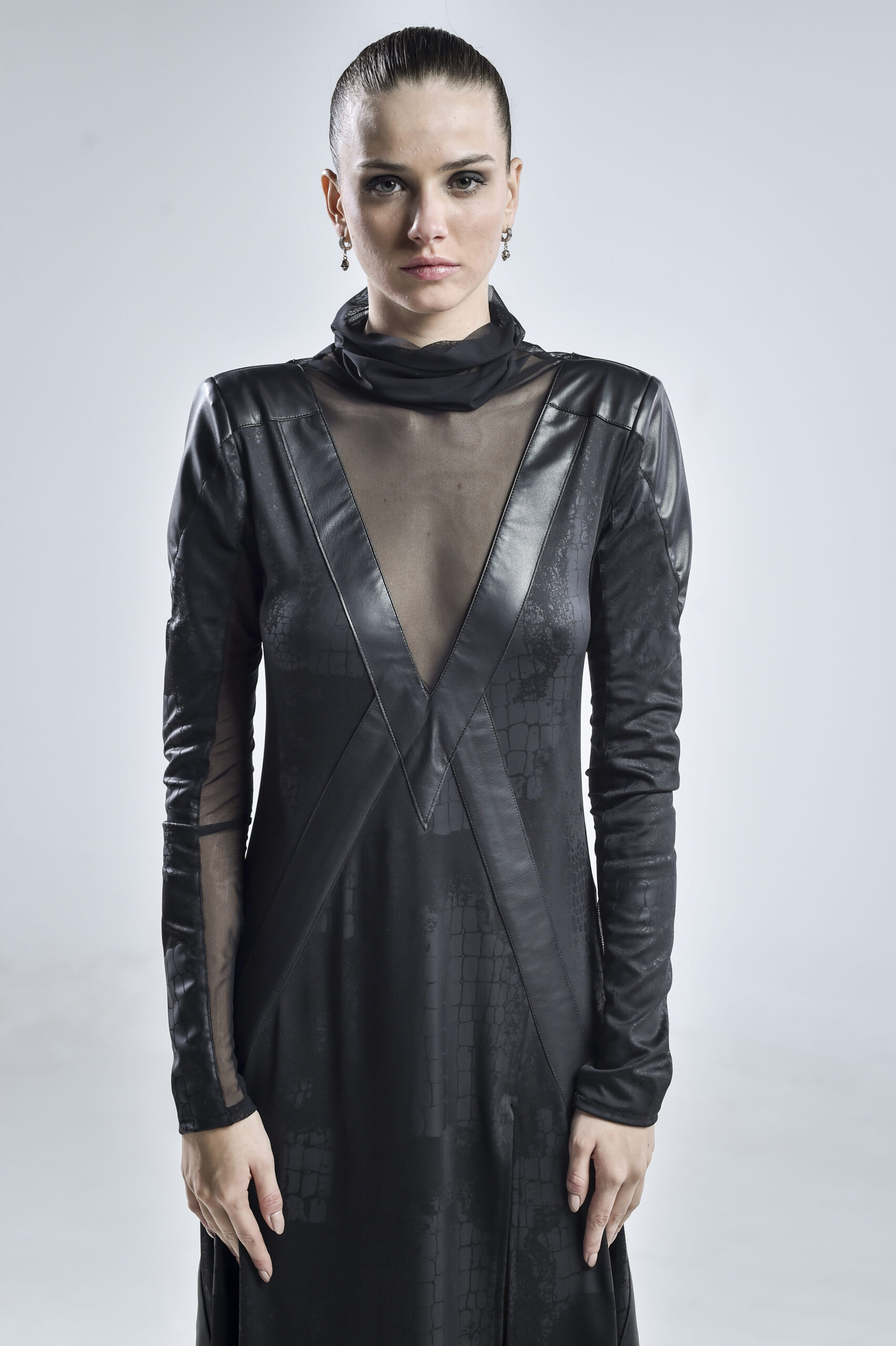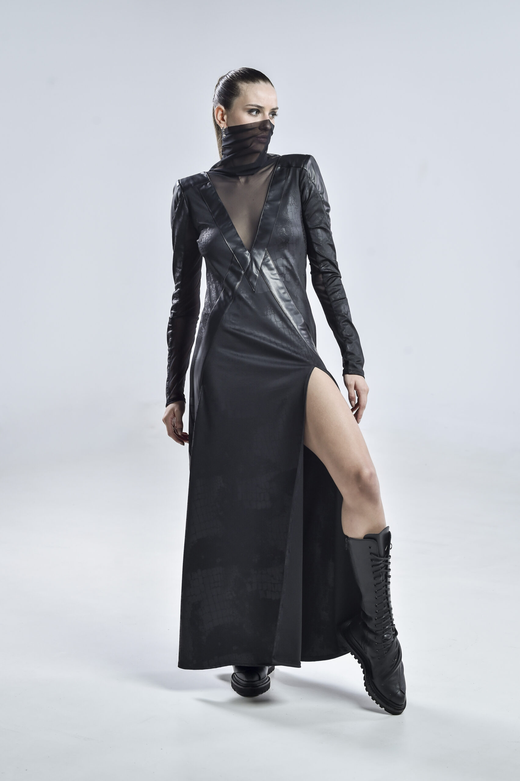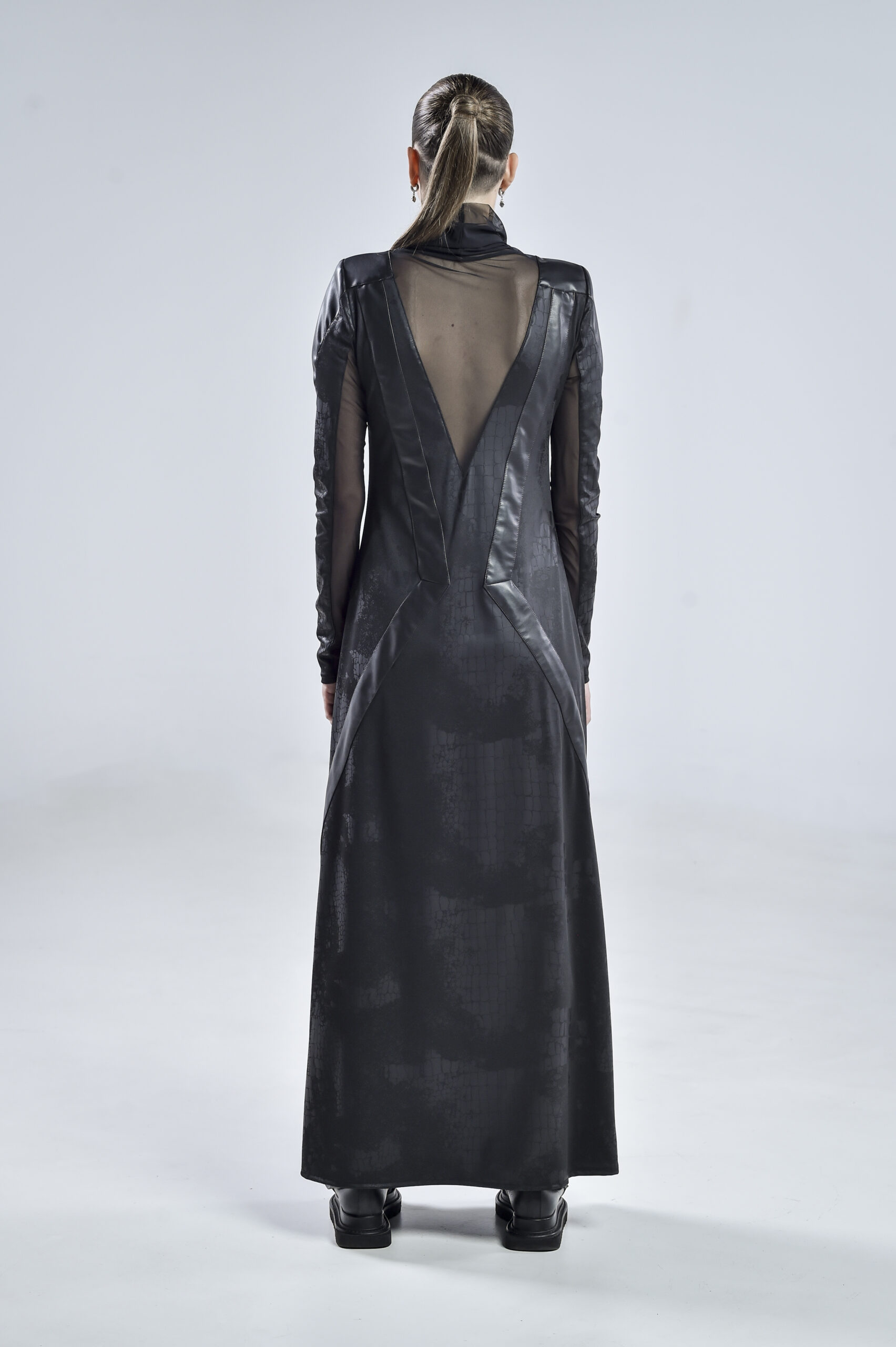 This avantgarde black dress is crafted from georgette, mesh, and faux leather, blending structure and fluidity in perfect tension. The high mesh collar frames the neck with ethereal elegance, while the mesh-lined sleeves and daring high slit reveal just enough to hint at the strength beneath the surface.