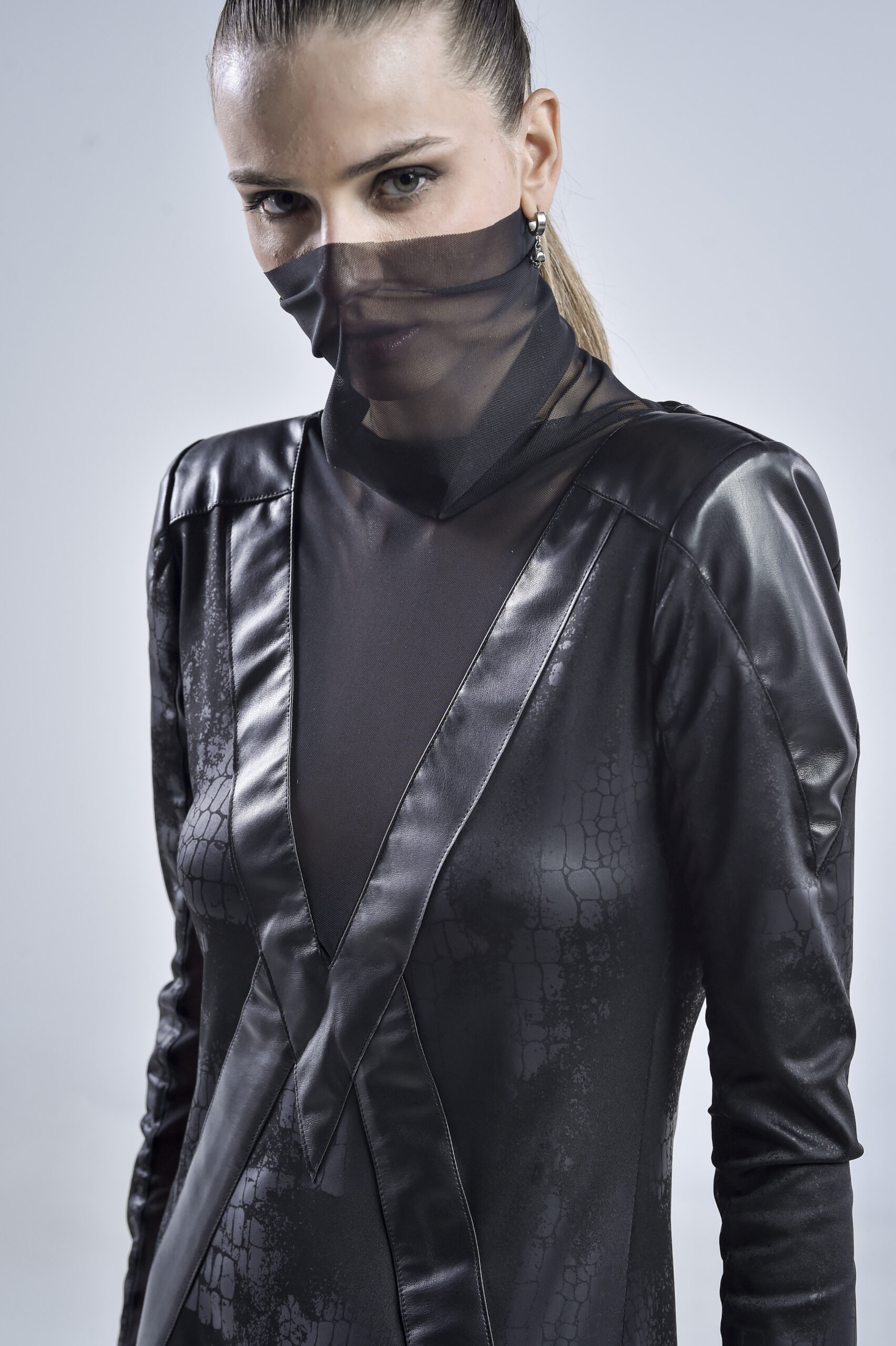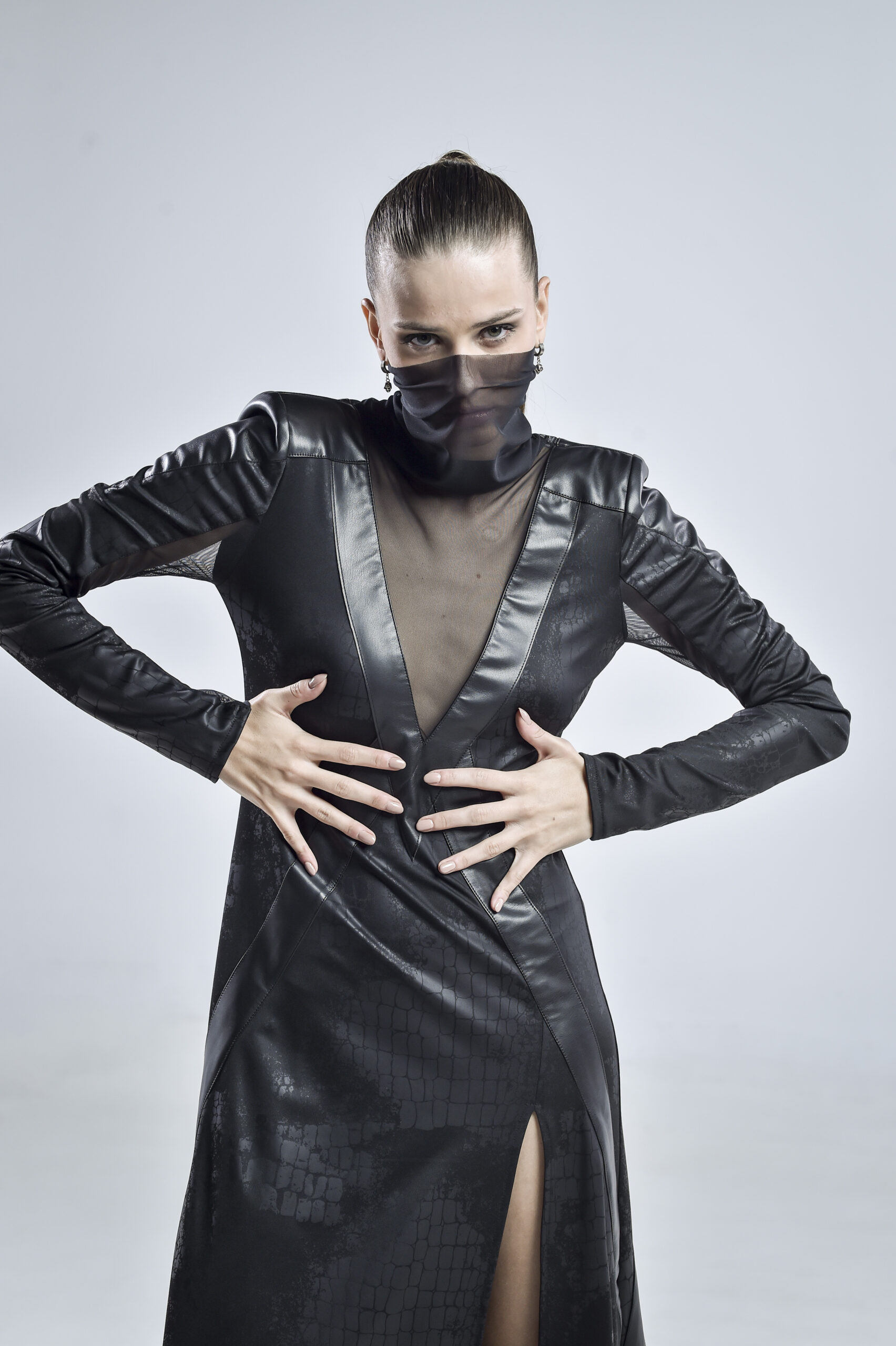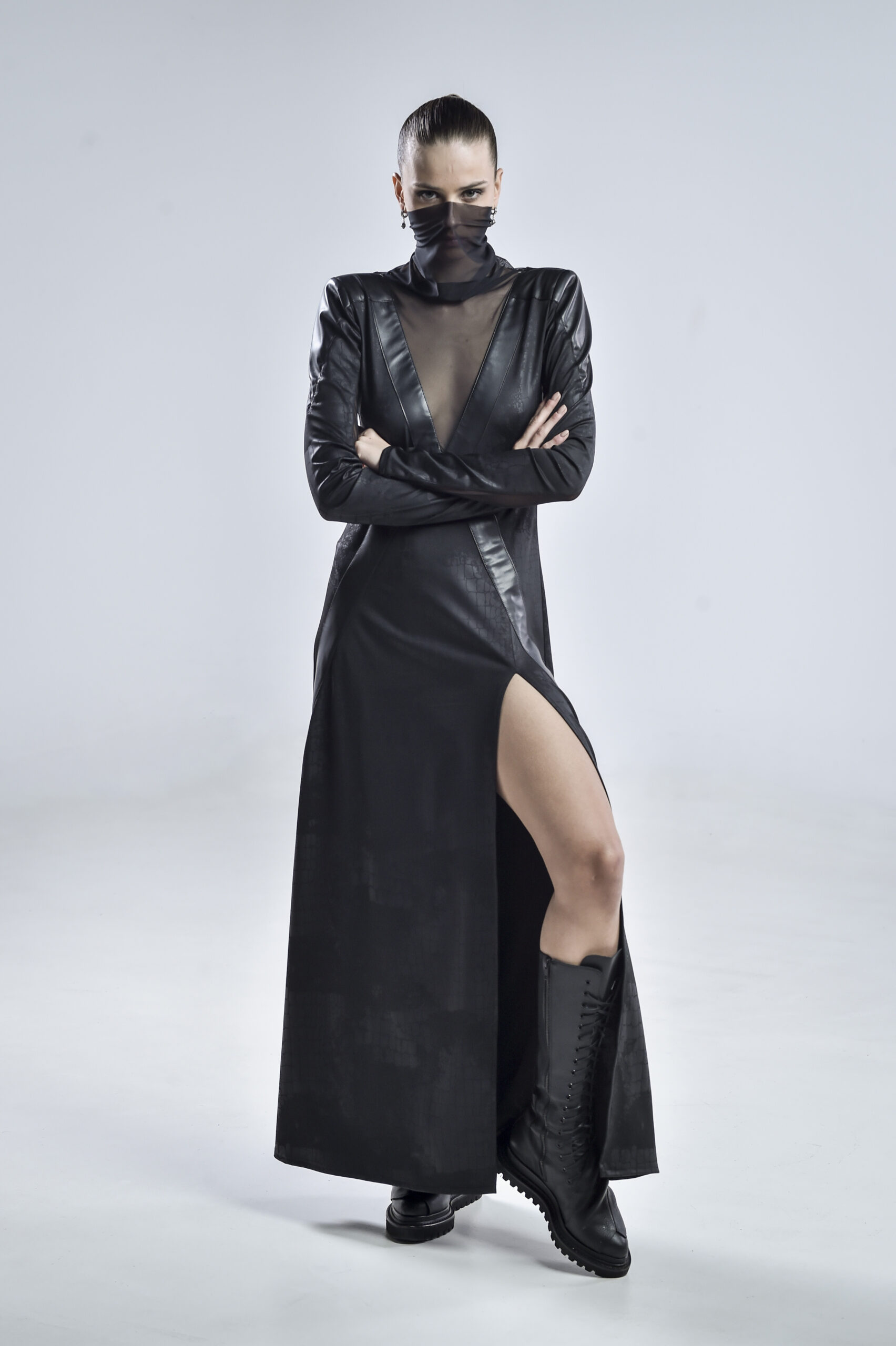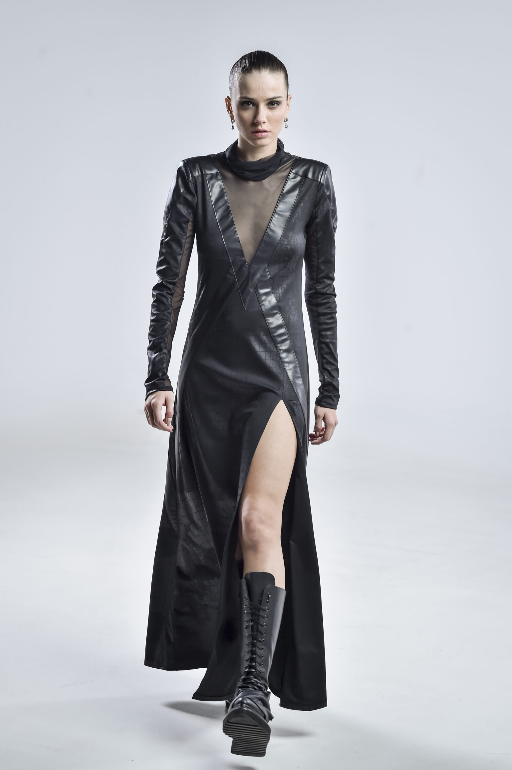 This avantgarde black dress is crafted from georgette, mesh, and faux leather, blending structure and fluidity in perfect tension. The high mesh collar frames the neck with ethereal elegance, while the mesh-lined sleeves and daring high slit reveal just enough to hint at the strength beneath the surface.