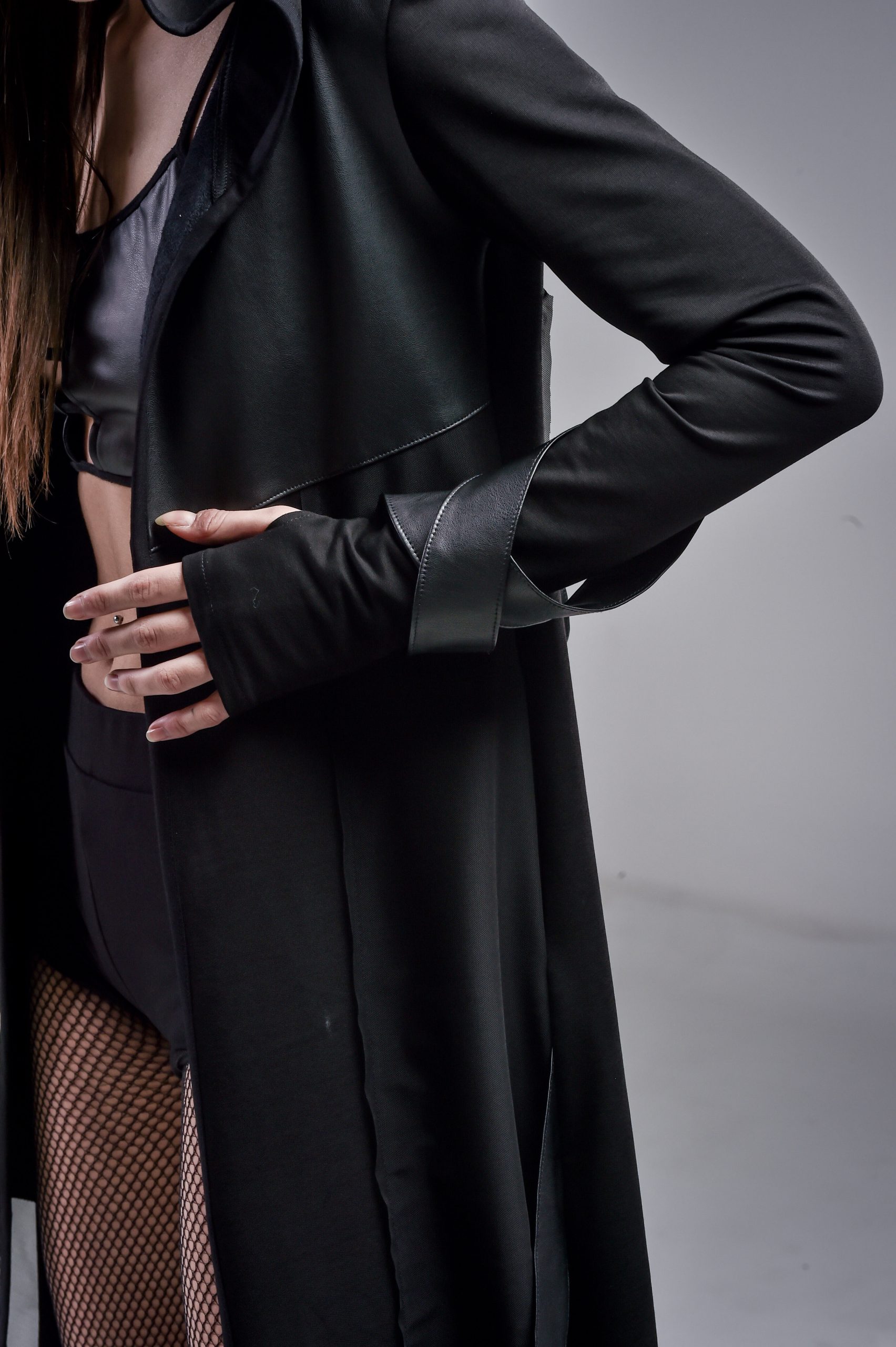 Introducing our Delilah Cardigan — a versatile and edgy addition to your wardrobe. Crafted from soft and stretchy cotton fabric, this cardigan offers both comfort and style. Its asymmetric design adds a modern twist, while the mesh parts and faux leather stripes on the front and back create a bold and dynamic look. Unique X-shaped stripes on one sleeve add an extra touch of flair. Complete with thumbholes, a big hood, and pockets, this cardigan combines functionality with fashion.