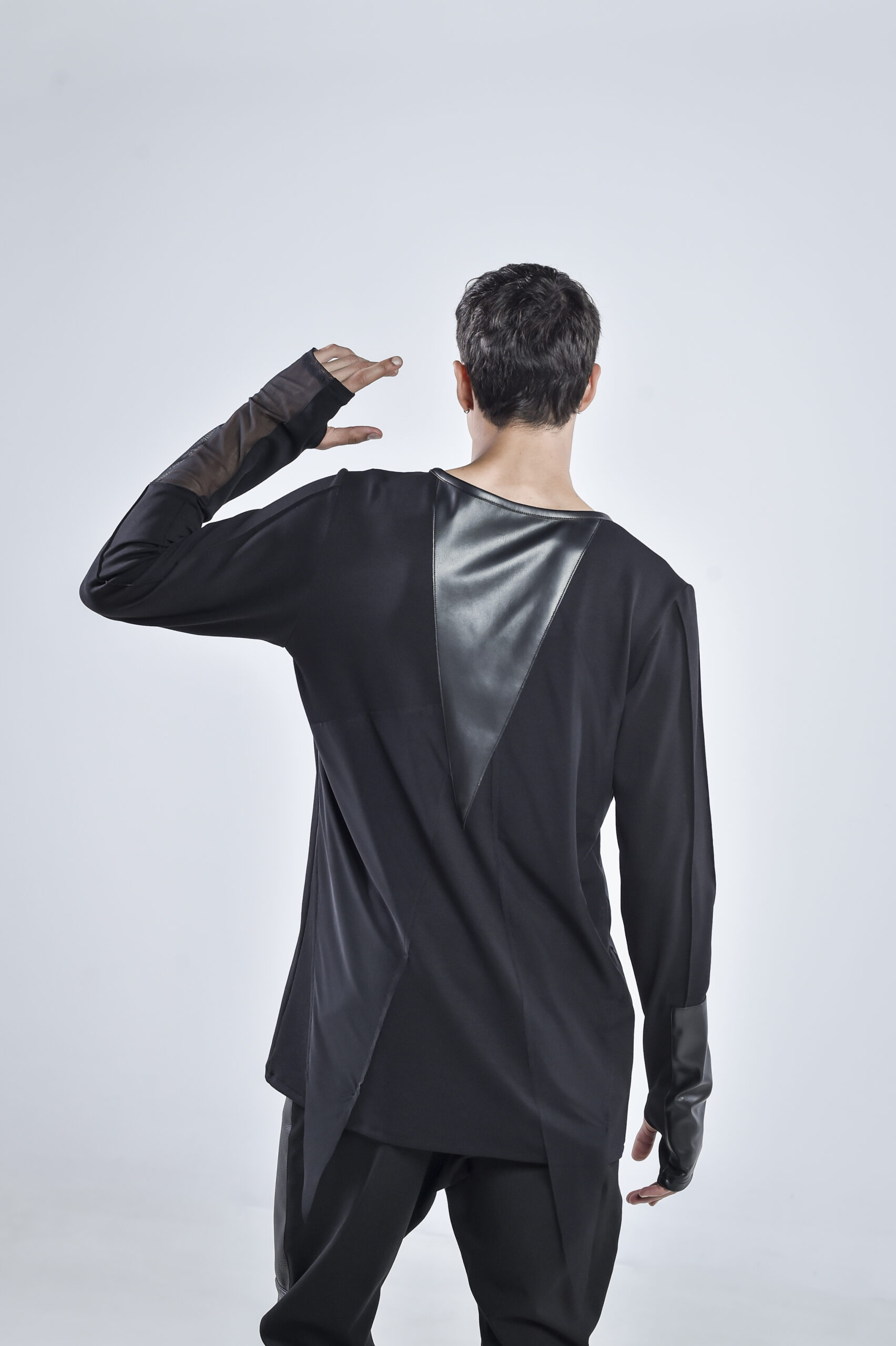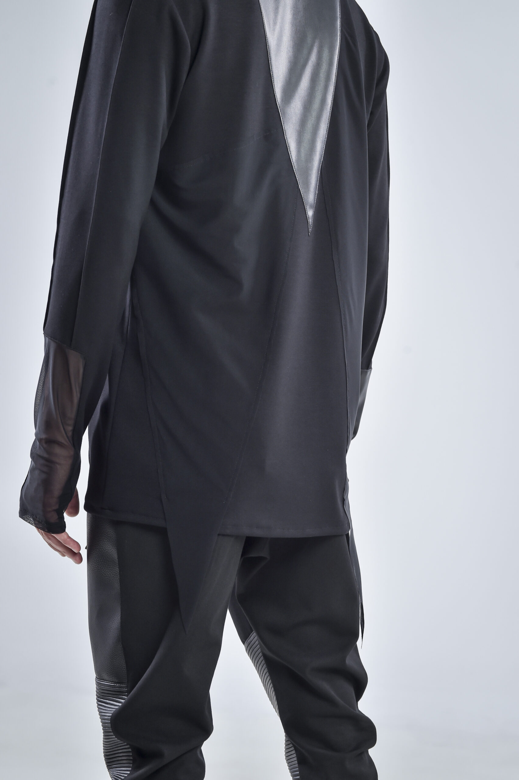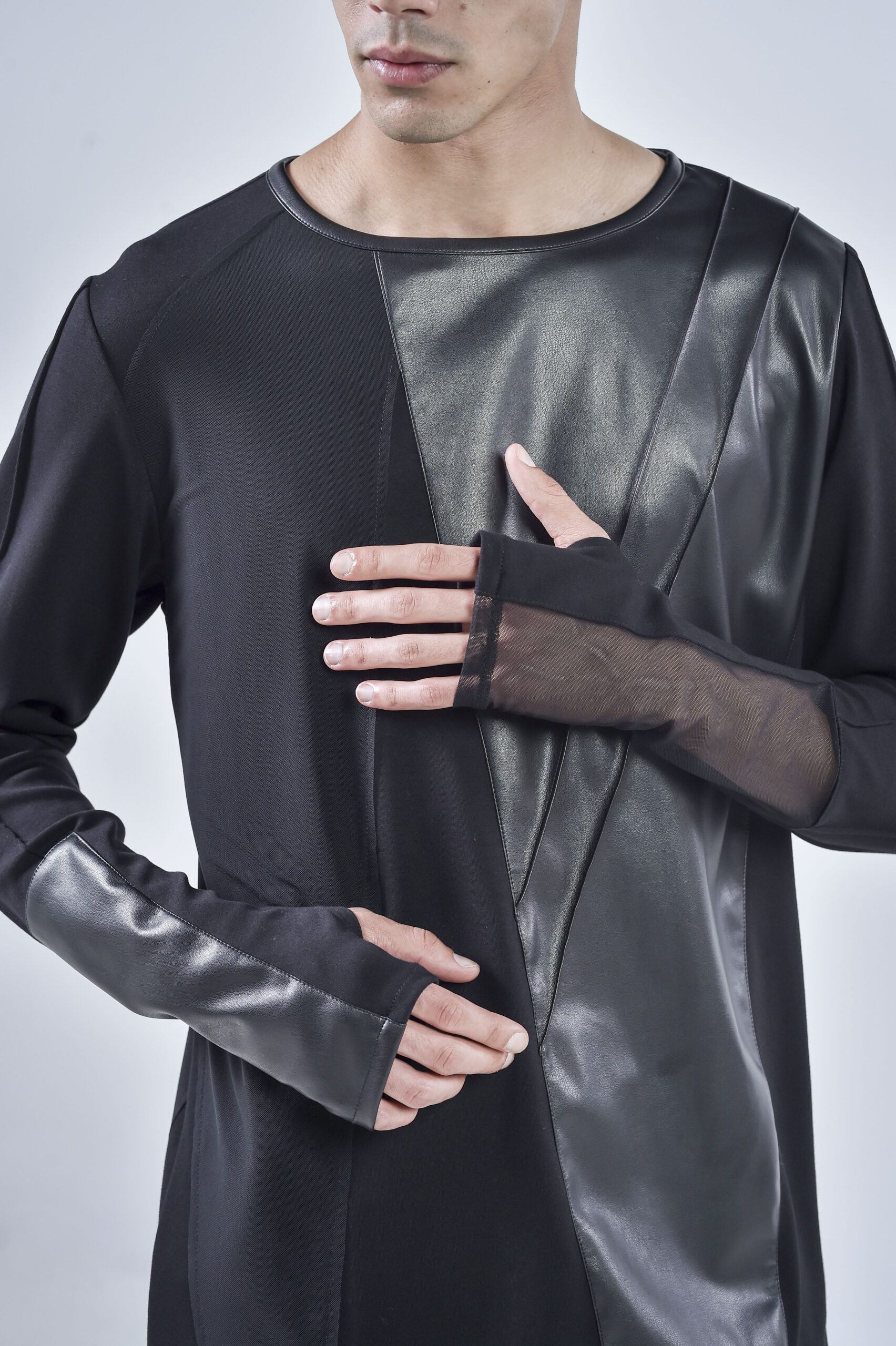 The front and back are accented with matte faux leather panels, cut in sharp geometric lines that create a striking contrast against the draped viscose base. The sleeves mirror this duality — one featuring a sheer mesh insert, and the other constructed entirely from faux leather, embodying perfect balance between texture and tension.