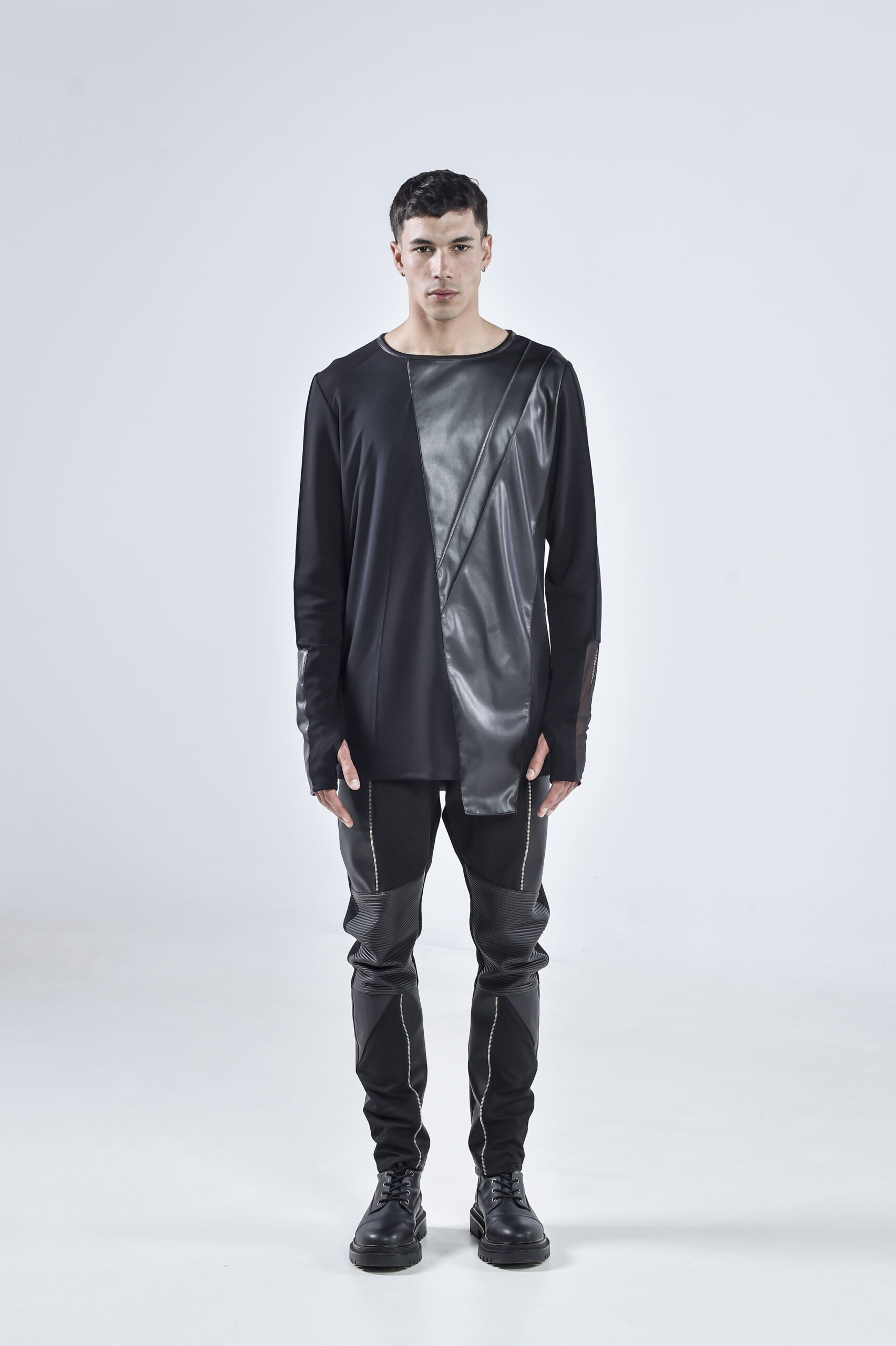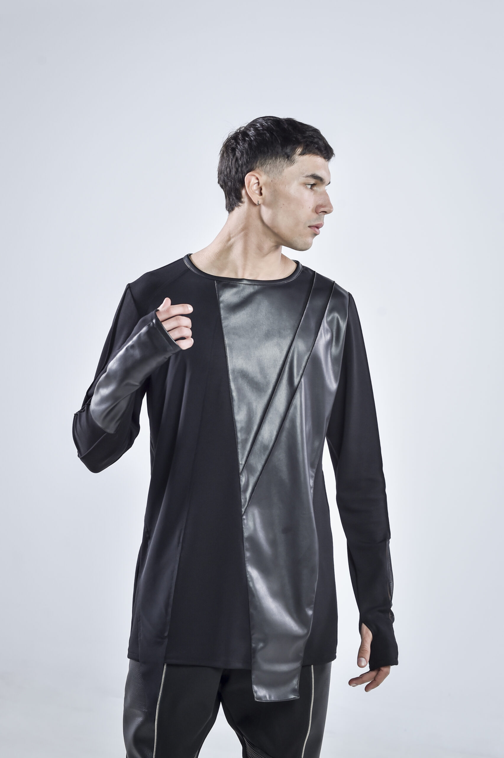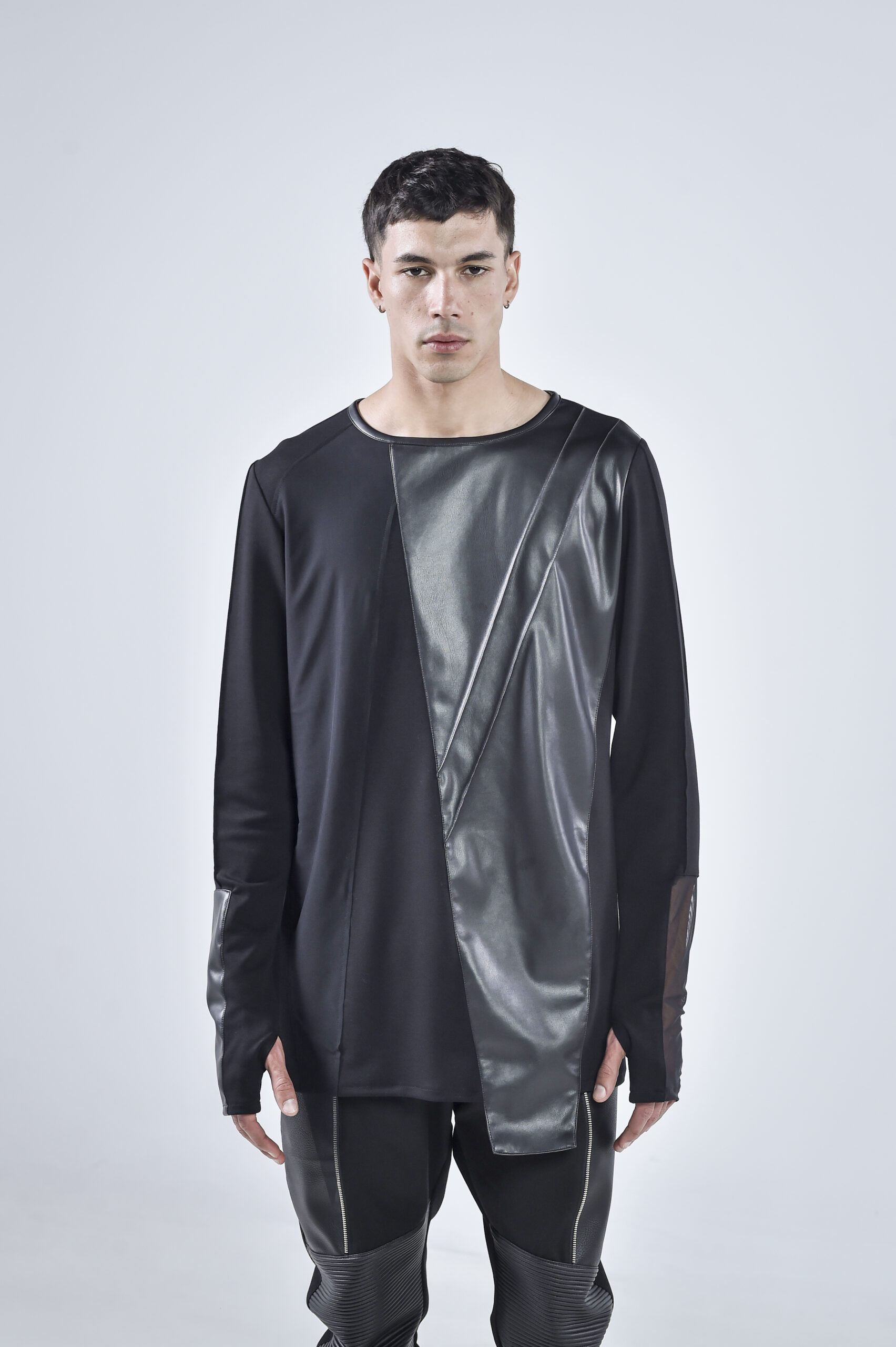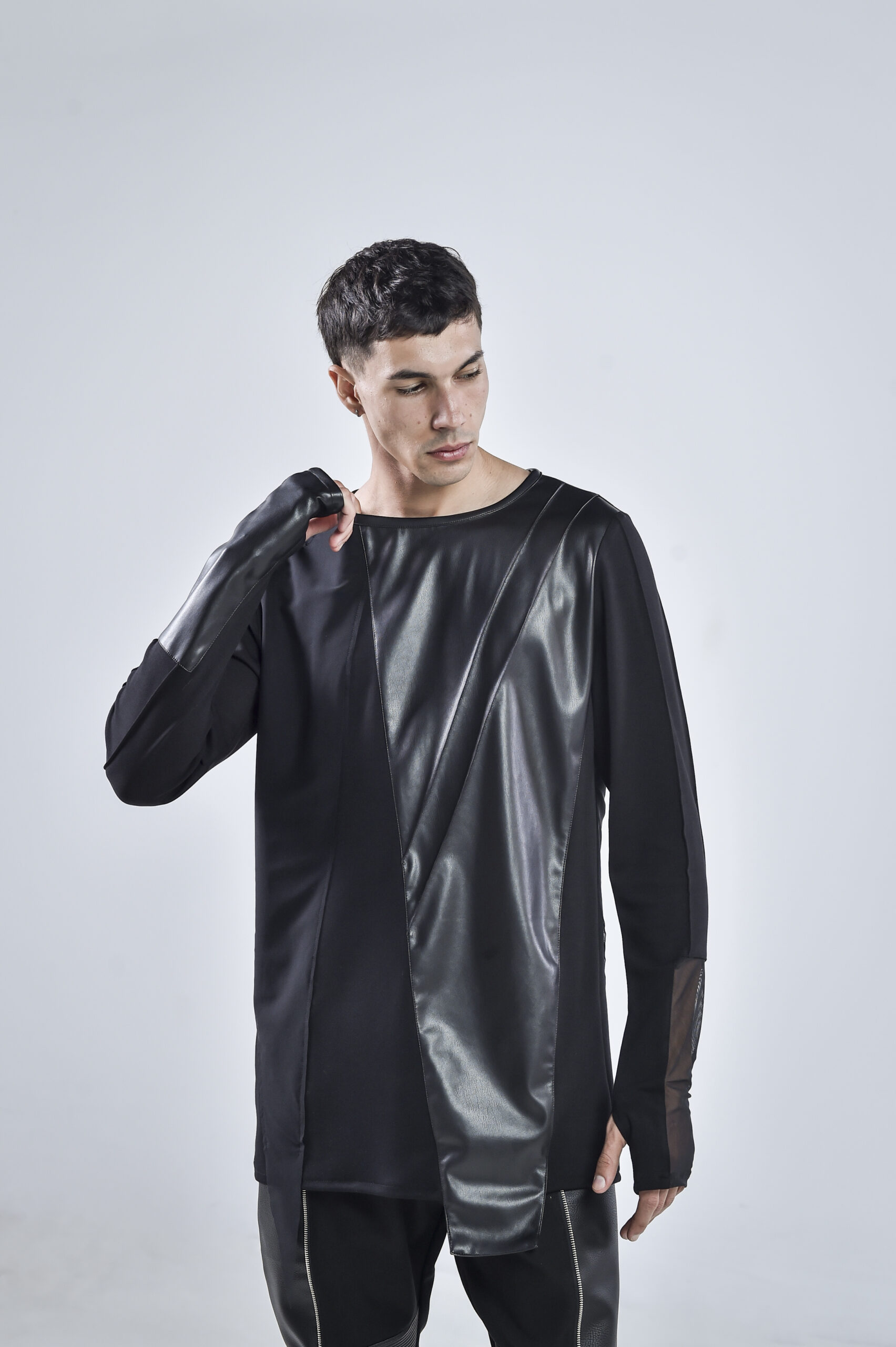 The front and back are accented with matte faux leather panels, cut in sharp geometric lines that create a striking contrast against the draped viscose base. The sleeves mirror this duality — one featuring a sheer mesh insert, and the other constructed entirely from faux leather, embodying perfect balance between texture and tension.