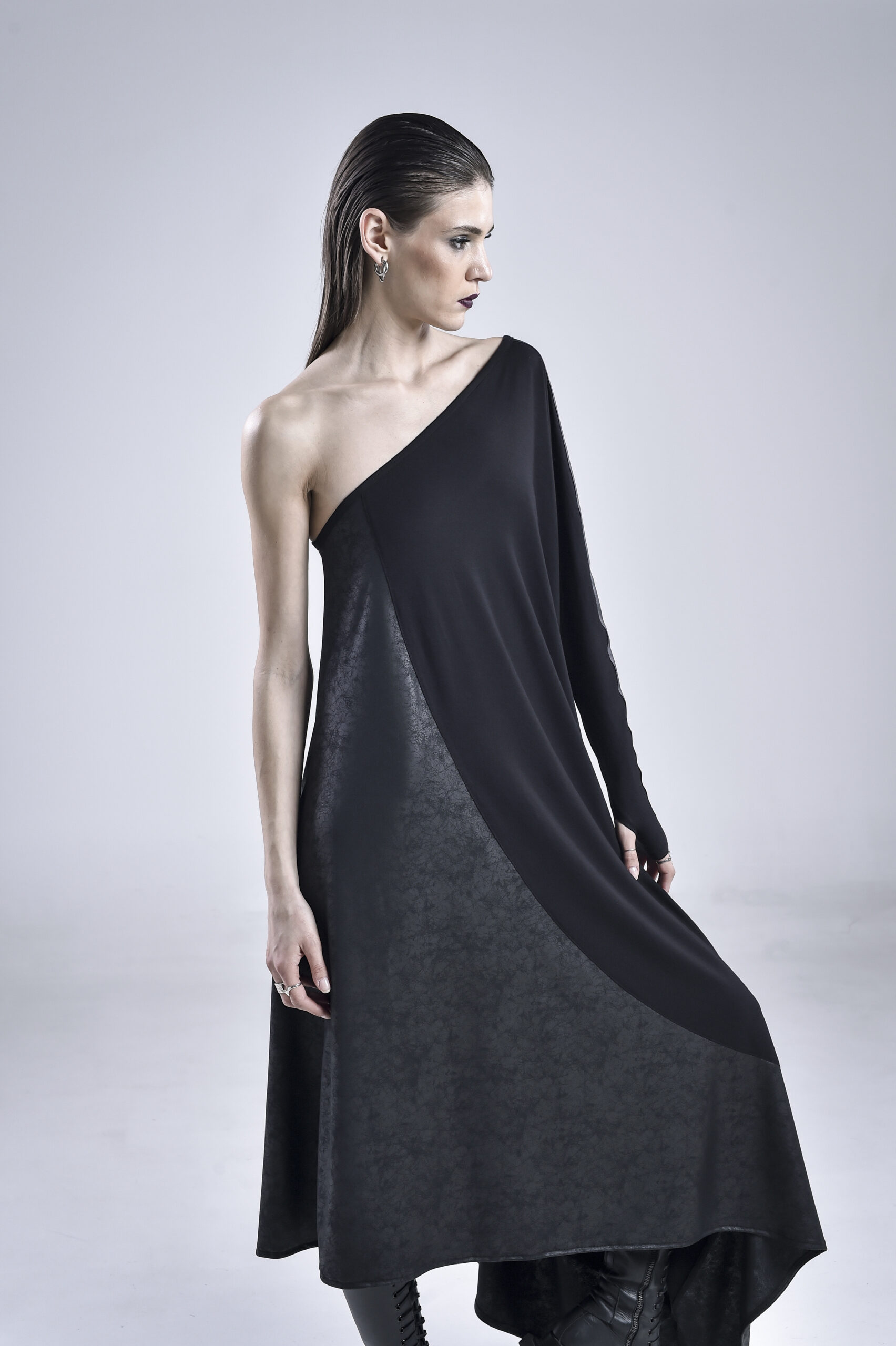 The Elysium Kaftan is the epitome of futuristic elegance. This one-sleeve, asymmetric design brings a bold yet graceful twist to the classic kaftan. With a wide, flowing sleeve that effortlessly drapes, its thumbhole detail and faux leather stripe add an edgy touch to the fluid silhouette.