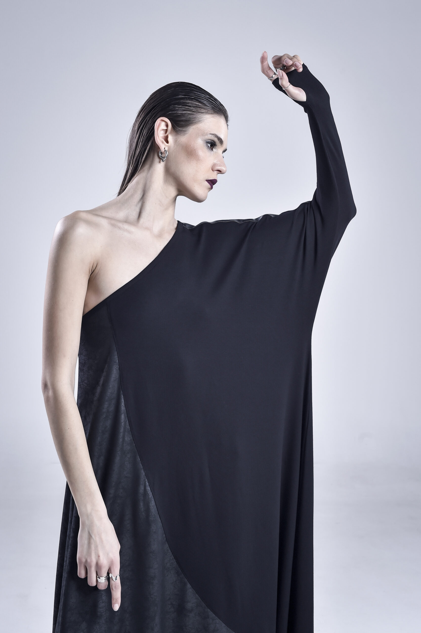 The black, long kaftan shape creates a stunning contrast of fluidity and structure, making this piece the perfect blend of avant-garde fashion and modern elegance. Ideal for those seeking a unique, futuristic statement in their wardrobe.
