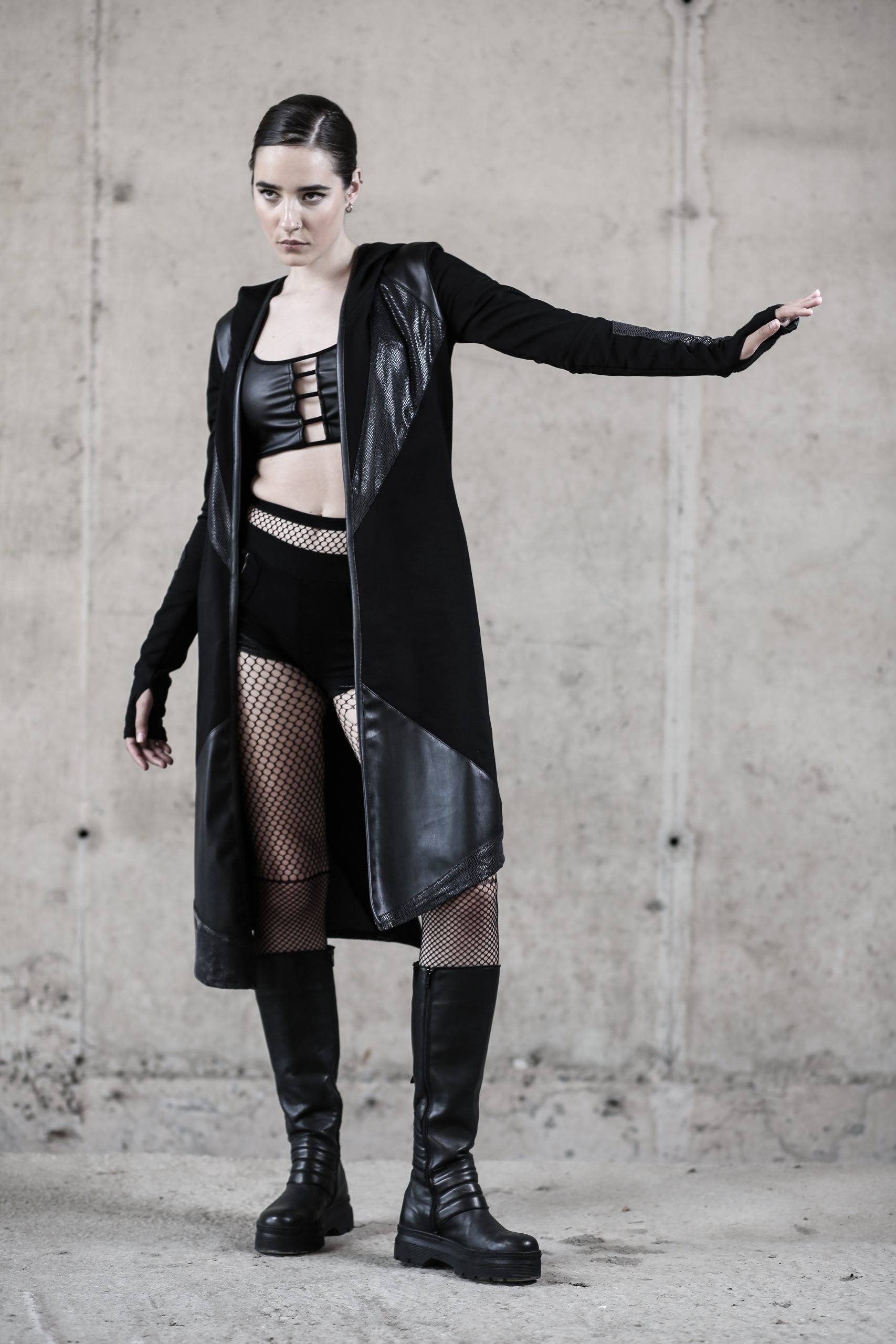 Introducing our Eternity Cardigan – a versatile masterpiece that effortlessly blends the worlds of street fashion, cyberpunk aesthetics, and dystopian flair. Crafted from an innovative mix of different fabrics, this one-layer cardigan is a statement piece for those seeking unique women’s wear.