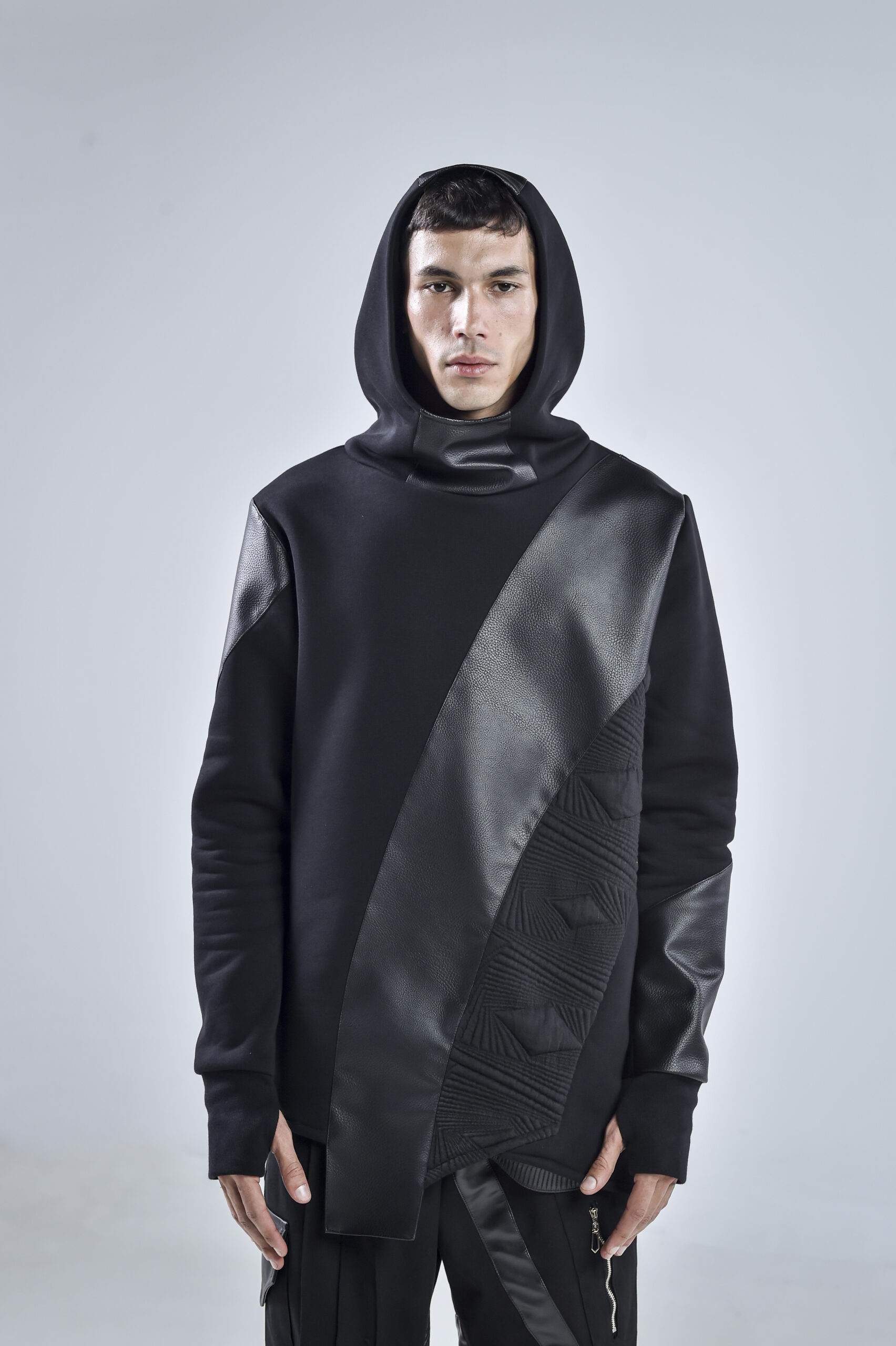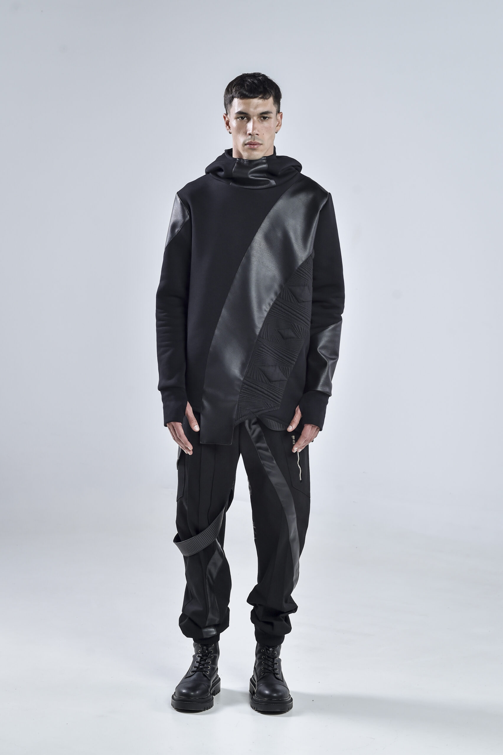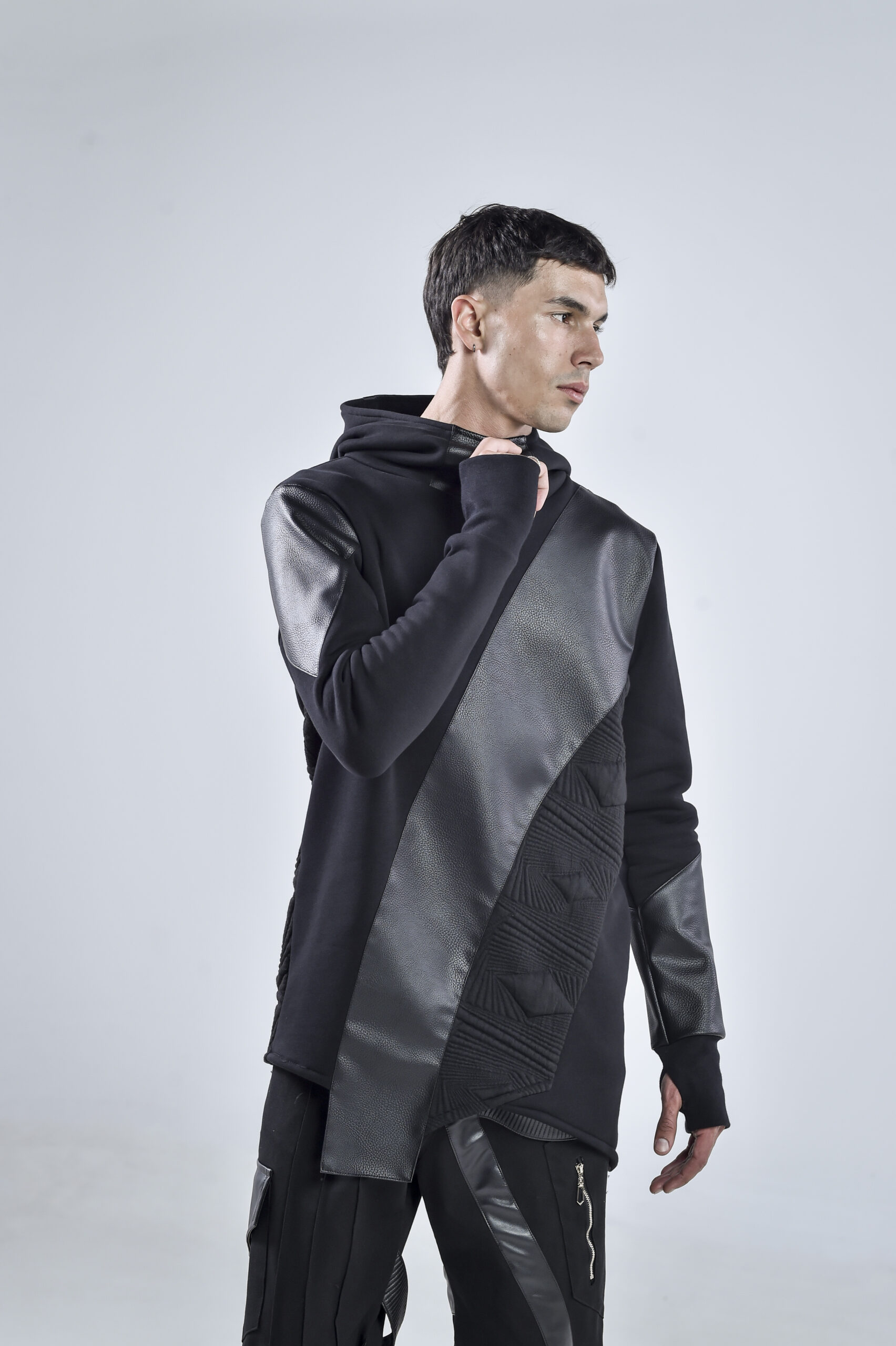 The Fragment Hoodie features a high-collar hoodie that adds a futuristic, almost dystopian vibe. The design includes thumbholes in the sleeves, adding both style and functionality. This sleek and structured piece is pocket-free, focusing entirely on the strong visual lines and fabric textures that define its unique look.