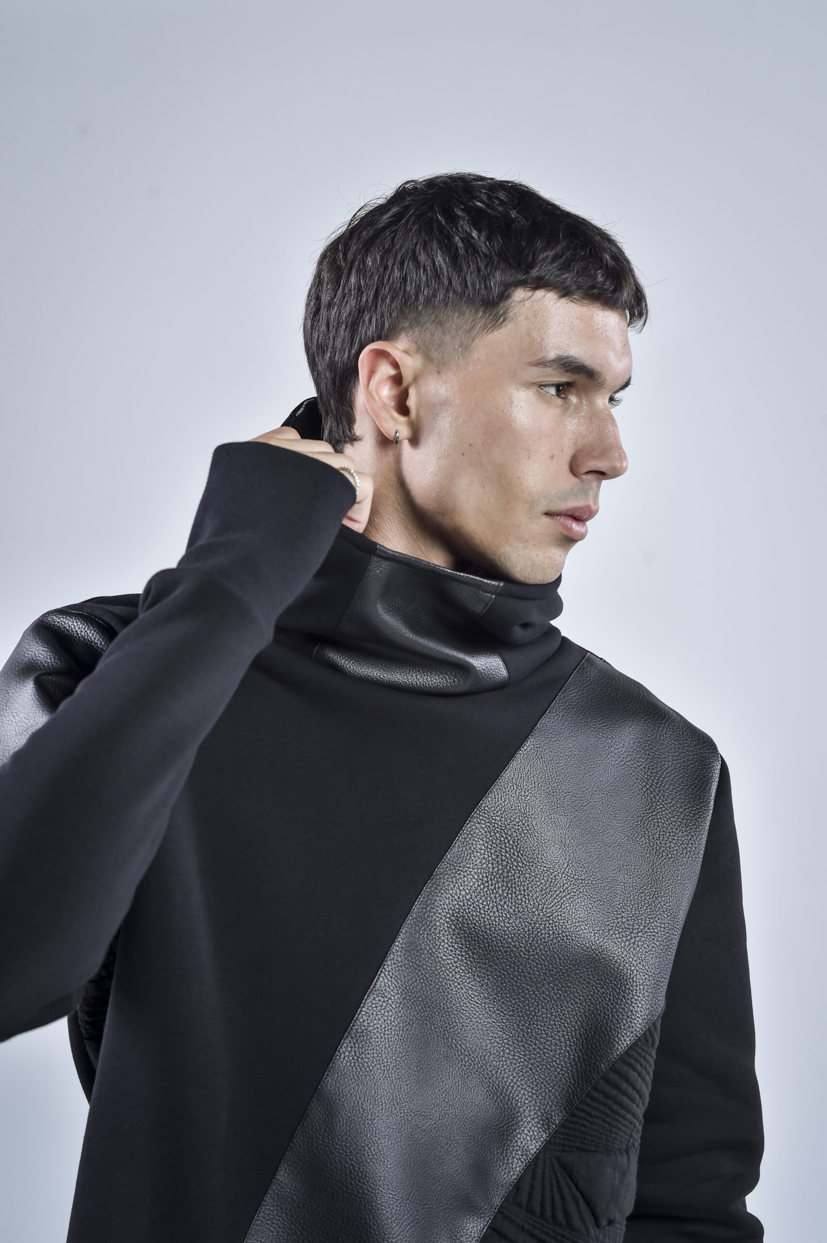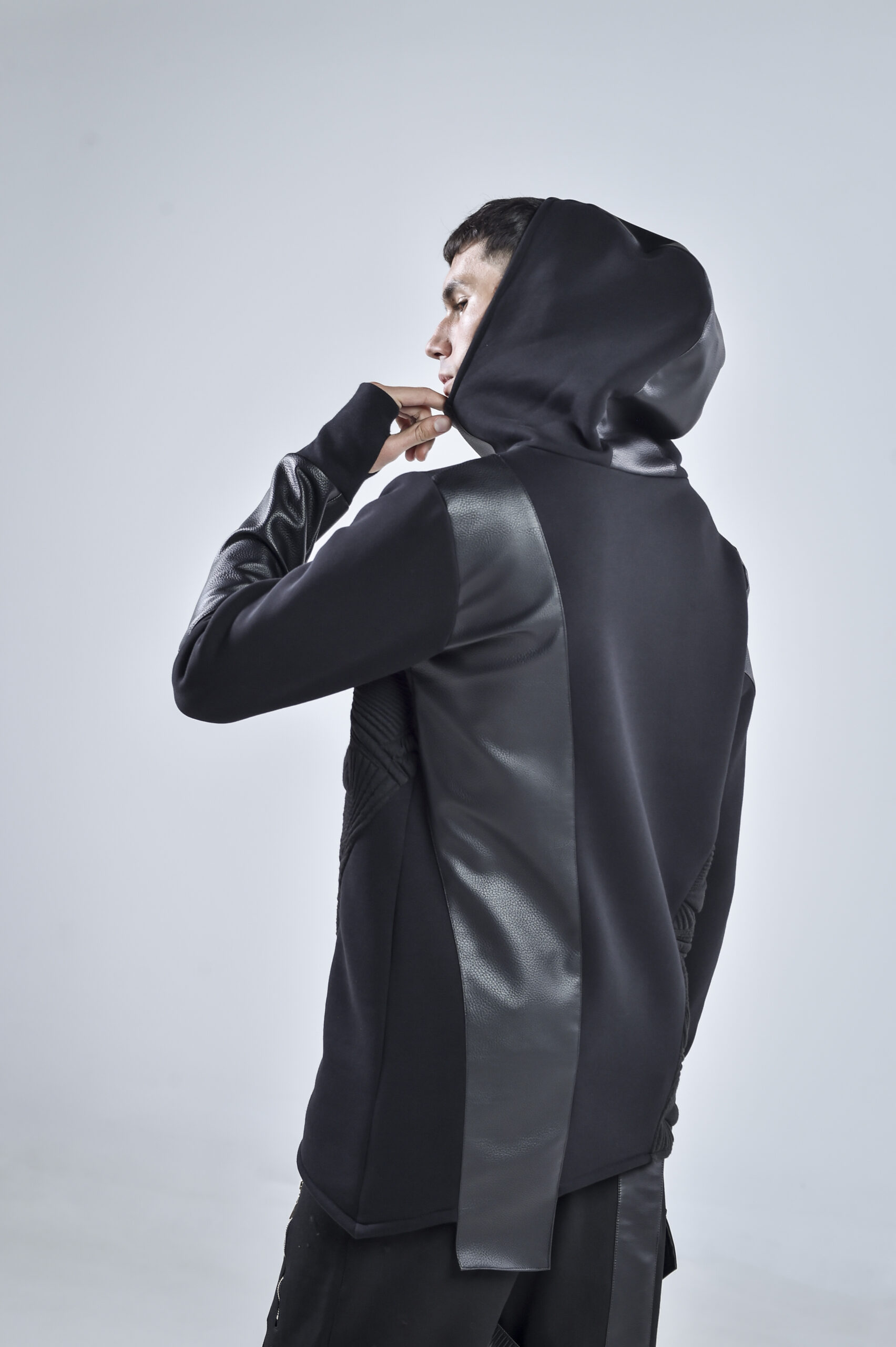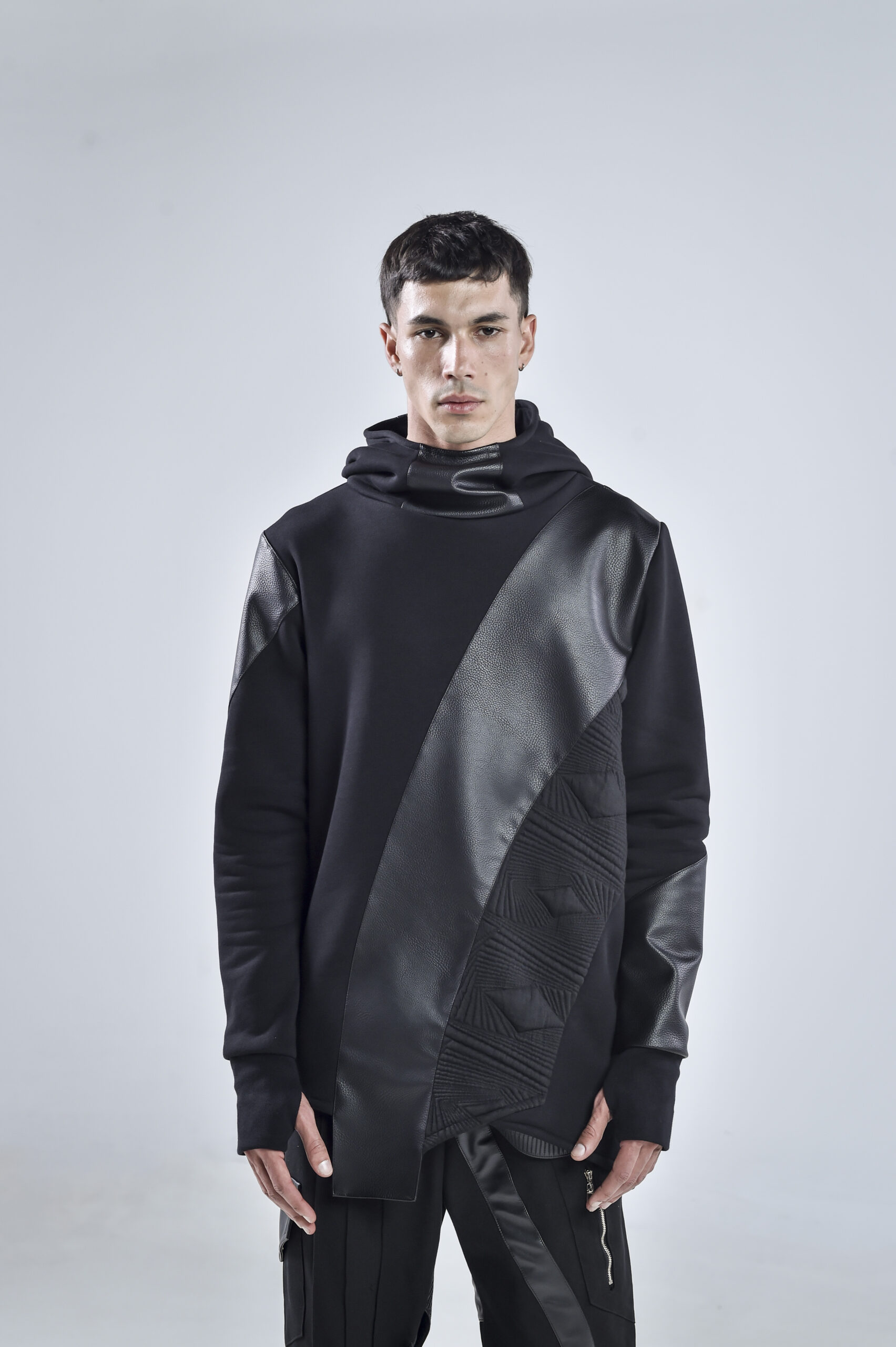 The Fragment Hoodie features a high-collar hoodie that adds a futuristic, almost dystopian vibe. The design includes thumbholes in the sleeves, adding both style and functionality. This sleek and structured piece is pocket-free, focusing entirely on the strong visual lines and fabric textures that define its unique look.