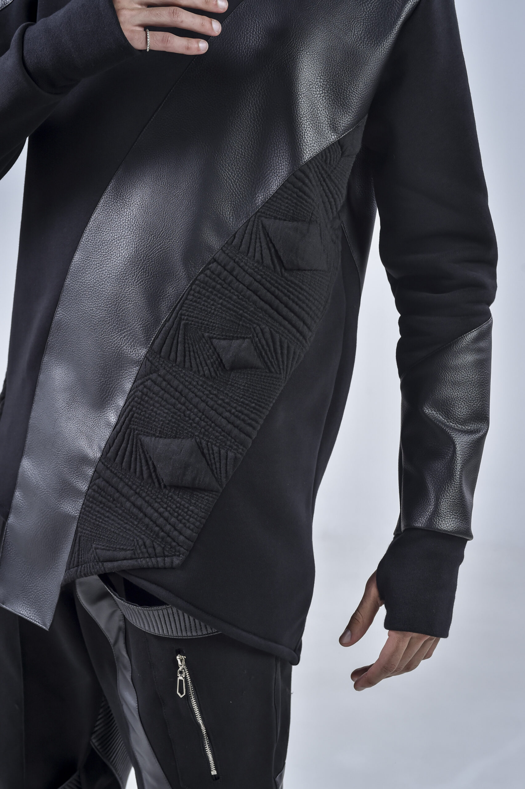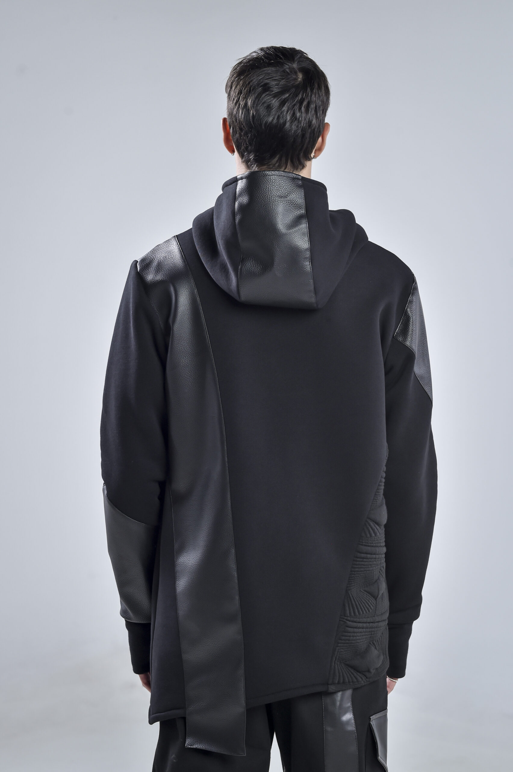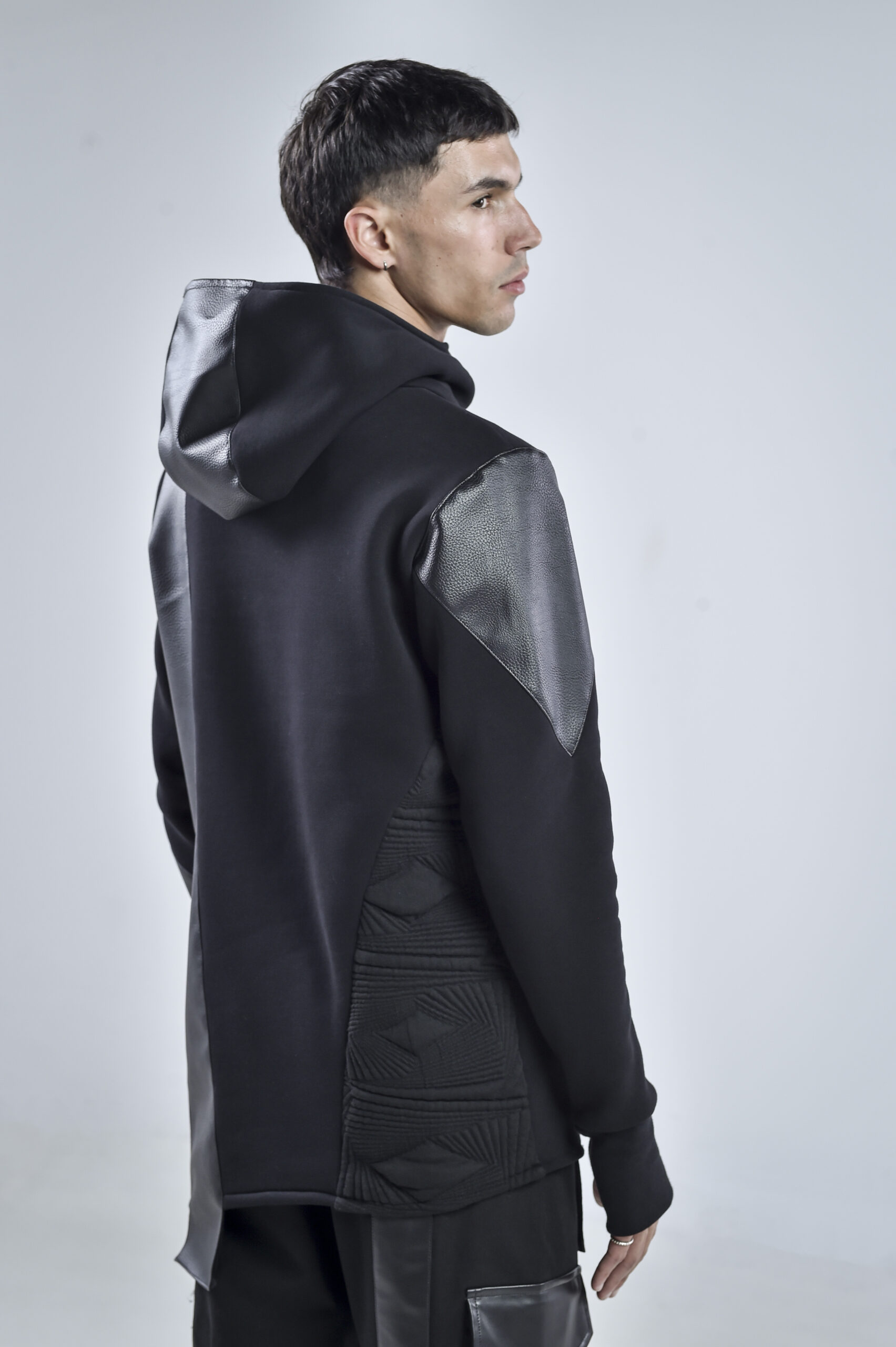 Introducing the Fragment Hoodie—a striking and modern take on the classic black hoodie. This design stands out with its innovative use of two distinct, thick cotton fabrics. The base fabric is a smooth, plain black cotton, offering a clean and minimalist aesthetic, while the geometric-textured fabric creates an eye-catching contrast with its bold, asymmetrical pattern.
