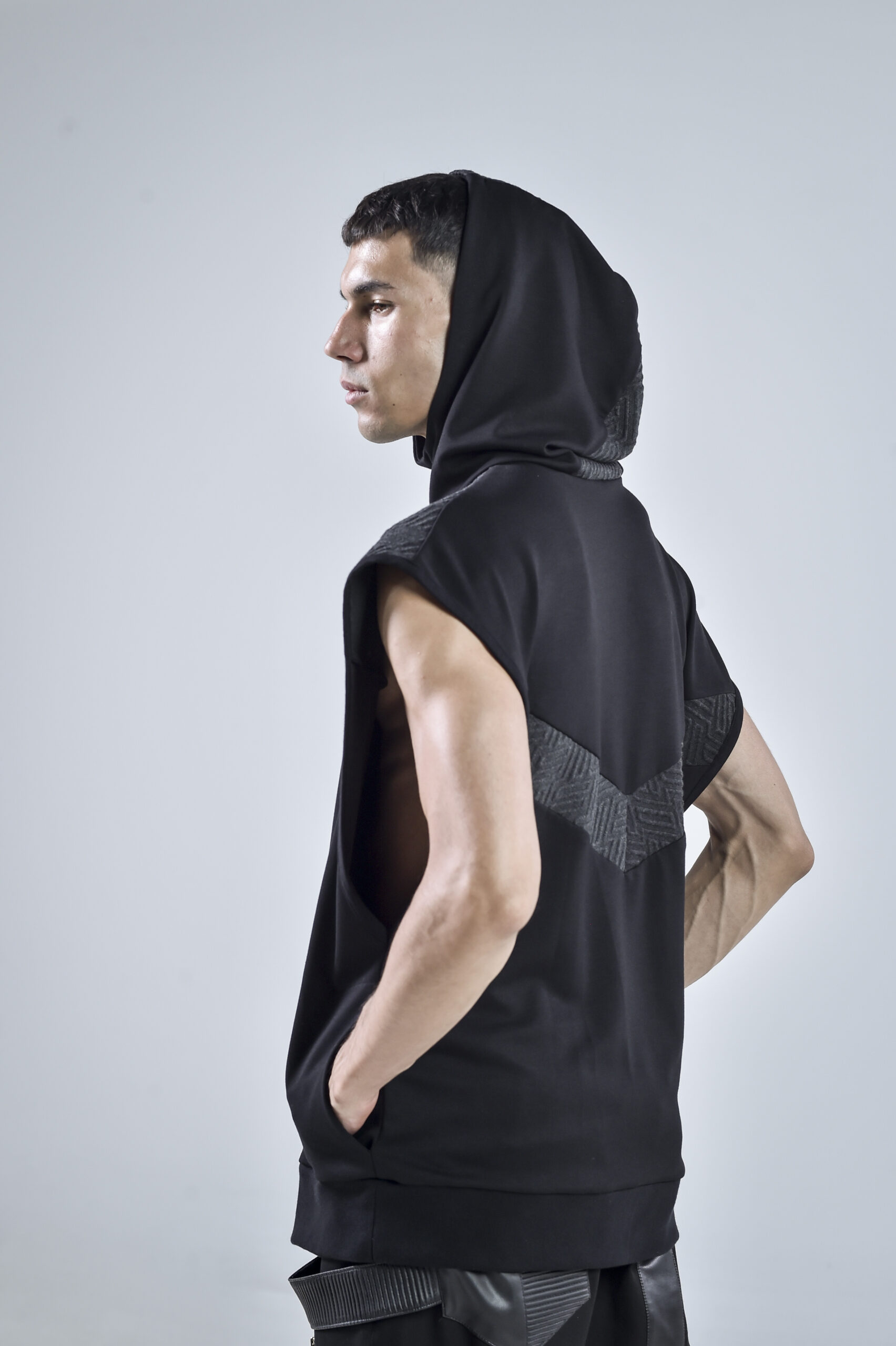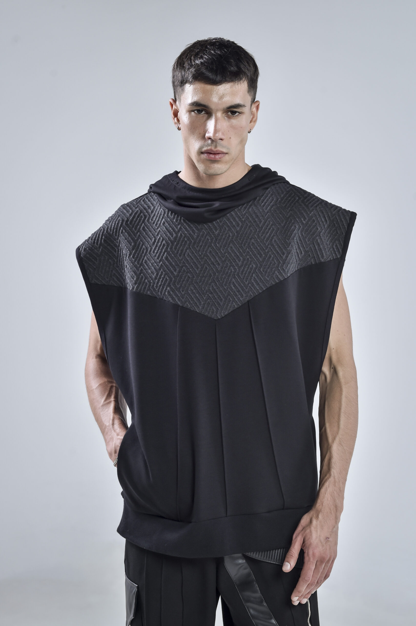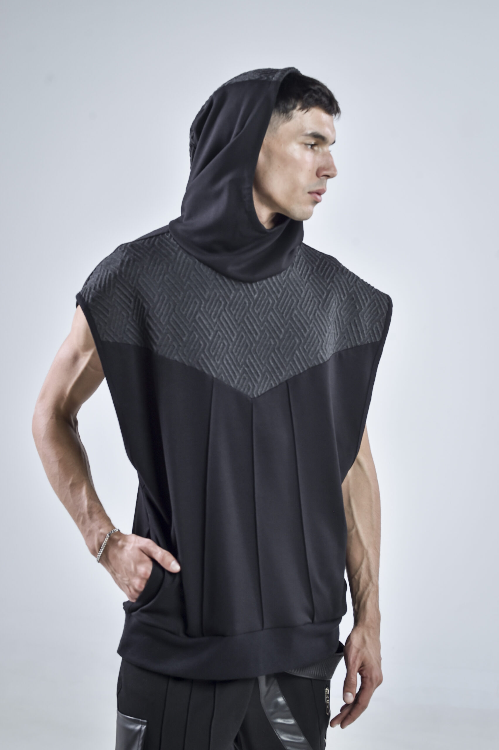 Discover refined simplicity with the Hyperion Hoodie — a modern essential that blends casual comfort with a distinctive design edge. Made from two cotton fabrics, this hoodie combines a smooth black base with a subtle gray geometric textured panel across the chest and shoulders, creating a sophisticated contrast that feels both timeless and contemporary.