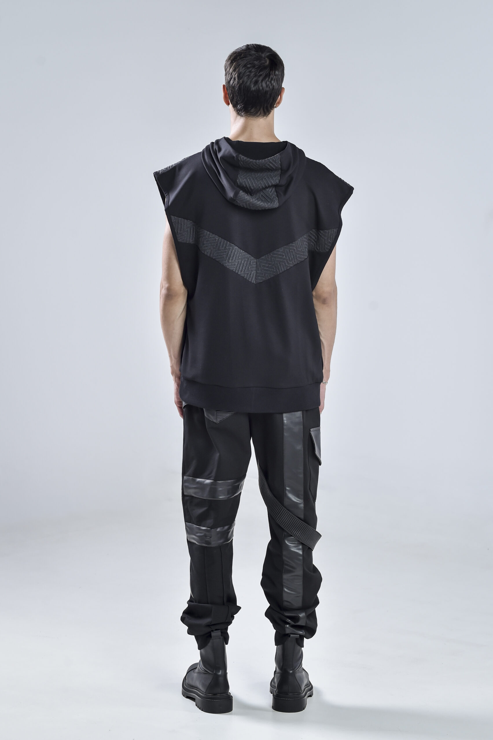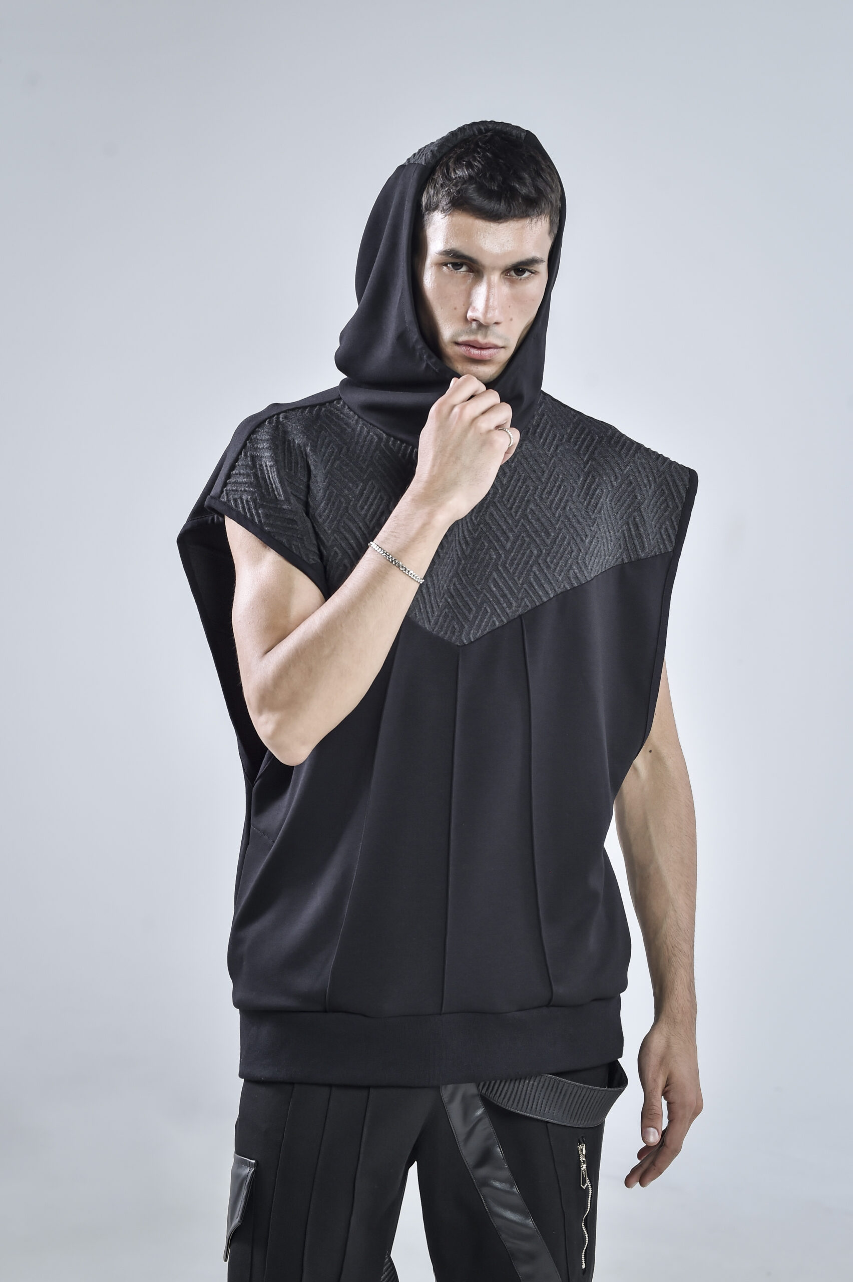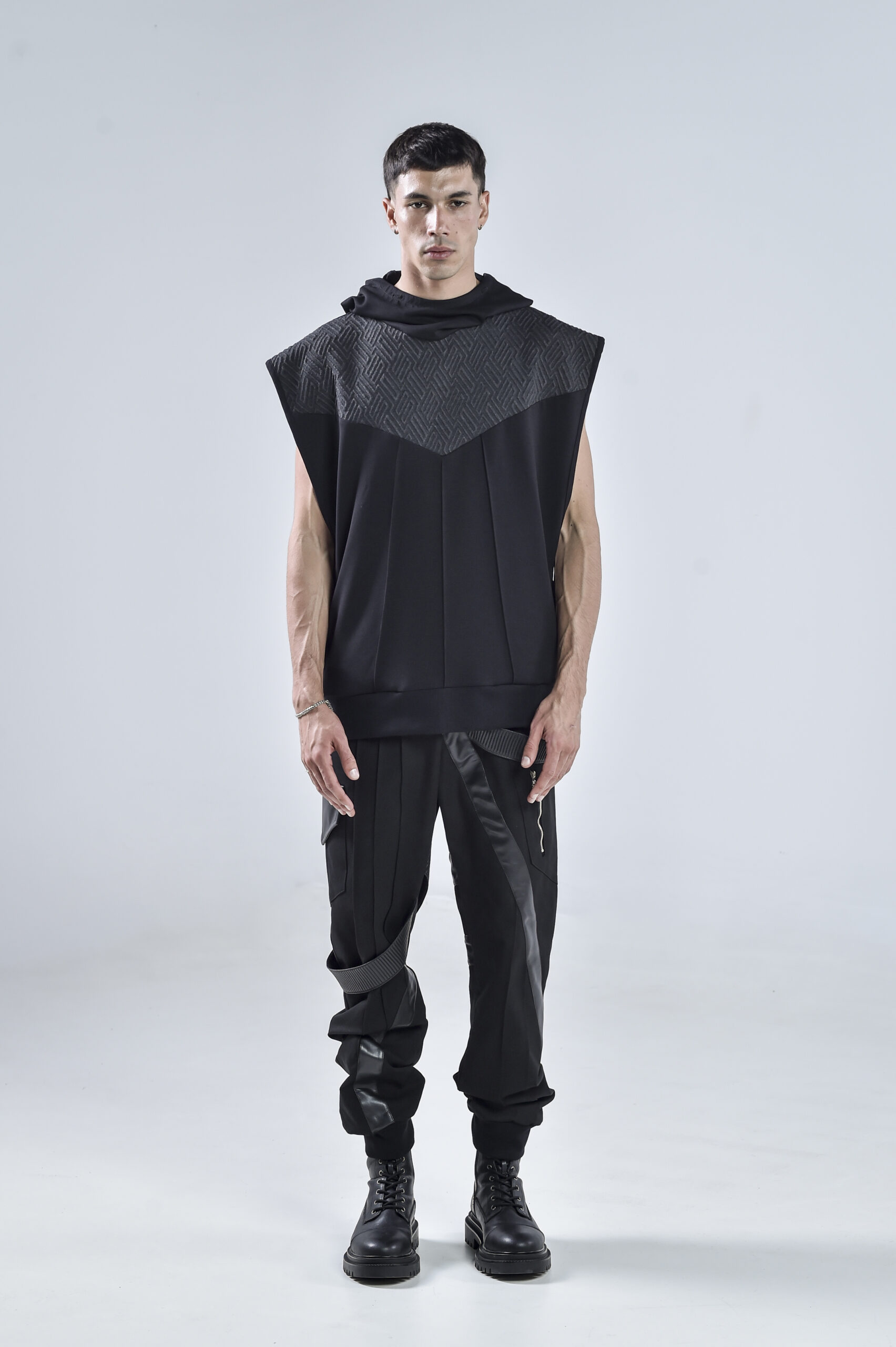 Discover refined simplicity with the Hyperion Hoodie — a modern essential that blends casual comfort with a distinctive design edge. Made from two cotton fabrics, this hoodie combines a smooth black base with a subtle gray geometric textured panel across the chest and shoulders, creating a sophisticated contrast that feels both timeless and contemporary.