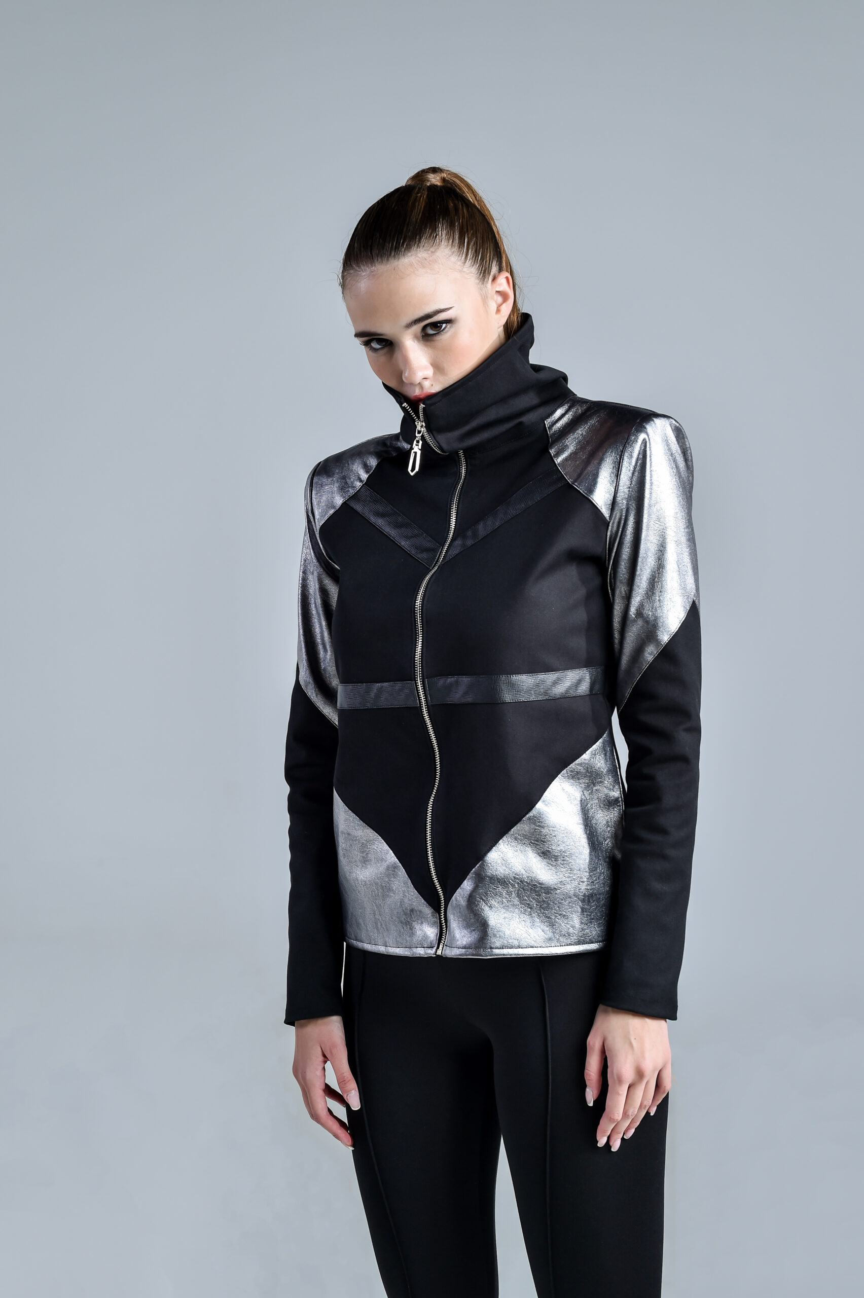 This women’s Iris Jacket embodies a bold cyberpunk and futuristic aesthetic. Designed with a striking high collar and functional pockets, it’s crafted from a dynamic mix of twill and faux leather, blending textures for a sleek, modern look. The silver detailing throughout adds a sharp, cyber edge, enhancing its dystopian appeal. Perfect for those seeking a daring fashion statement, this jacket fuses innovative design with a truly futuristic appeal.