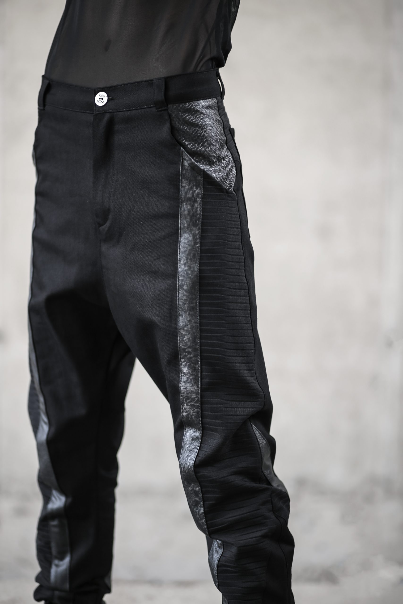 Elevate your wardrobe with our super unique Niander Pants, a striking fusion of style and innovation that embodies the spirit of dystopian, futuristic, and avant-garde fashion. These meticulously designed pants are unlike anything you’ve seen before, with a bold combination of two different fabrics and faux leather lines on both the front and back, creating a truly distinctive look.