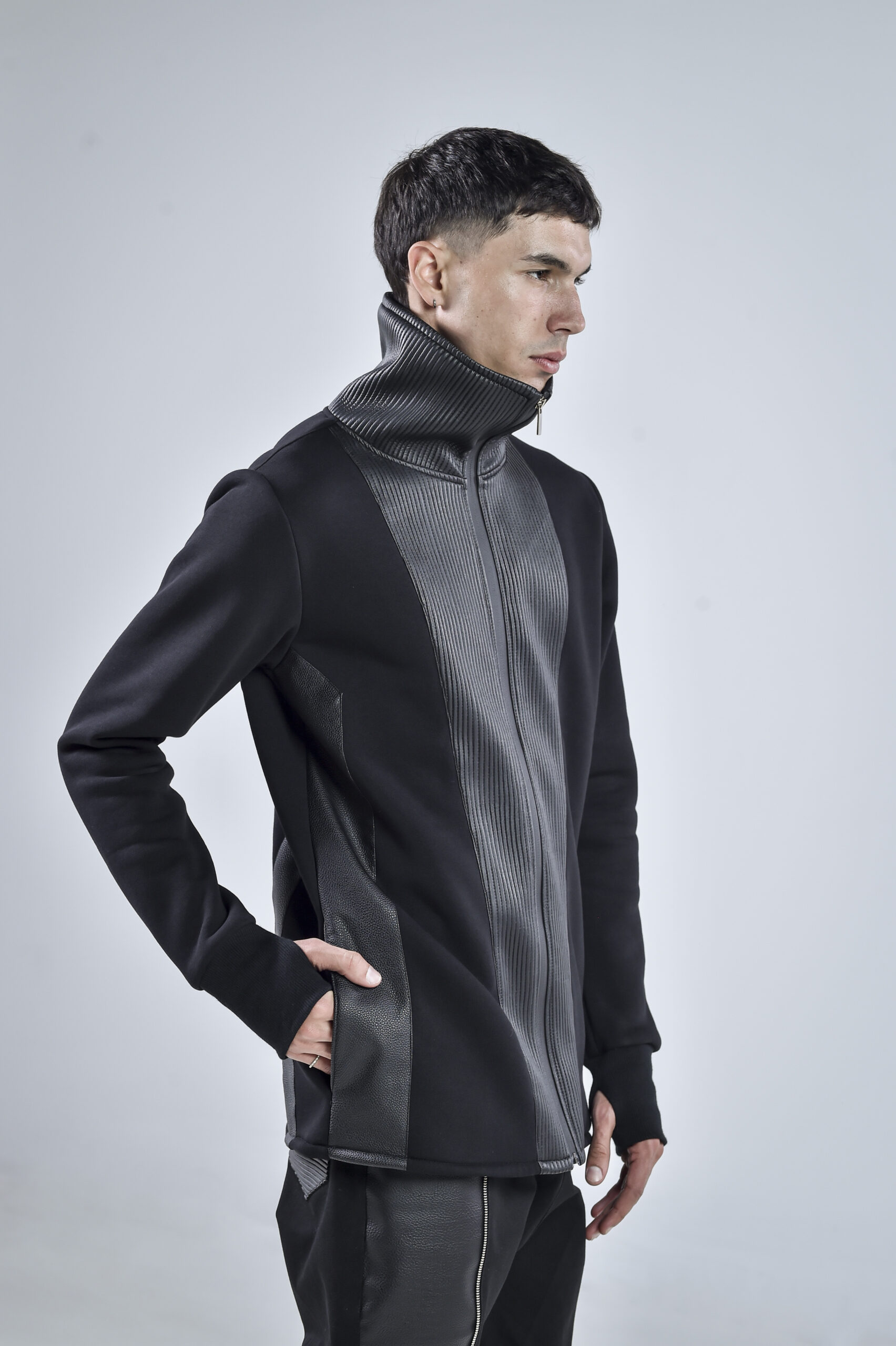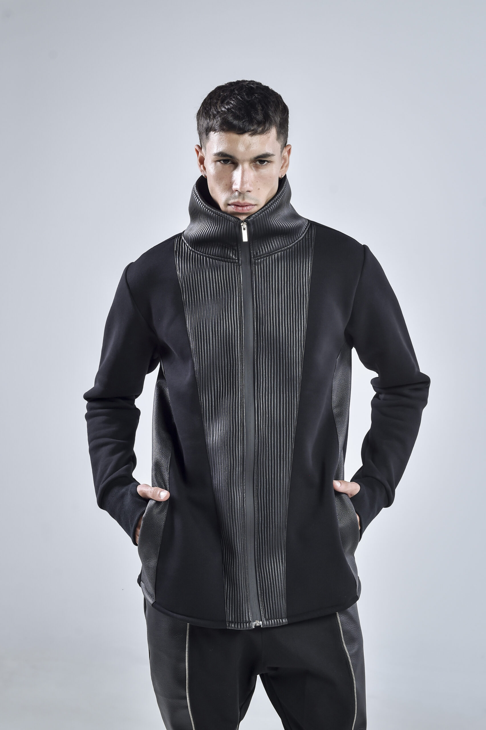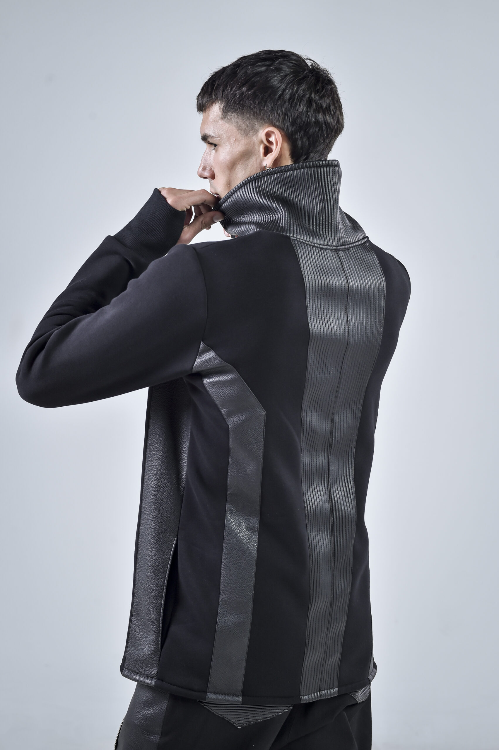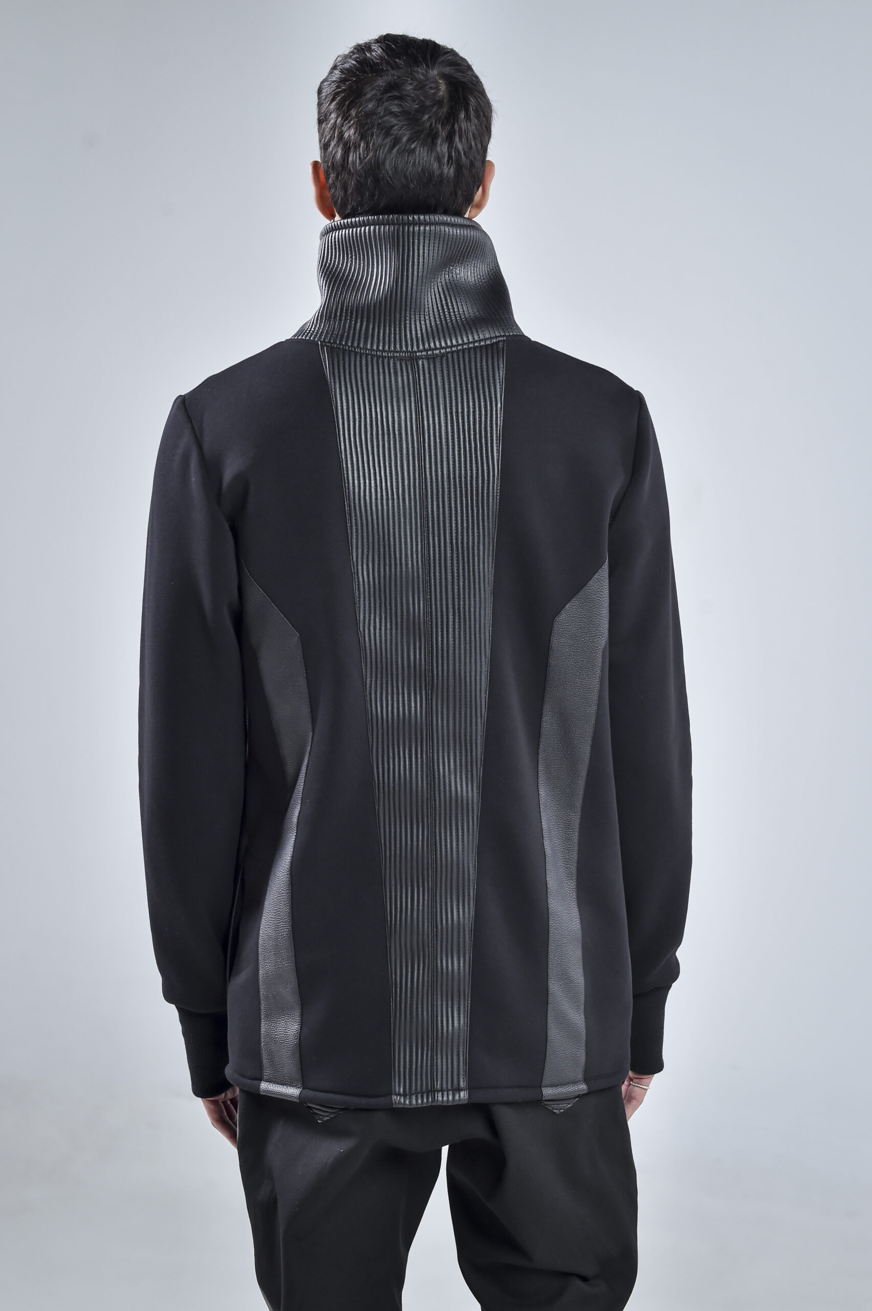 The high collar design provides both protection and a striking visual statement, while the sleek vertical faux leather panels add depth, structure, and a futuristic silhouette. Designed for comfort and durability, the Quasar Jacket features hidden side pockets for practicality without compromising the clean aesthetic.
