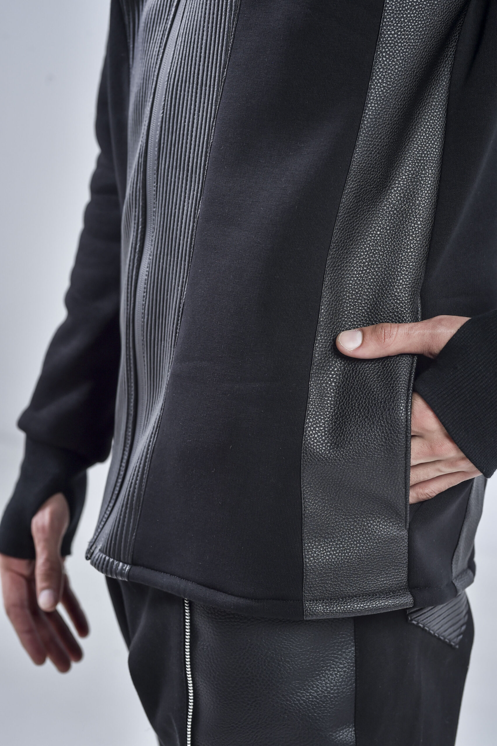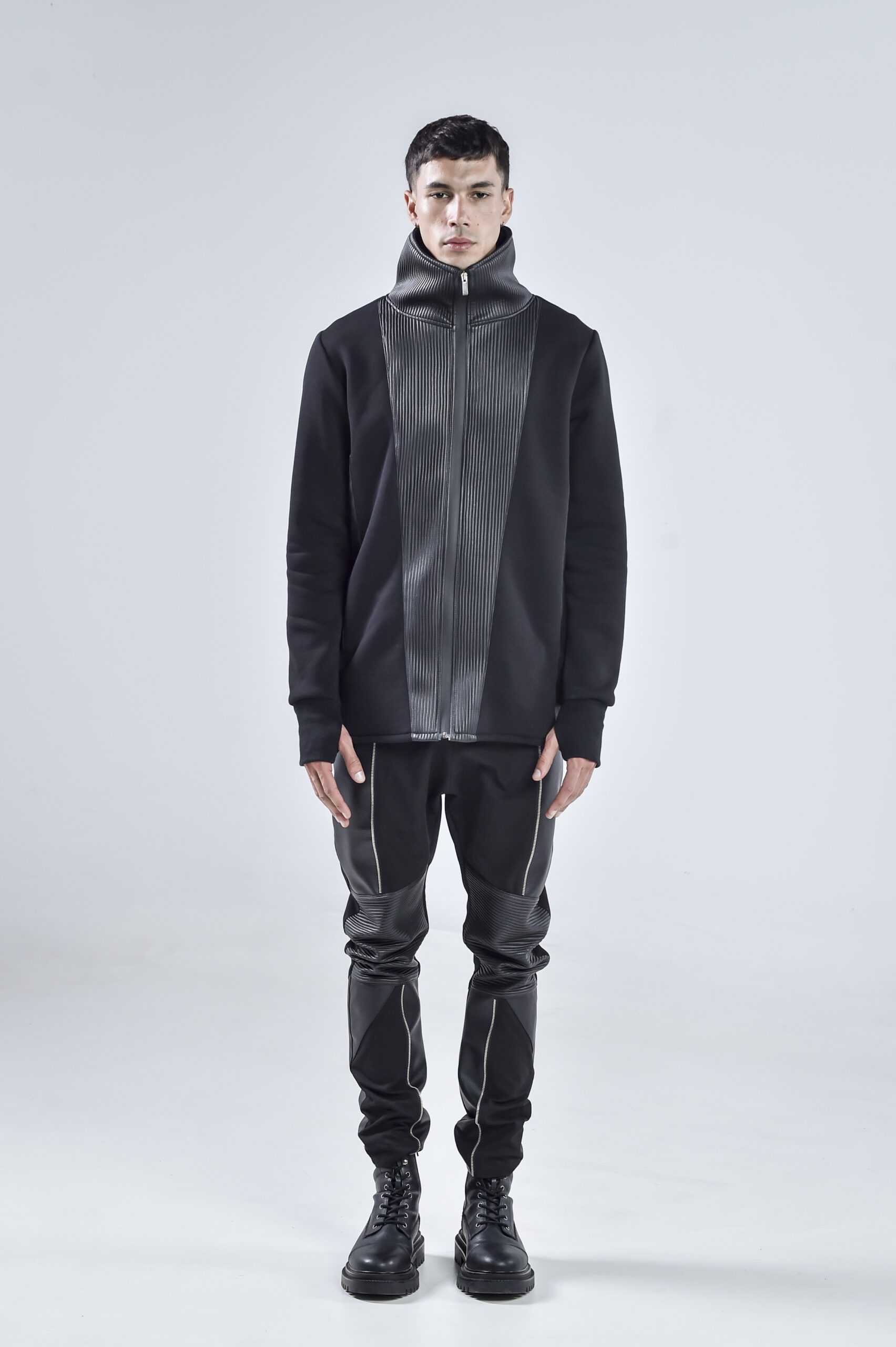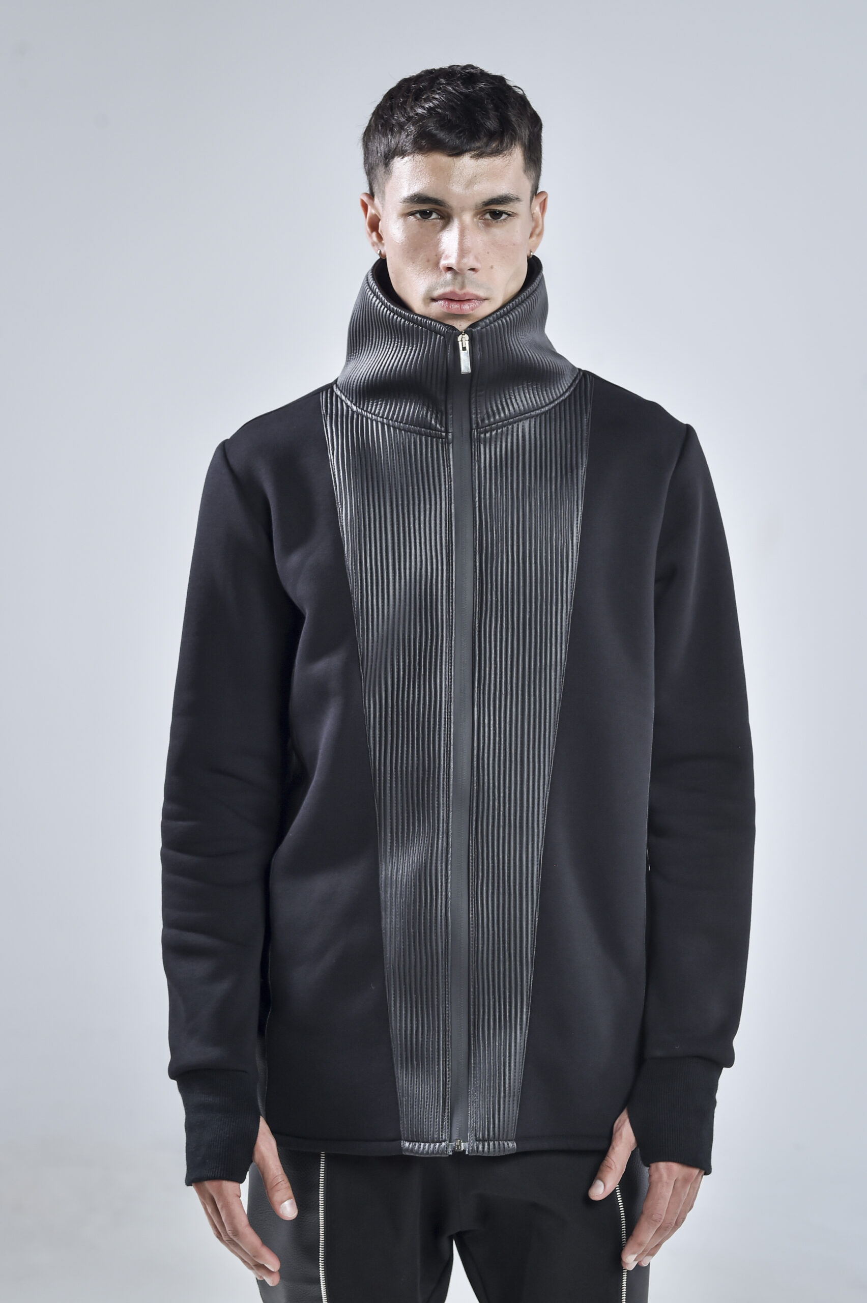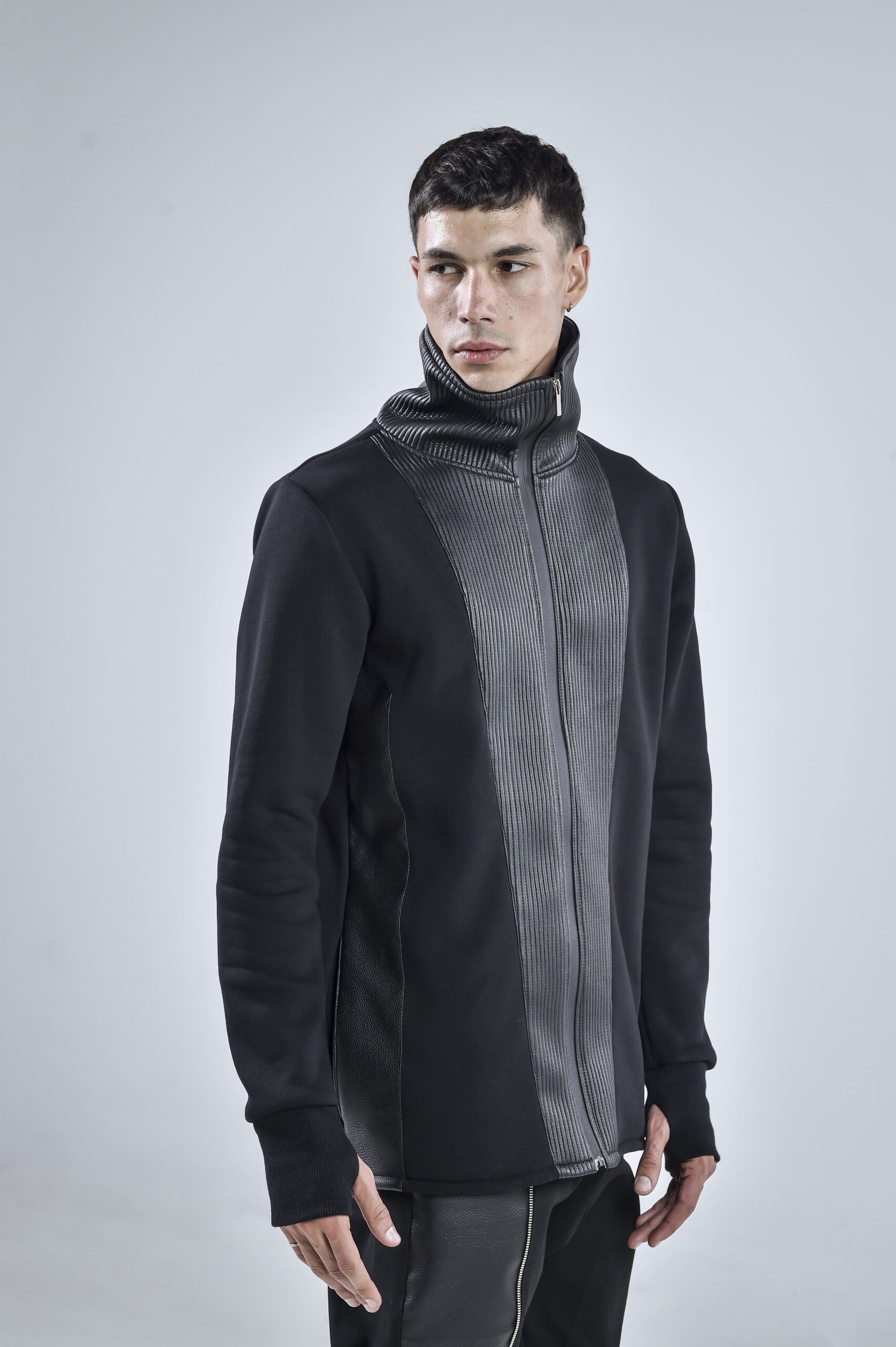 The high collar design provides both protection and a striking visual statement, while the sleek vertical faux leather panels add depth, structure, and a futuristic silhouette. Designed for comfort and durability, the Quasar Jacket features hidden side pockets for practicality without compromising the clean aesthetic.