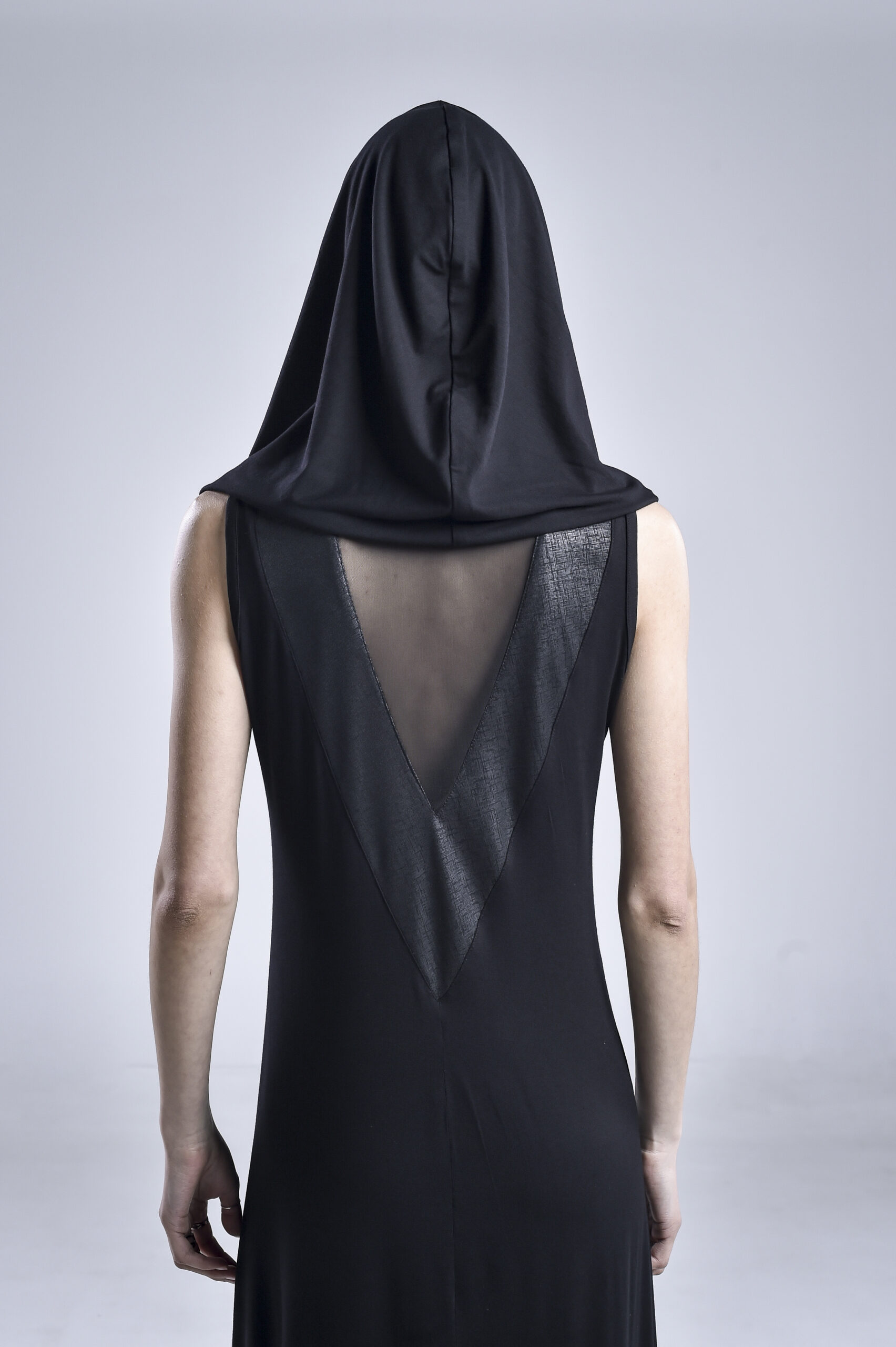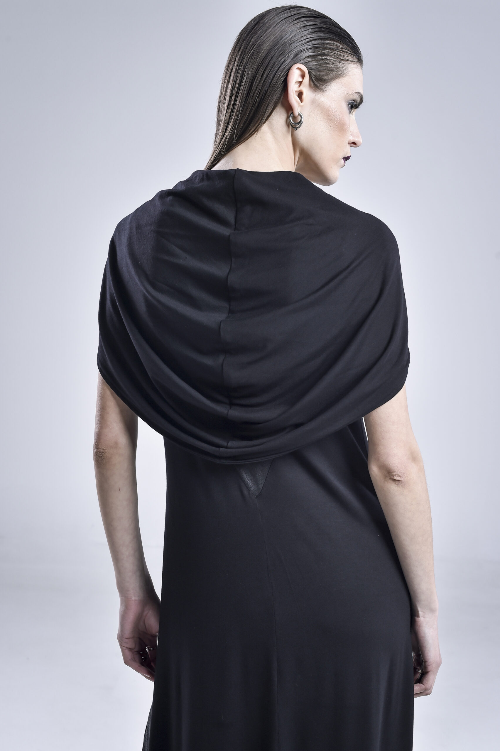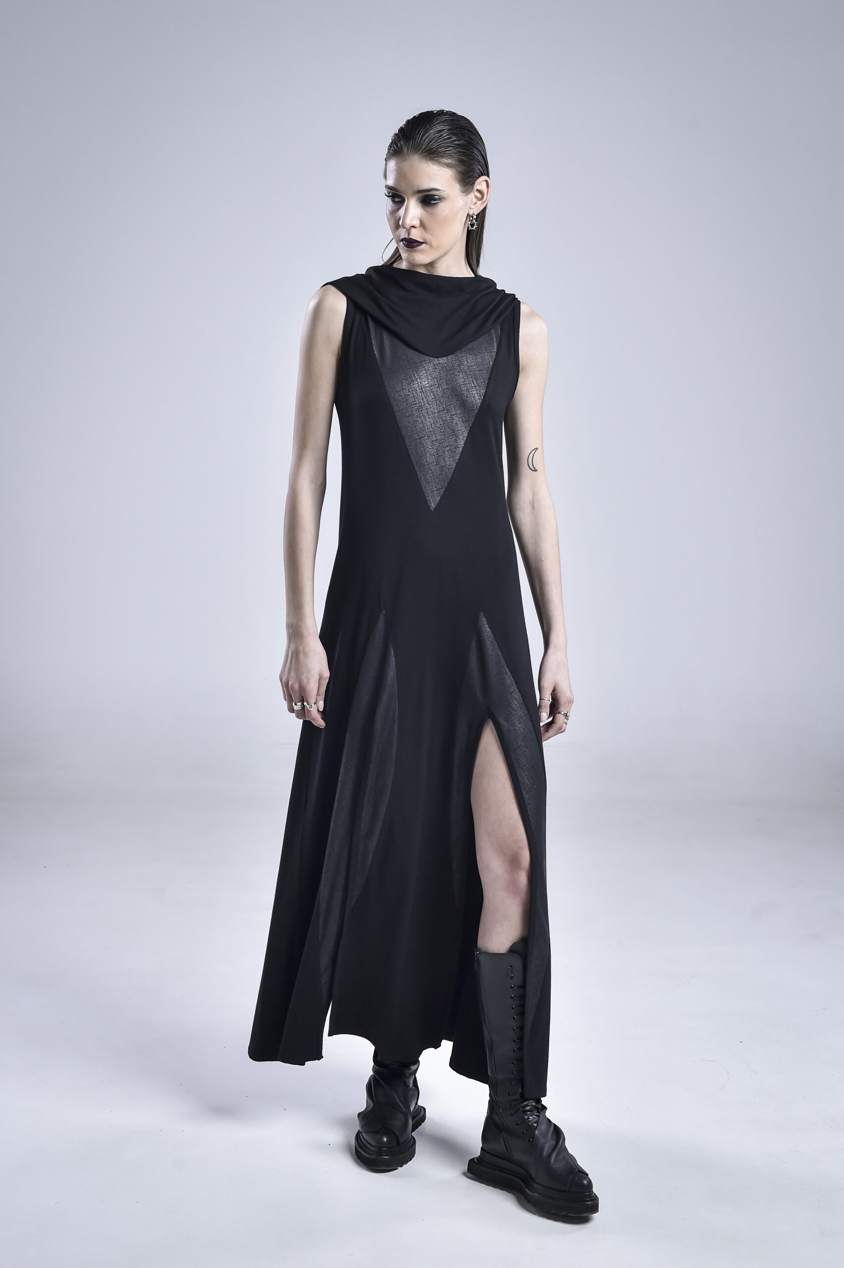 The Resurge Dress captures the essence of avant-garde design with a super unique and bold aesthetic. This sleeveless long dress combines viscose and georgette in contrasting patterns, creating a striking visual. The oversized, loose hood falls dramatically over the shoulders, transforming the dress into an ever-evolving design.