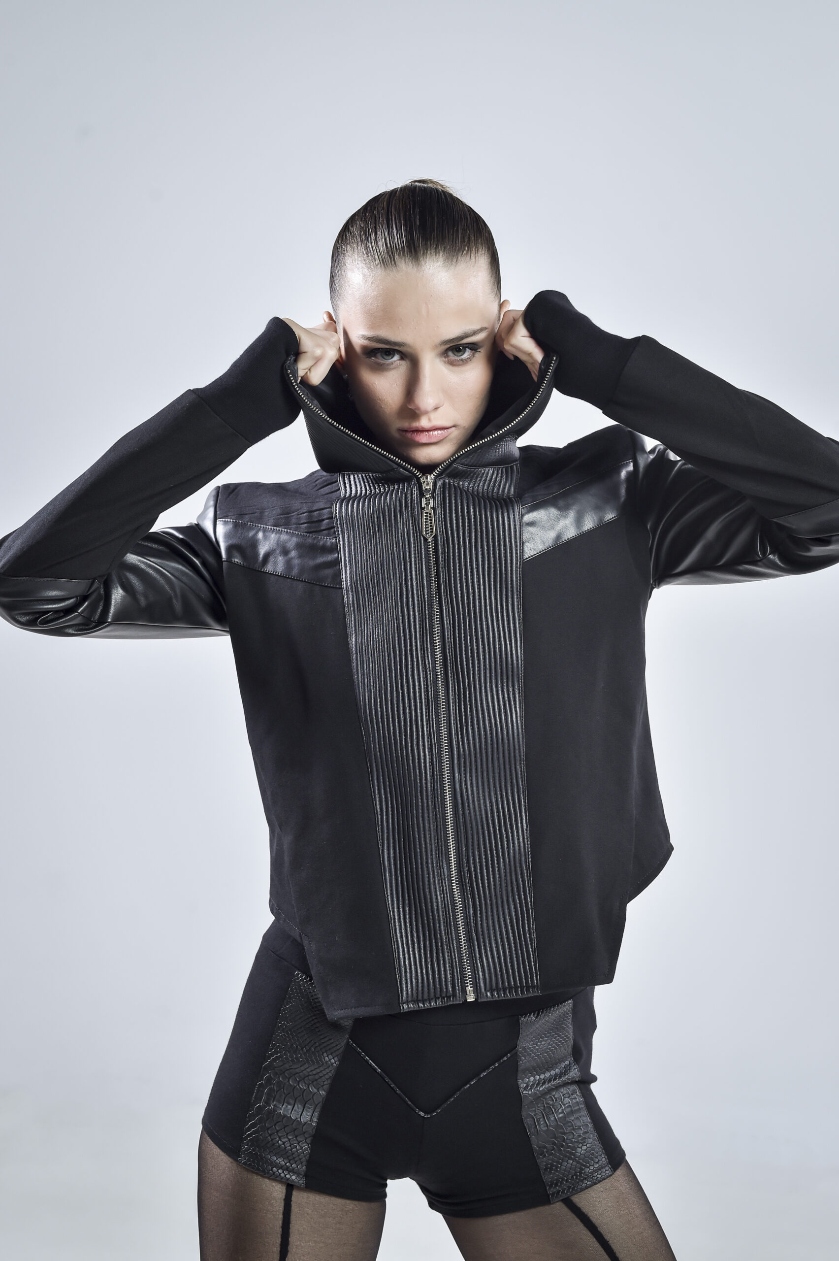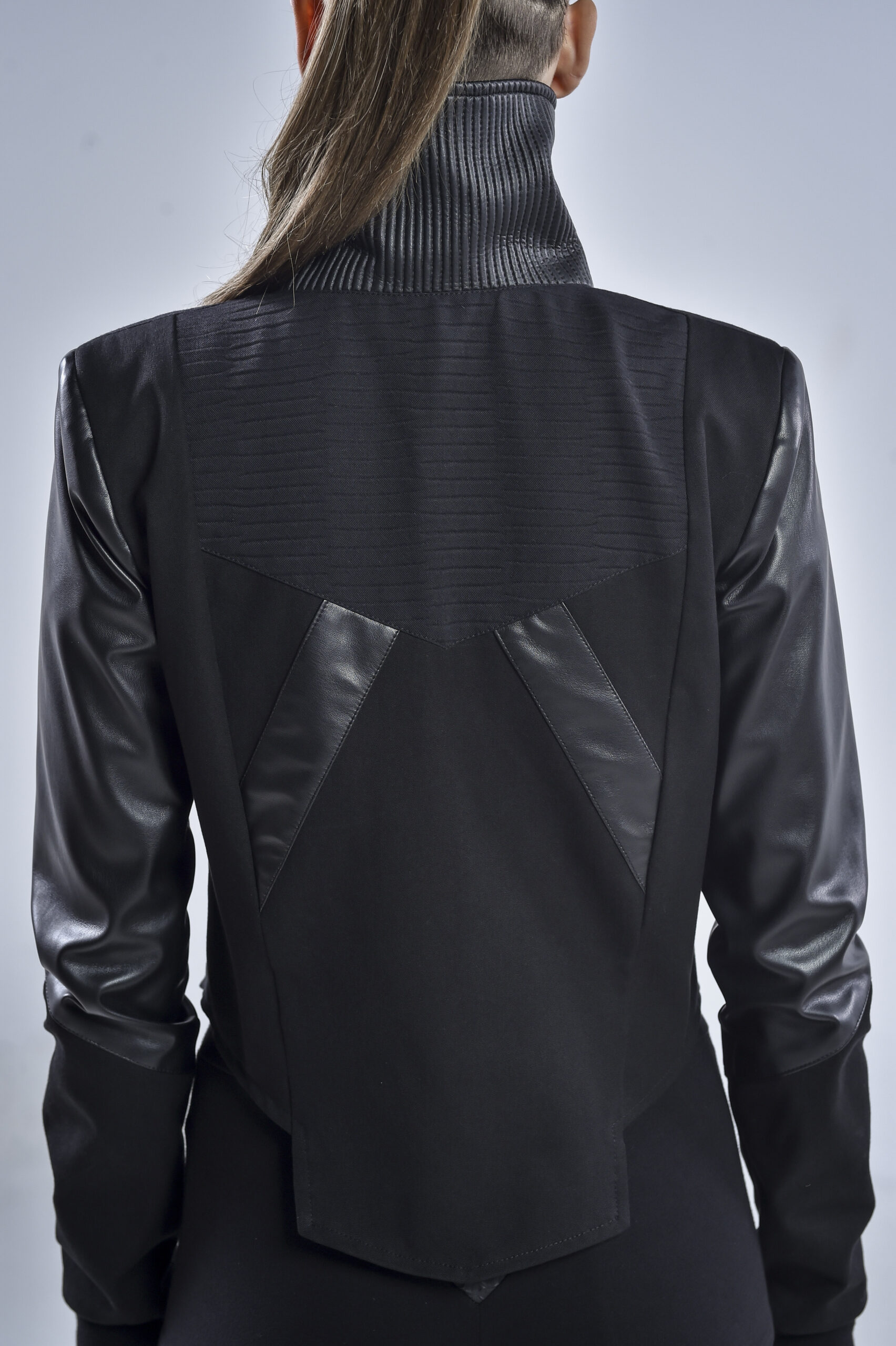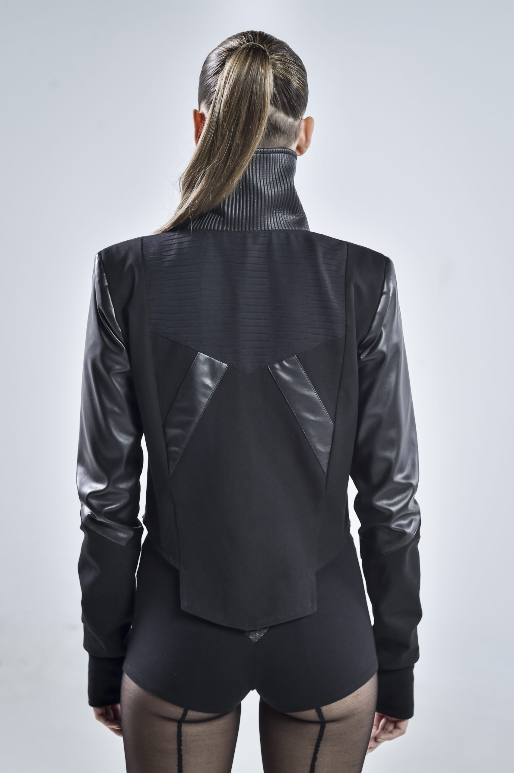 The Silent Orbit Jacket is where black fashion meets futuristic clothing design. Made from premium gabardine fabric and finished with bold faux leather details, this women’s black jacket embodies the essence of techwear and dystopian clothing — structured, sleek, and effortlessly powerful.