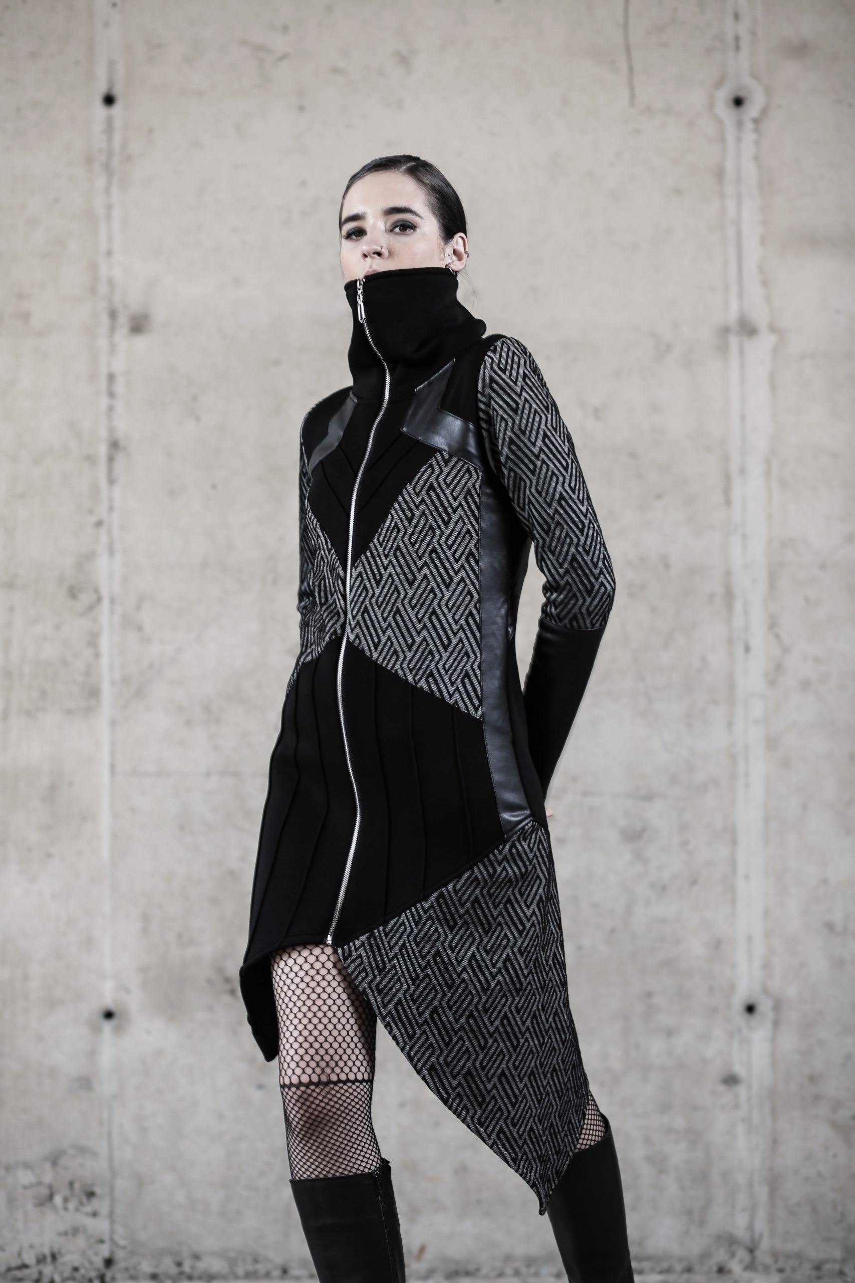 The high collar and zipper closure add an edgy touch to this one-of-a-kind piece. With a comfortable lining and an asymmetric design, this jacket is the embodiment of avant-garde style, making it perfect for those who seek to push the boundaries of contemporary fashion. No pockets.