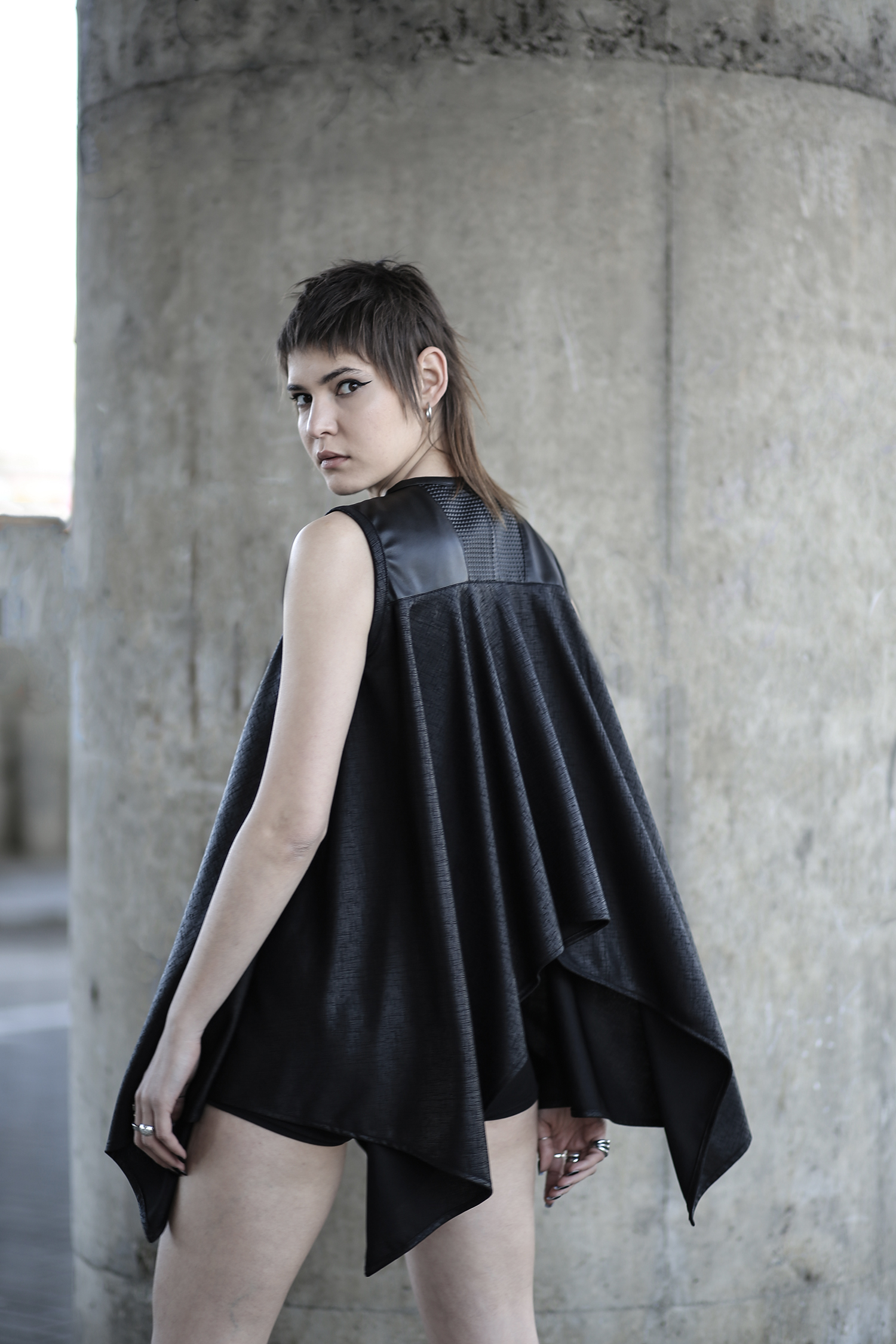 Georgette asymmetric loose tunic designed with faux leather. Light to wear.
