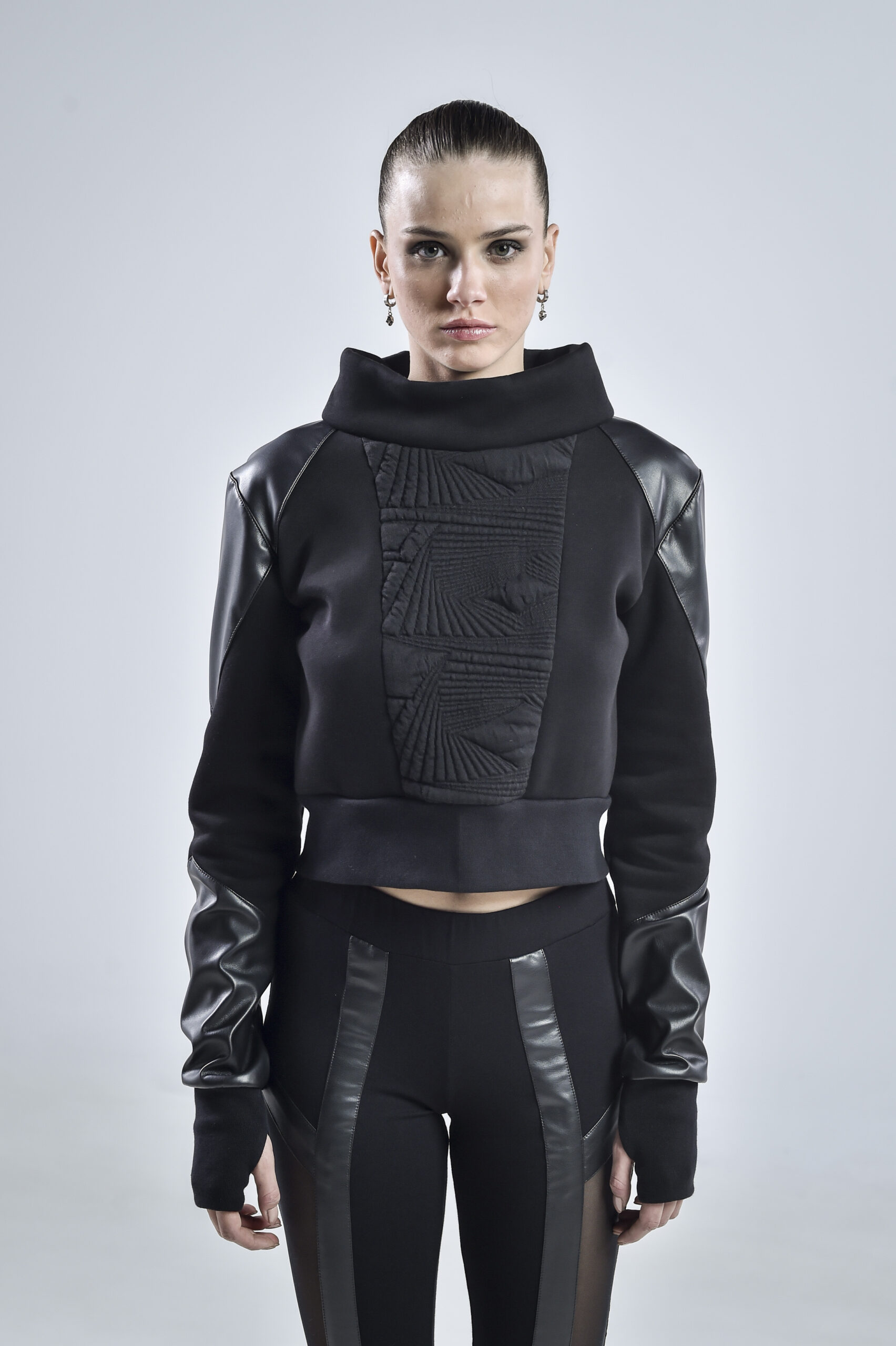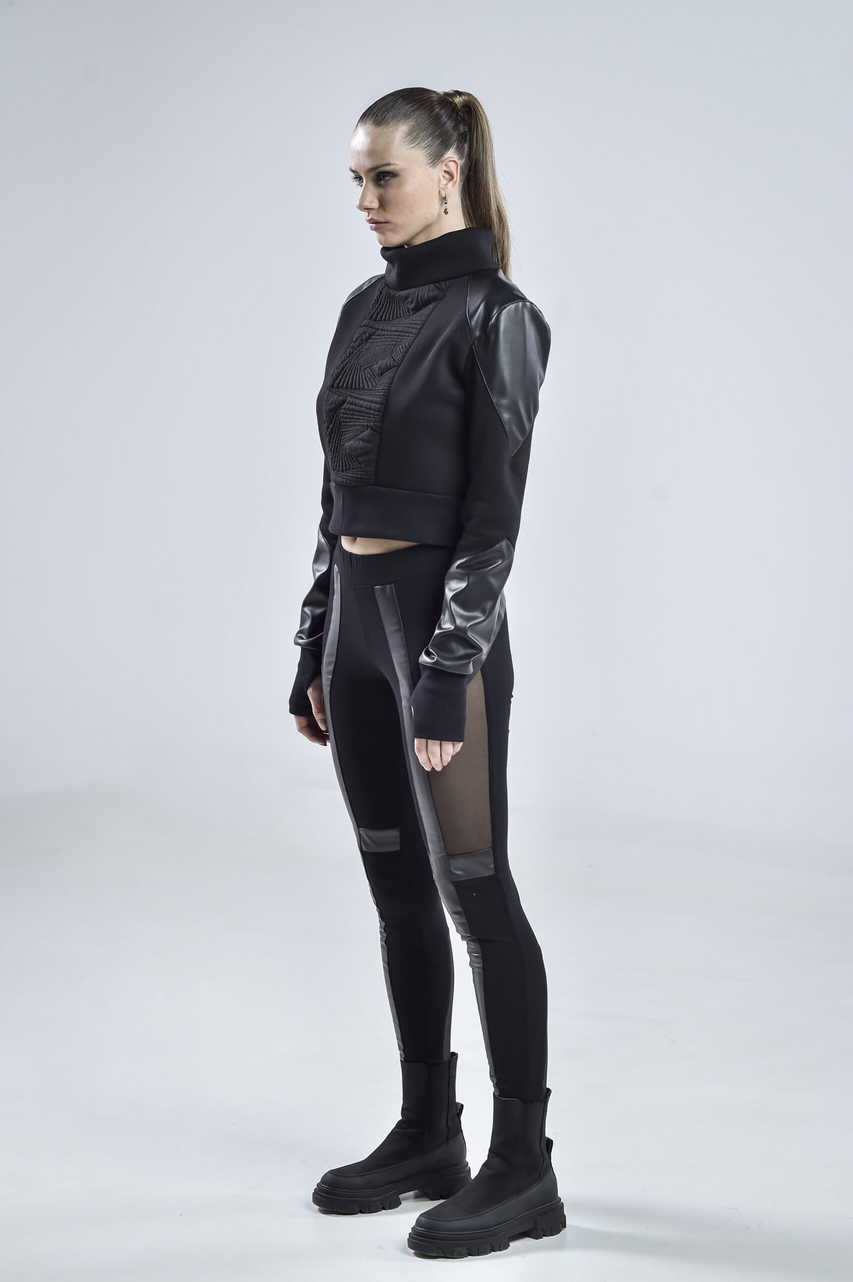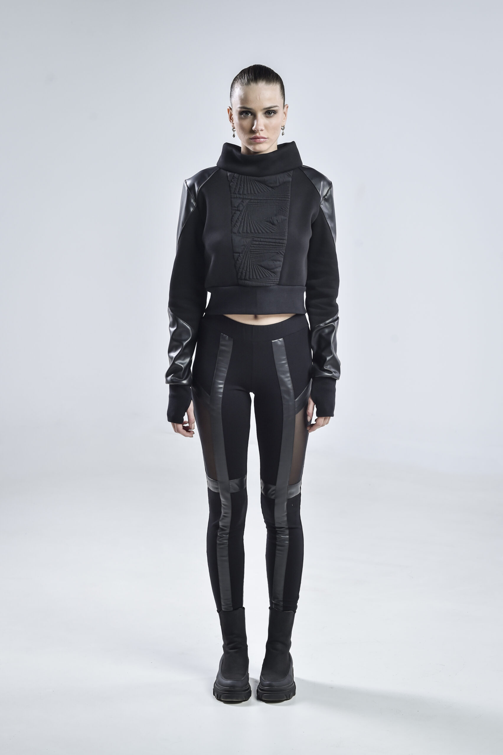 Redefine modern street style with the Umbra Pullover, a bold piece blending structure, texture, and edge. Made from thick cotton and detailed with faux leather panels, this black women’s crop pullover delivers a futuristic, dystopian aesthetic with a focus on form and functionality.