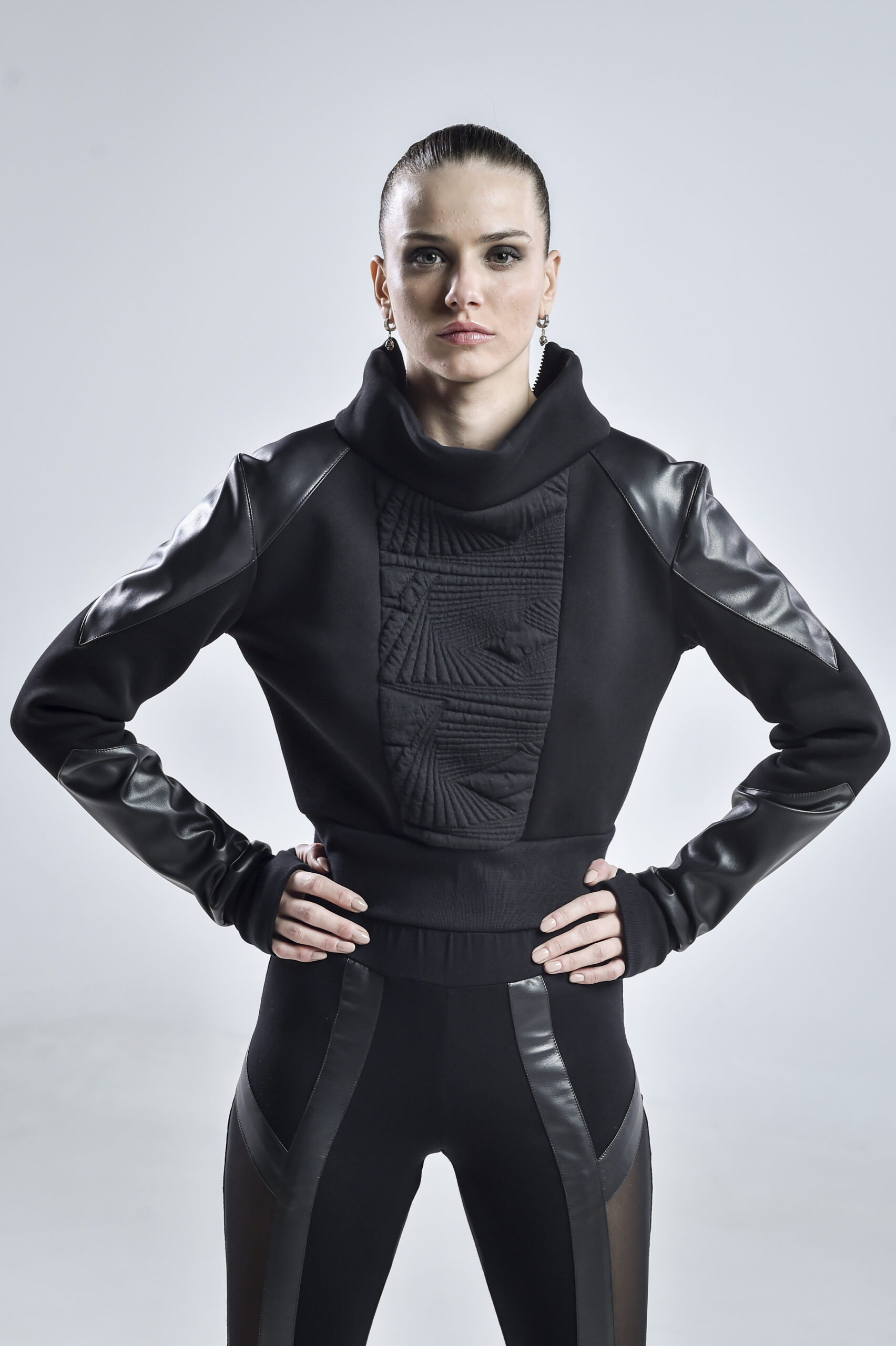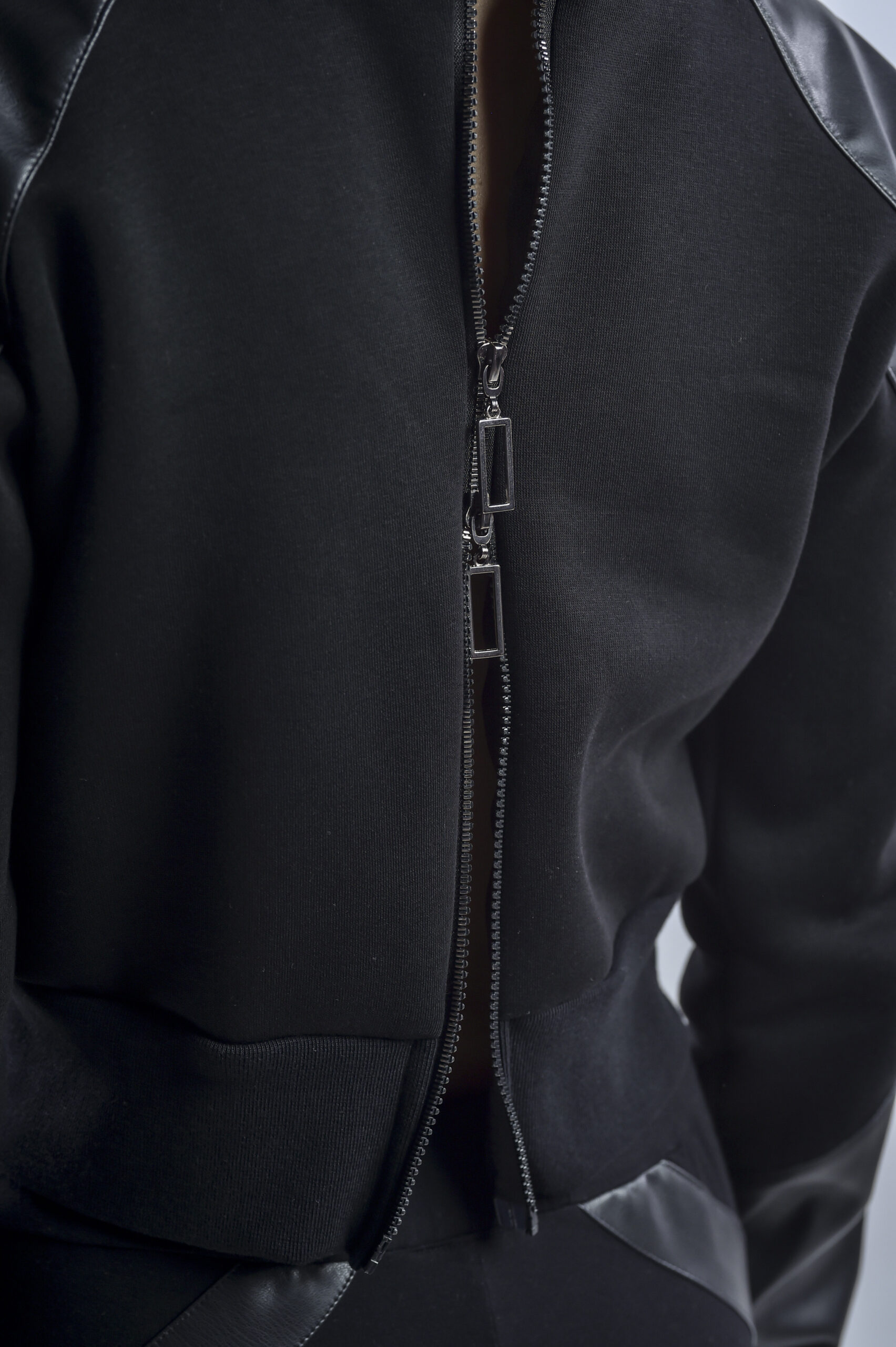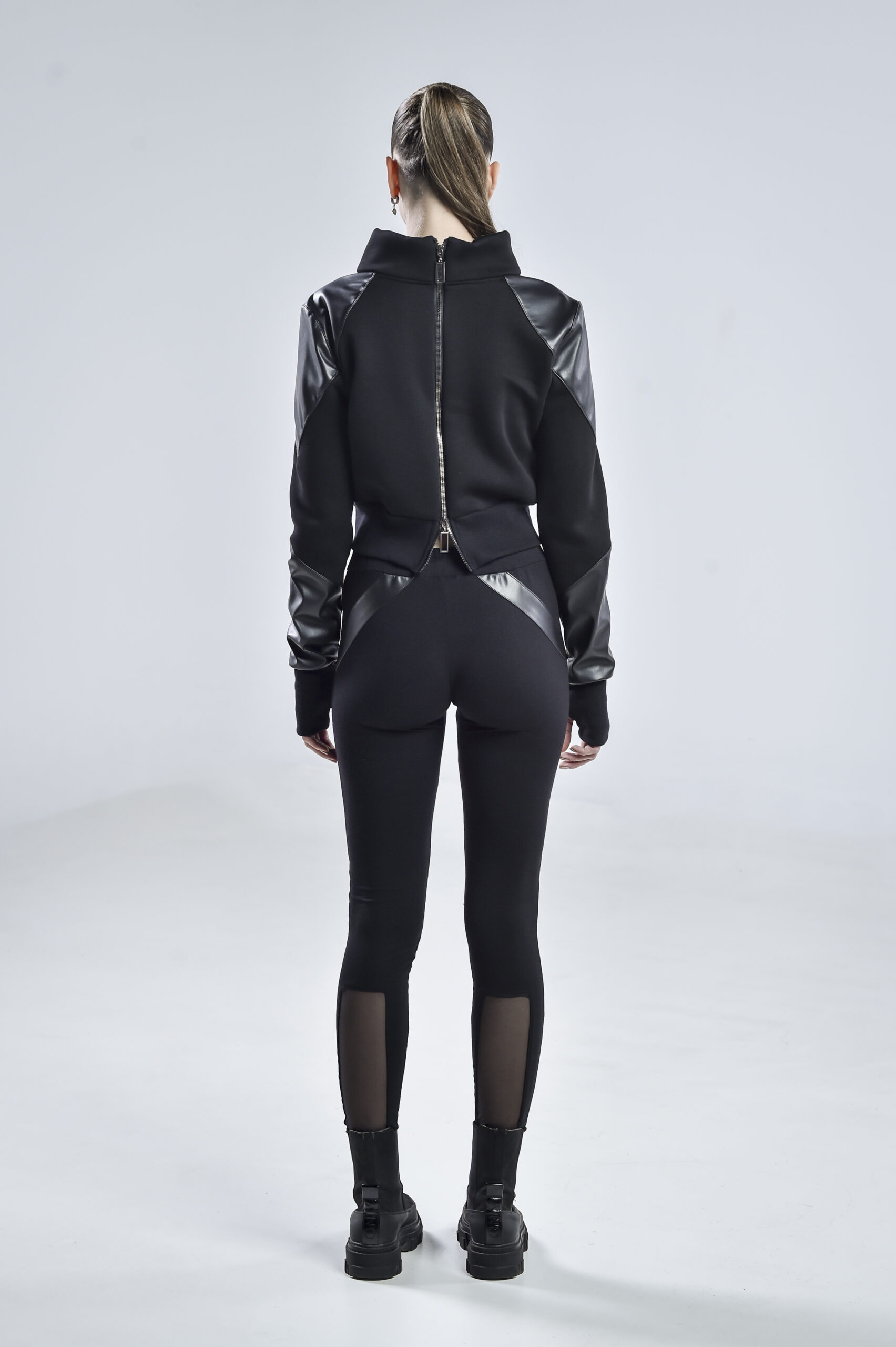 Redefine modern street style with the Umbra Pullover, a bold piece blending structure, texture, and edge. Made from thick cotton and detailed with faux leather panels, this black women’s crop pullover delivers a futuristic, dystopian aesthetic with a focus on form and functionality.